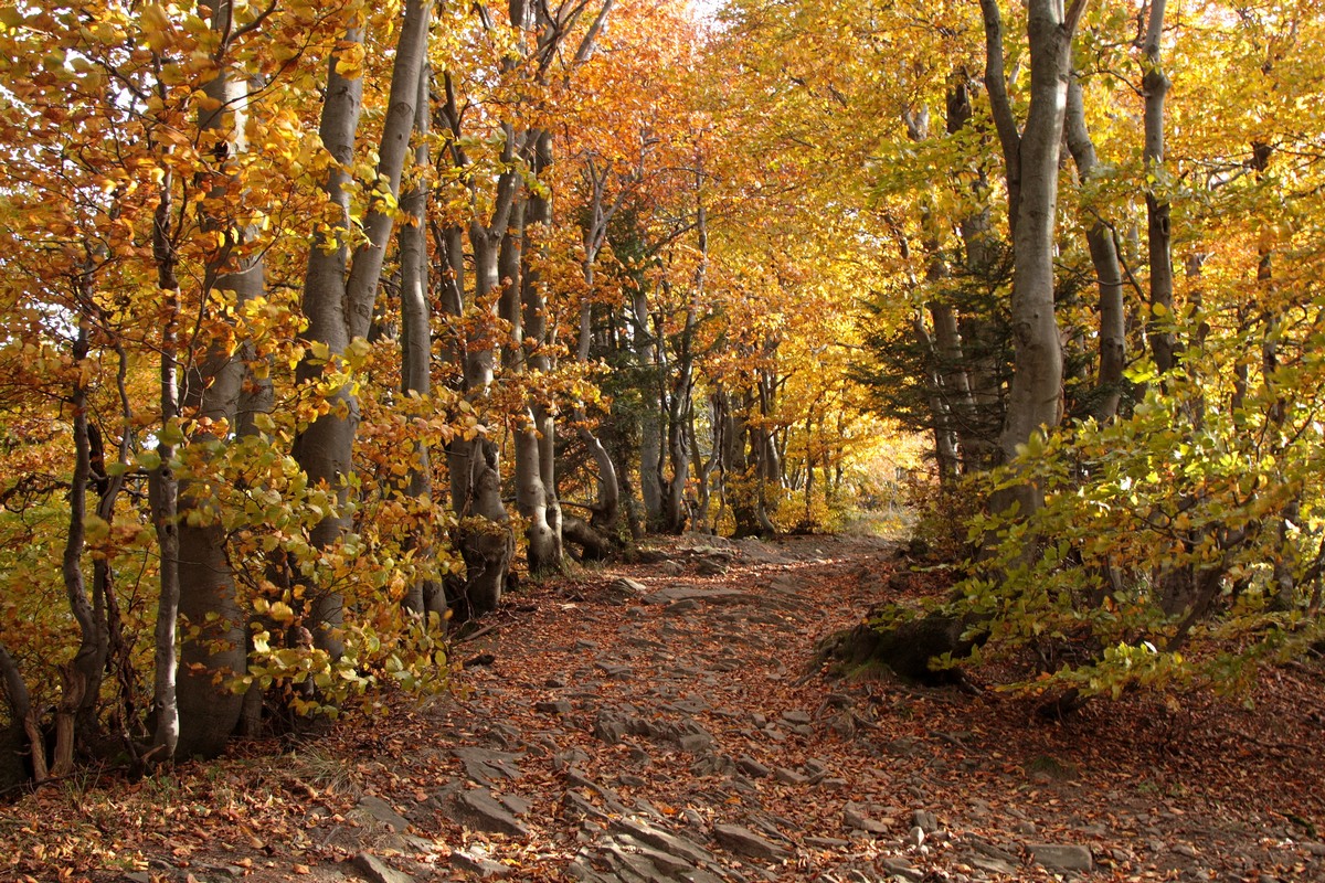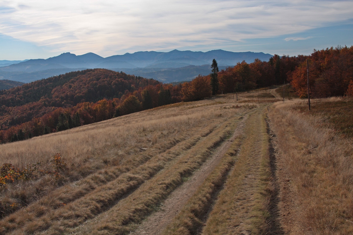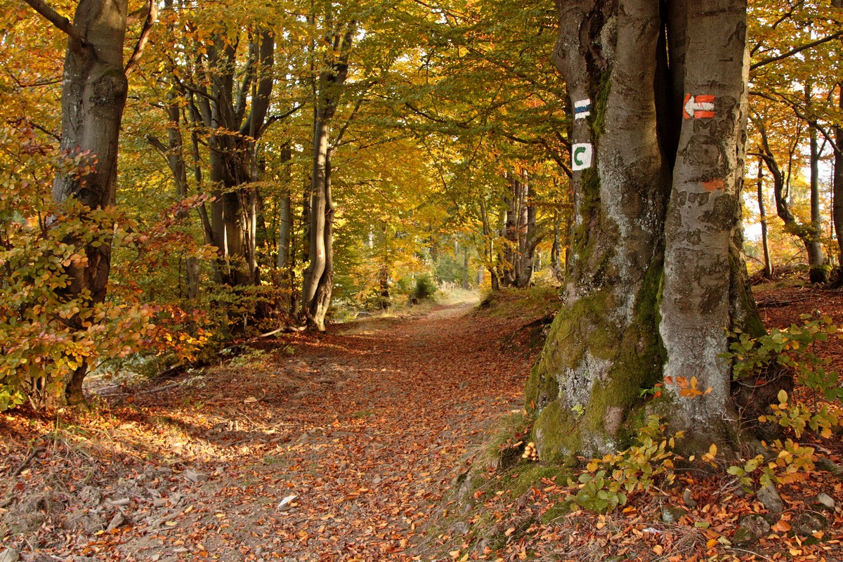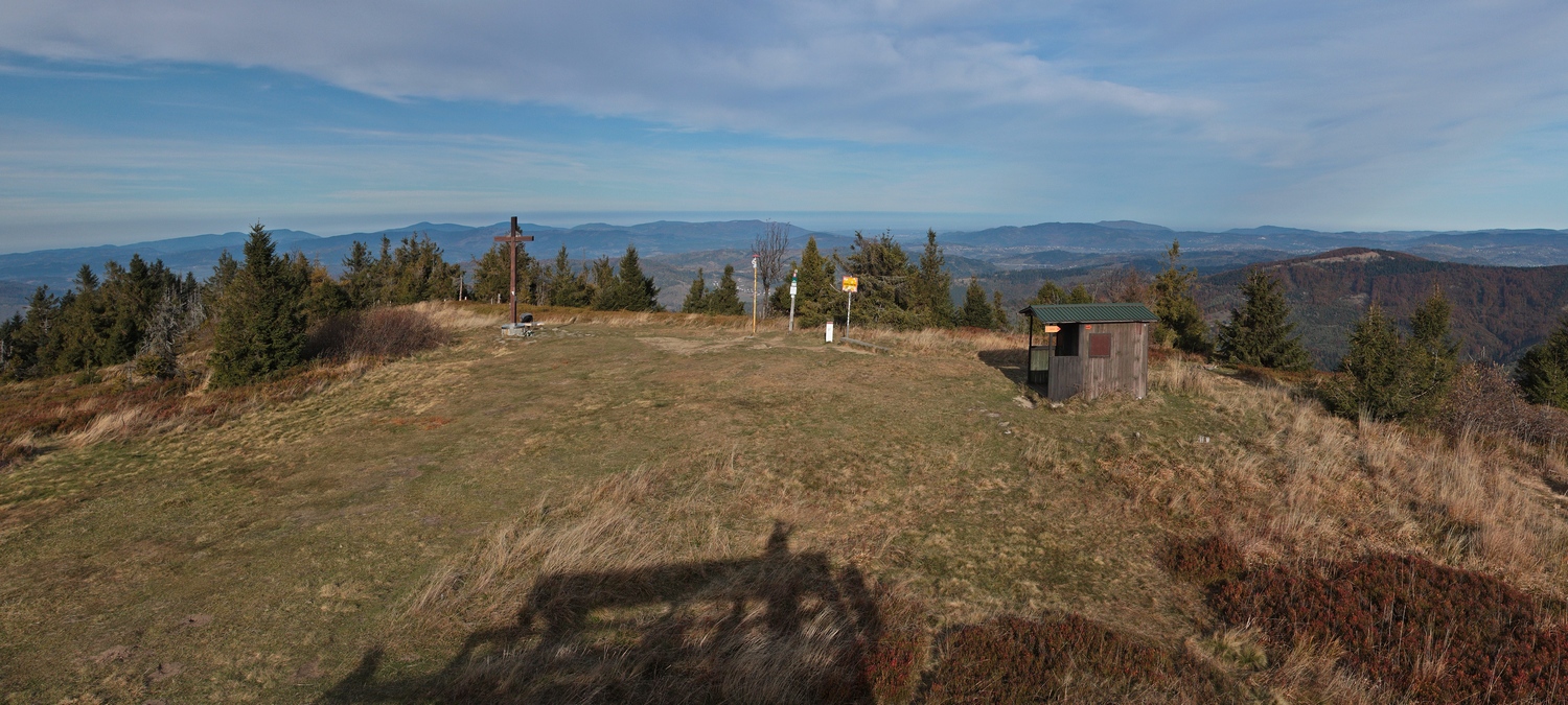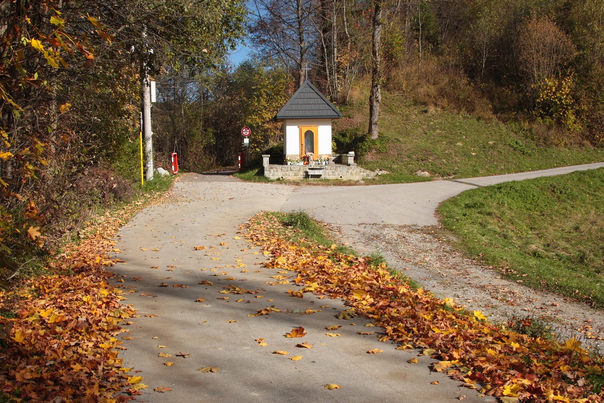 Po krátkej pauze zbieham skratkou dole k smerovníku Fuskovci a naspäť k Bystrickej cyklomagistrále, spájajúcej Krásno nad Kysucou a Novú Bystricu (viac TU ). Medzi bufetmi Slezáčik a Cykláčik pokračujem po jej telese. Potom už sledujem zelenú turistickú značku a strmým stúpaním naberám výškové metre do sedla Korcháň. Krátka pauza v miestnom prístrešku a bez nejakého zdržovania sa hrebeňom po červenej značke prehupnem cez Bartkov kopec. Za ním ma prekvapí neľudské klesanie naprieč všetkými vrstevnicami až do sedla Rovne. Tu v turistickom prístrešku neďaleko kaplnky Panny Márie si fúkam preťažené kolená. Nachádza sa tu aj prameň, ale počas tejto suchej jesene ledva kvapká.
