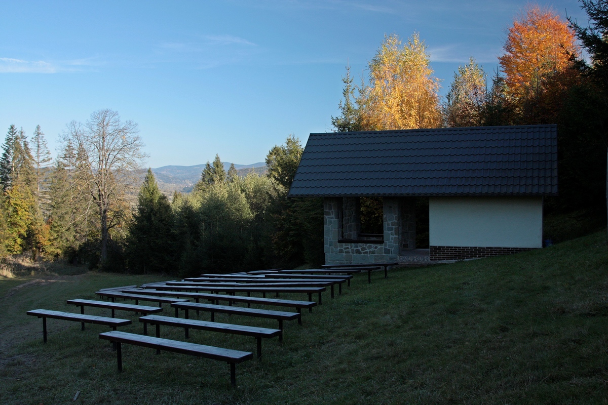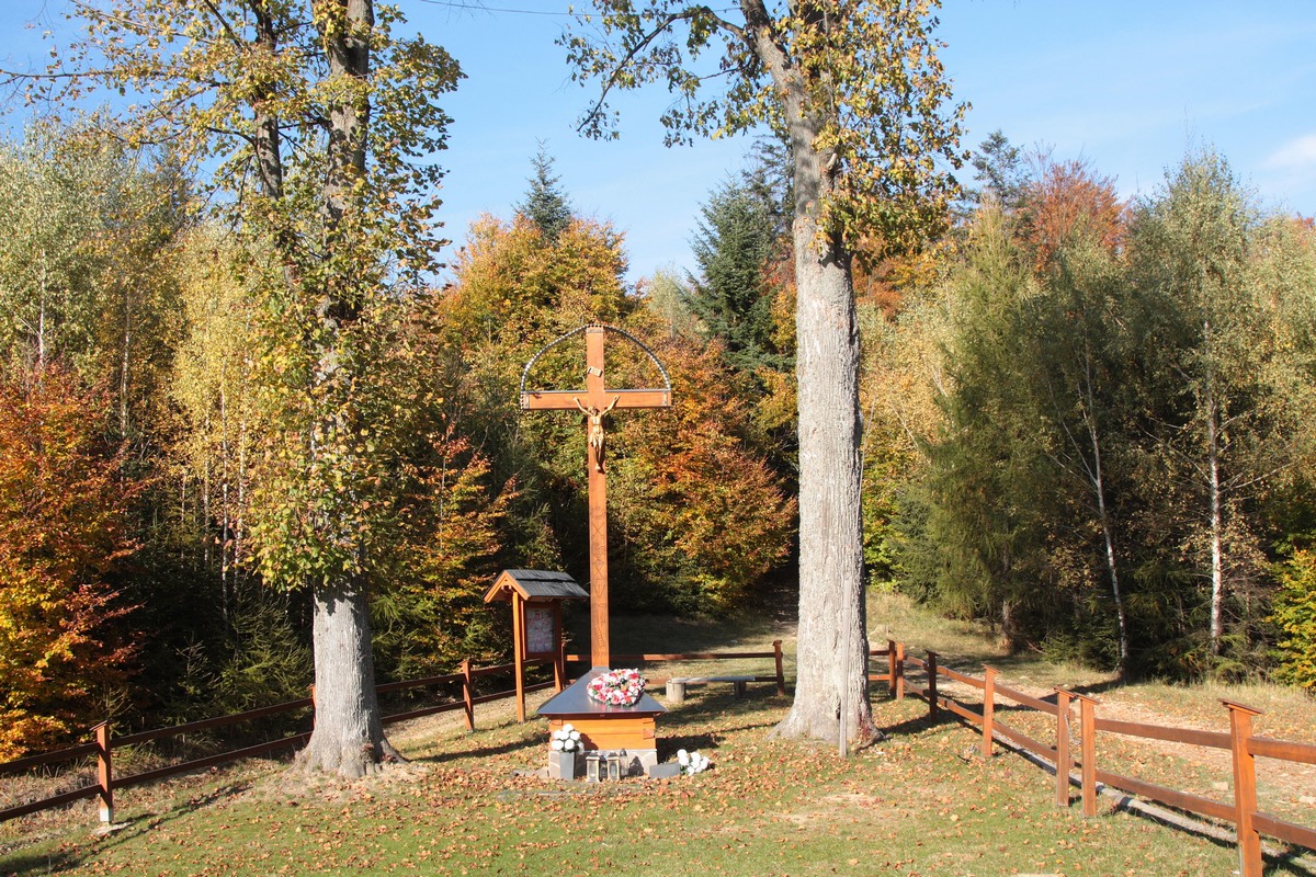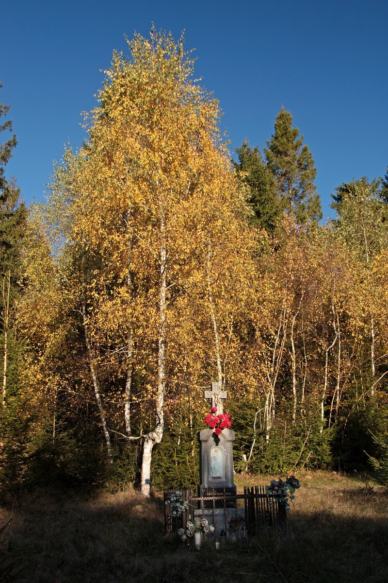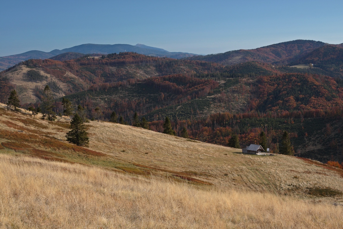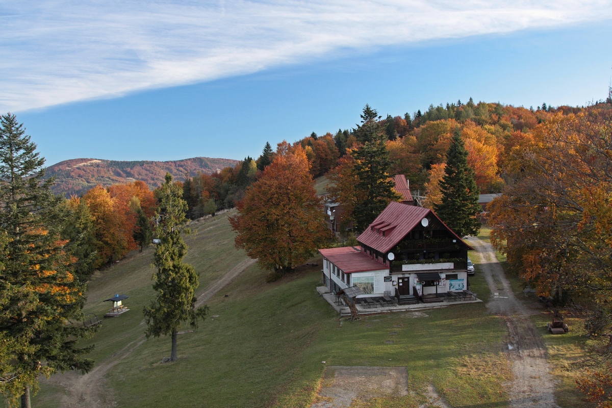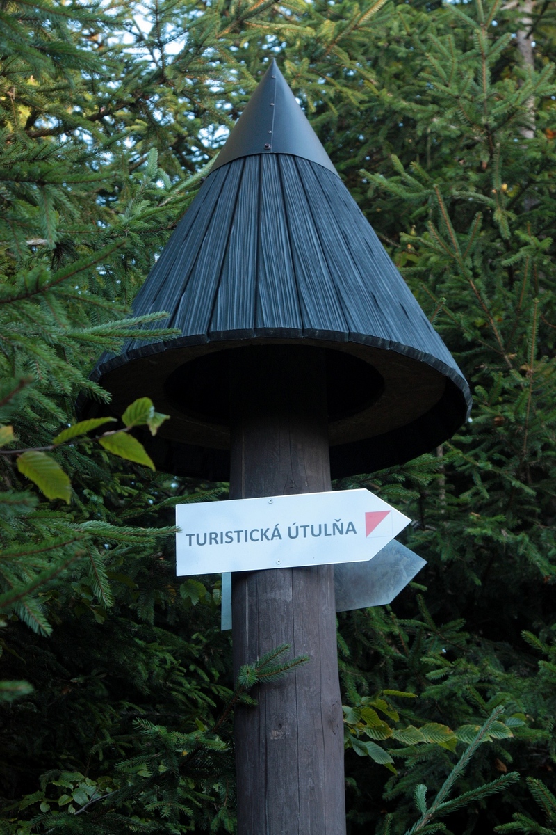 Kúsok poniže pri kríži pod Hladkým vrchom sa môžem rozhodnúť, či do doliny zbehnem zelenou do Zborova nad Bystricou, červenou do Krásna nad Kysucou alebo miestnym značením do Dunajova. Času do zotmenia mám ešte dosť, tak ostávam verná červenej. Tá ma vedie už prevažne klesaním, krásnym farebným lesom, v ktorom zbieram pozostatky hubárskej sezóny. Na vyznačenej odbočke sa ešte nechám zlákať na prieskum útulne a na moju radosť objavujem rovnakú chalúpkovitú stavbu ako nad osadou u Grapov na protiľahlej strane Kysuce. Schovaná na okraji lesa pôsobí skoro ako fatamorgána.