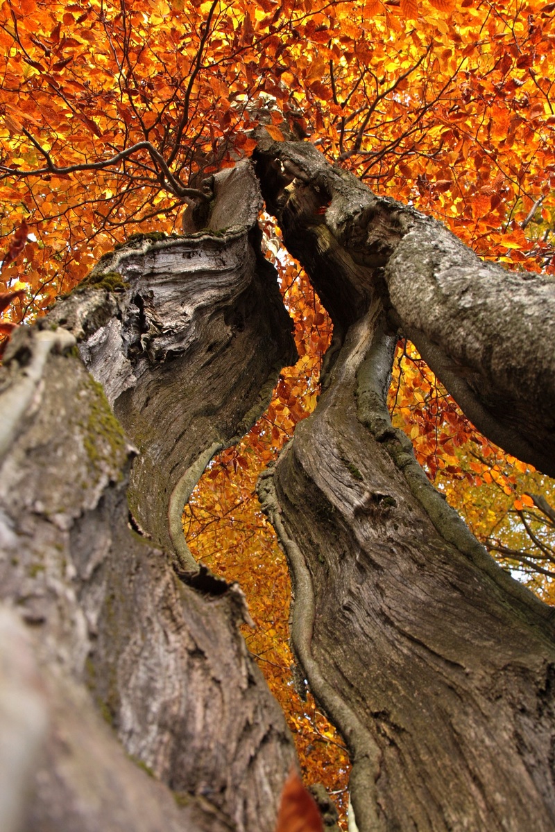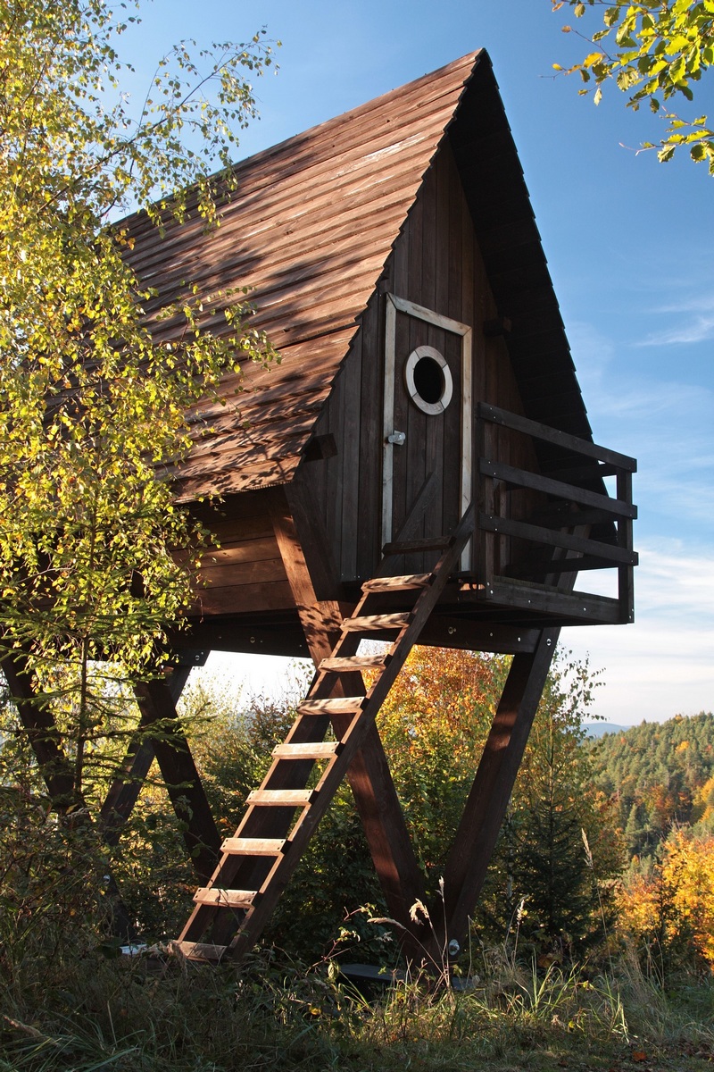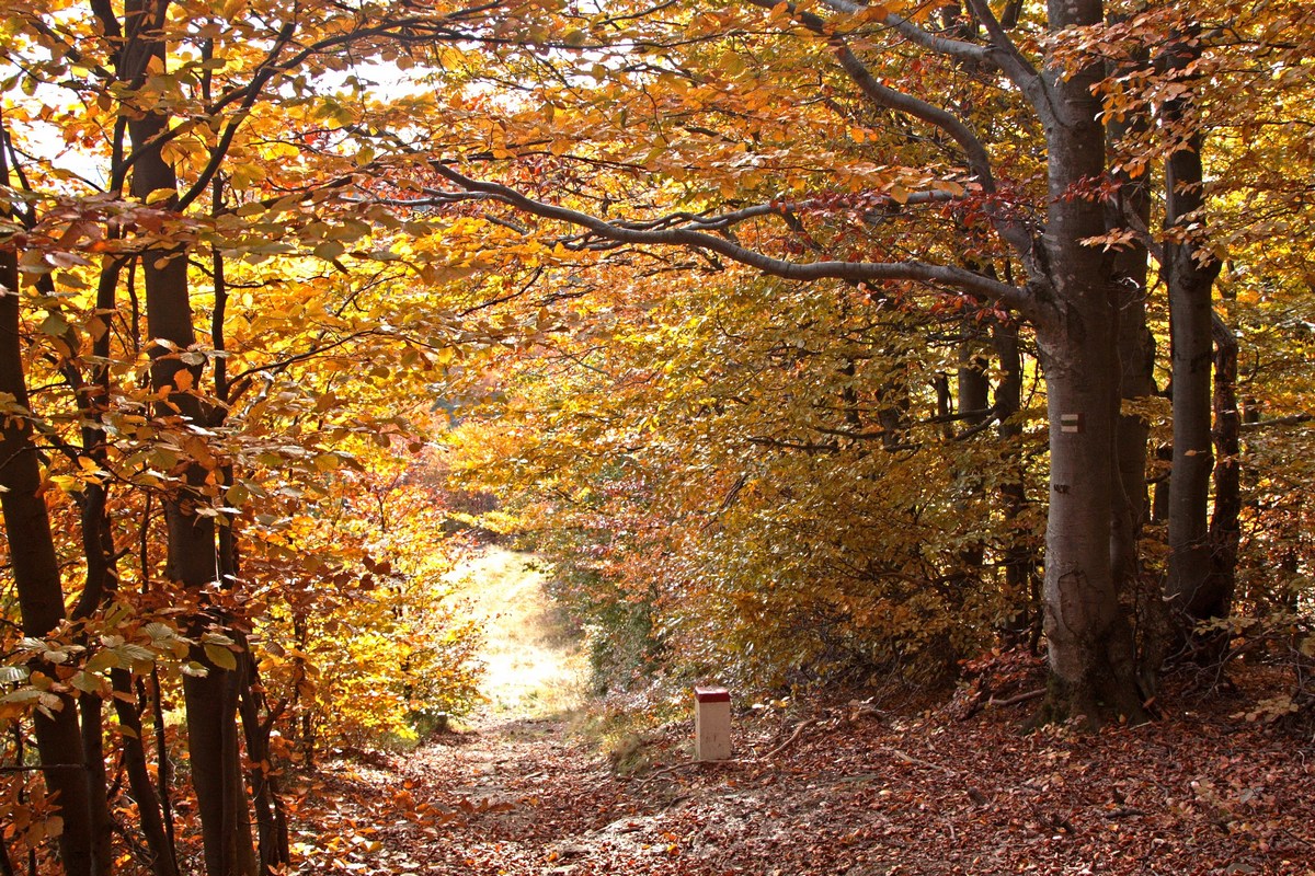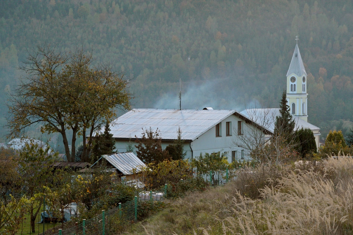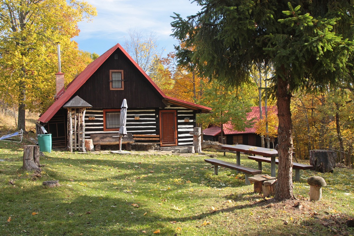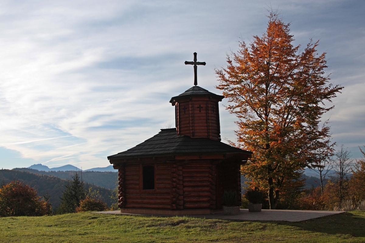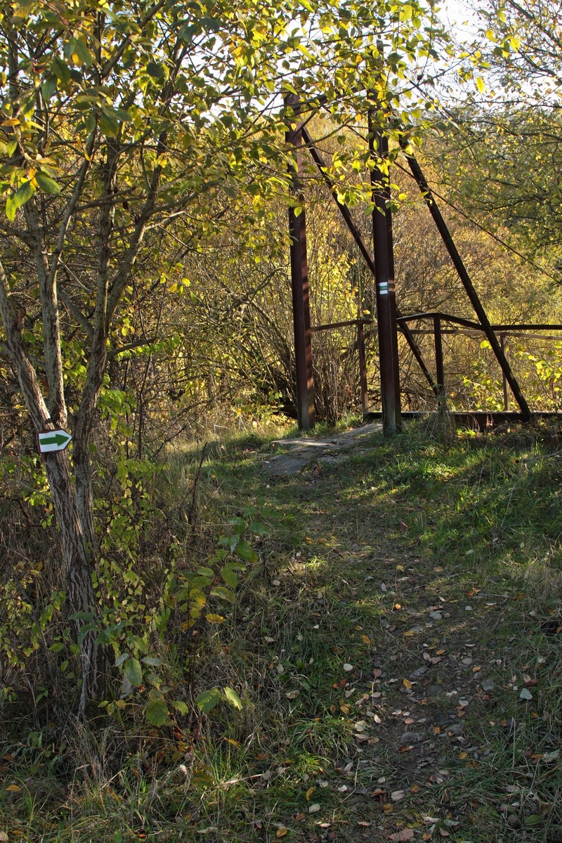 Kúsok poniže pri kríži pod Hladkým vrchom sa môžem rozhodnúť, či do doliny zbehnem zelenou do Zborova nad Bystricou, červenou do Krásna nad Kysucou alebo miestnym značením do Dunajova. Času do zotmenia mám ešte dosť, tak ostávam verná červenej. Tá ma vedie už prevažne klesaním, krásnym farebným lesom, v ktorom zbieram pozostatky hubárskej sezóny. Na vyznačenej odbočke sa ešte nechám zlákať na prieskum útulne a na moju radosť objavujem rovnakú chalúpkovitú stavbu ako nad osadou u Grapov na protiľahlej strane Kysuce. Schovaná na okraji lesa pôsobí skoro ako fatamorgána.