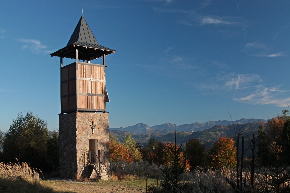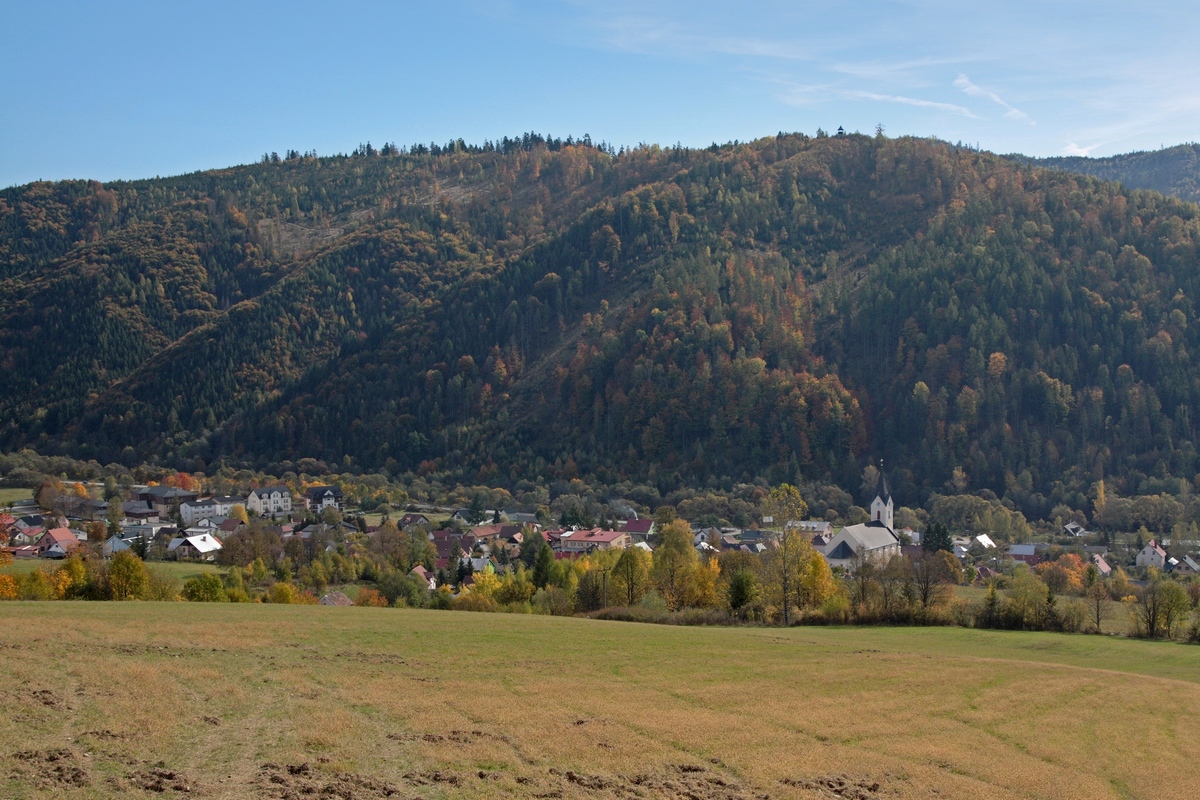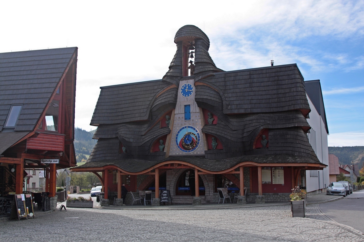 Odtiaľto ma čaká výraznejšie klesanie cez Malú Raču a popod Orol do doliny Bystrice. Na hrebeni si ešte vychutnávam slnkom vyhriate výhľadové lúky, kým ma neskôr pohltia nekonečné zvážnice cez mladé lesné porasty, ktoré ma vypľujú až tesne nad dedinou Stará Bystrica. Jej centrum je známe najmä jediným slovenským orlojom. Stavba je označovaná ako najväčšia drevená socha na Slovensku a údajne predstavuje štylizovanú podobu sediacej Madony. Na prvý pohľad zaujme tvarovanou šindľovou strechou a šiestimi bronzovými plastikami slovenských dejateľov, ktoré lemujú výrazný astronomický ciferník, astroláb (viac TU ). Každú hodinu sa za zvuku zvonov v priezore nad astrolábom objavujú sochy svätých, spojených so Slovenskom. Ja však nemôžem čakať na toto divadlo, pretože ma už na protiľahlom kopci láka ďalšia rozhľadňa.