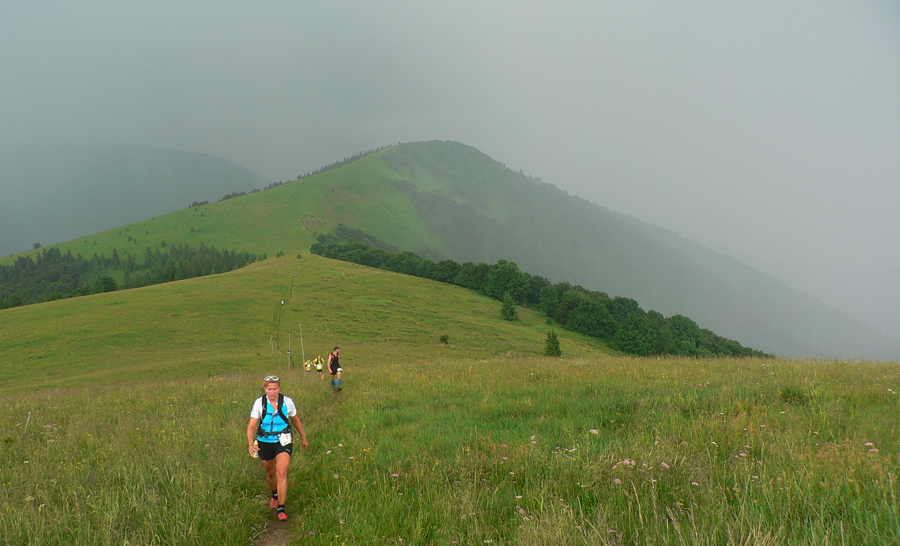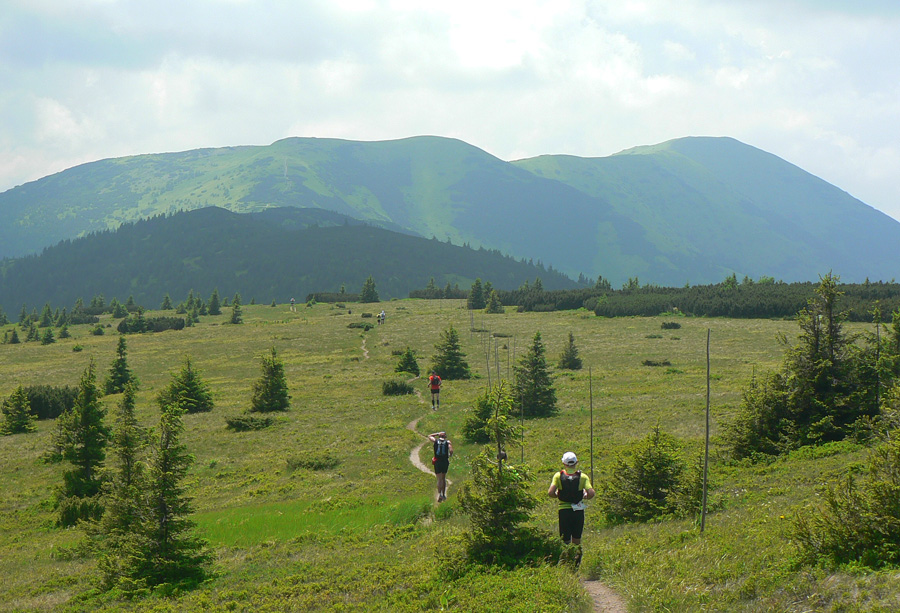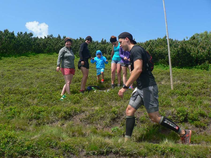 Nezávidel som borcom ani borkám, stúpajúcim po štarte (9:30) k Štefáničke, lebo v doline bolo fakt na zadusenie. Až hore nad lesom sa oprel čerstvý južný vietor a začalo byť príjemnejšie. Na Kamienku za hodinu aj dáke drobné dorazili prví asi piati v takej minúte-dvoch a za nimi sa to trúsilo pekne rovnomerne rozťahané, v podstate až do cieľa. Niektorí (Liptovská Lúžna, že? Pozdravujeme!) mali svoje vlastné fankluby, ale tie najvernejšie fanynky (muchy) nemali až po Skalku vďaka vetru žiadnu šancu. Potom na lúkach pod Košariskom si to tí rýchlejší vraj vychutnali naplno - počasie ako v skleníku. Tým pomalším už sa tam nad hlavami zbierali búrkové mraky.