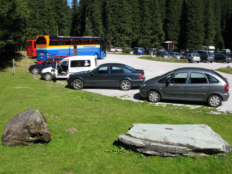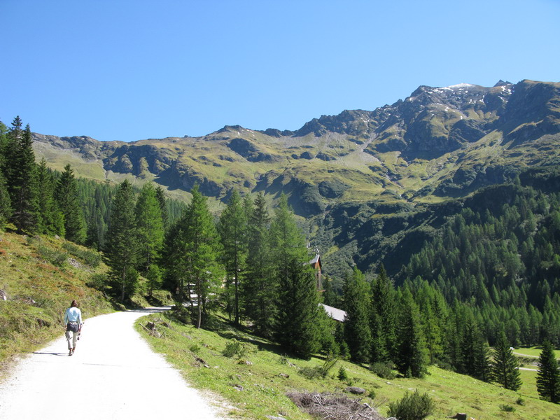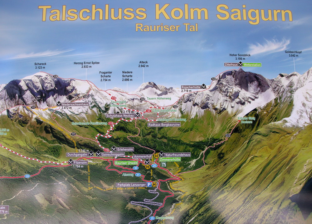 Vzhľadom na pokročilý čas neváhame a pokračujeme spoplatnenou cestou na parkovisko Lenzanger 1550m. Plné parkovisko nás v túto peknú septembrovú nedelu neprekvapuje. Ďalej vyrážame peši po štrkovej ceste. Toto miesto, záver doliny má taký trošku divne znejúci názov: Kolm Saigurn. Kedysi sa tu vo veľkom ťažilo zlato, aj dnes si môžu za poplatok nadšenci vyskúšať ako sa ryžuje zlato z potočného piesku.