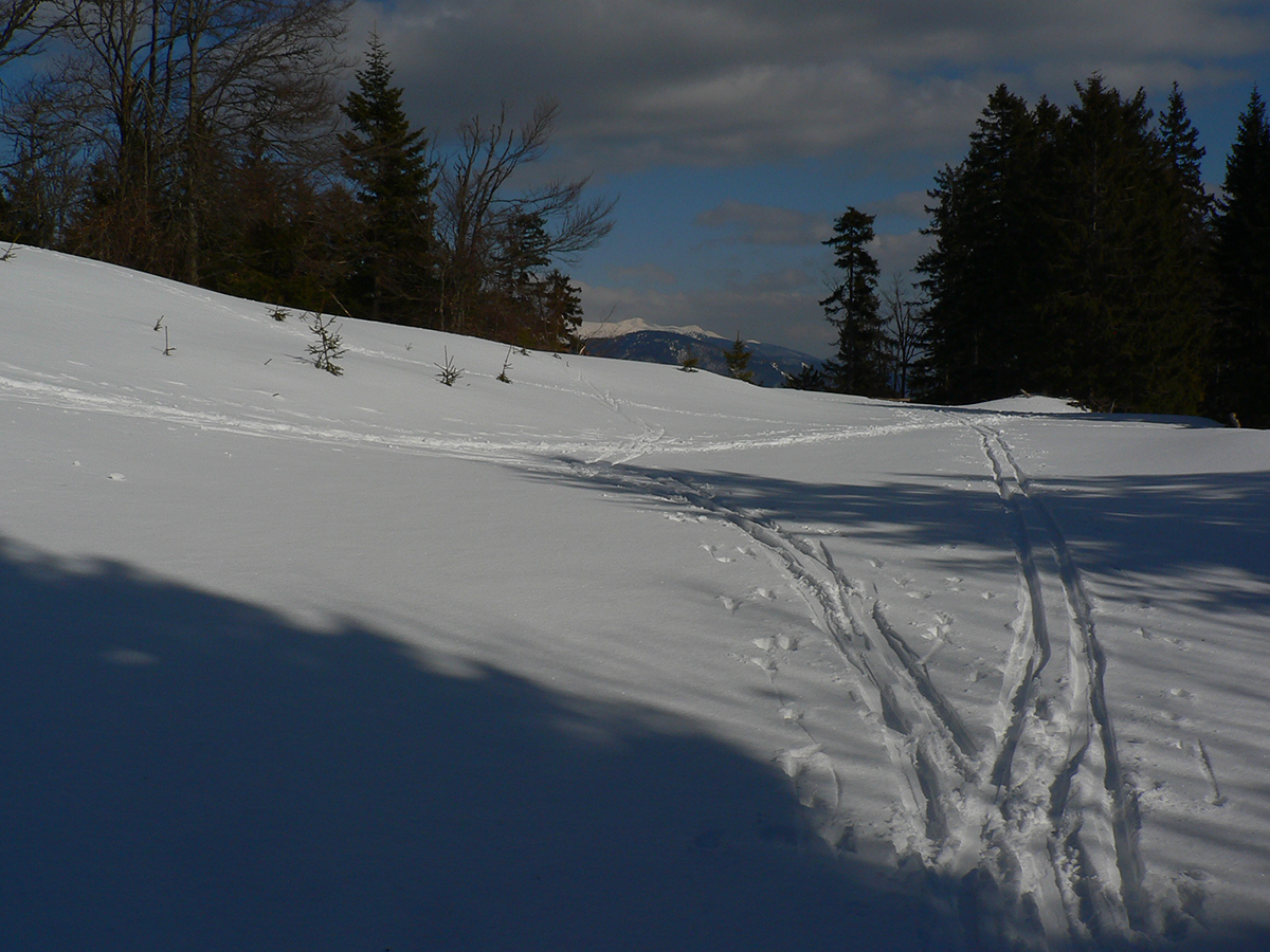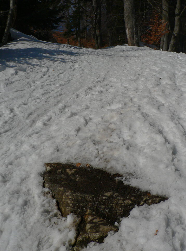 Po žltej (alebo radšej povedľa, lesom) už snehu hoodne ubudlo, ale stále sa dá komfortne, bez veľkého kľučkovania. Od smerovníka Ráztoky už snehu mrte, ale zase žiadna stopa, na chlpato tade už dlhšie nešiel nik. Zato pešia stopa tvrdá ako betón.