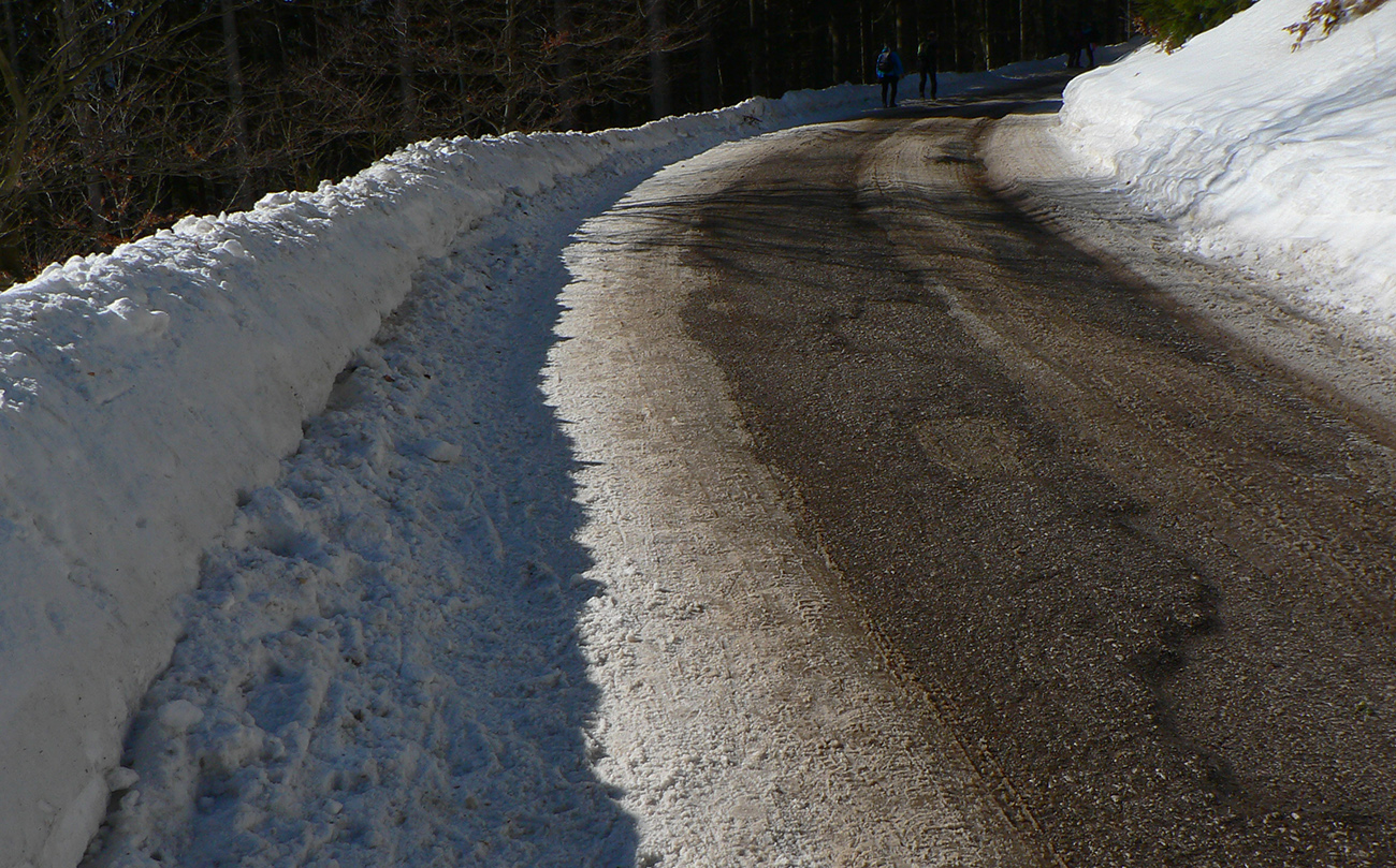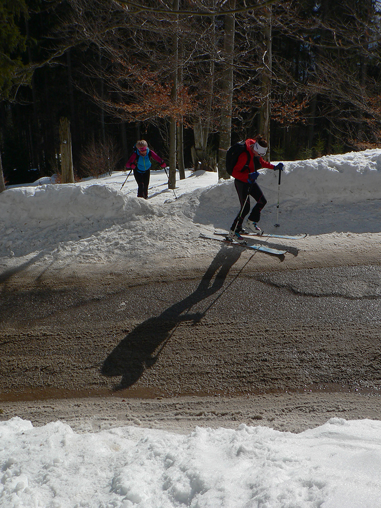 Podmienky sa odspodku postupne vinou denného tepla zhoršujú, ale len pomaličky, lebo v noci to mrzne na kosť a cez deň to (aspoň v tieni) veľmi nepovoľuje. Zo Strání: hneď od mostíka to síce vyzerá, ale radšej treba vyniesť takých 400 m za prvú zákrutu, vystavenú slnku. Tá je ešte celá vytopená, nedá sa to obísť (pod ňou tiež ešte treba na kúsku prenášať). Až nad ňou už pohoda definitívna, to jediné odtopené miesto nad prvou skratkou sa zatiaľ dá obísť. Potom aj vyššie, v tých strmších rovinkách pod delom, kde je síce čistý ľad, ale bez kameňov, sa prejsť dá. Hore aj dole - zatiaľ.