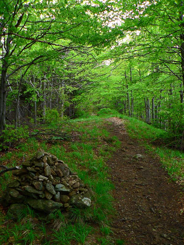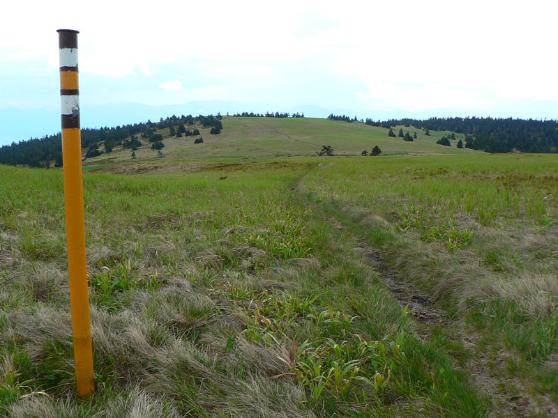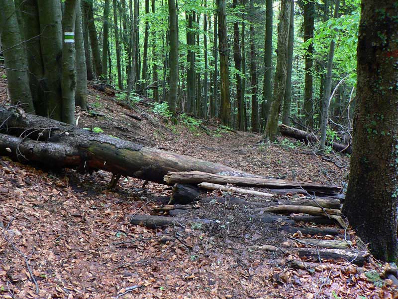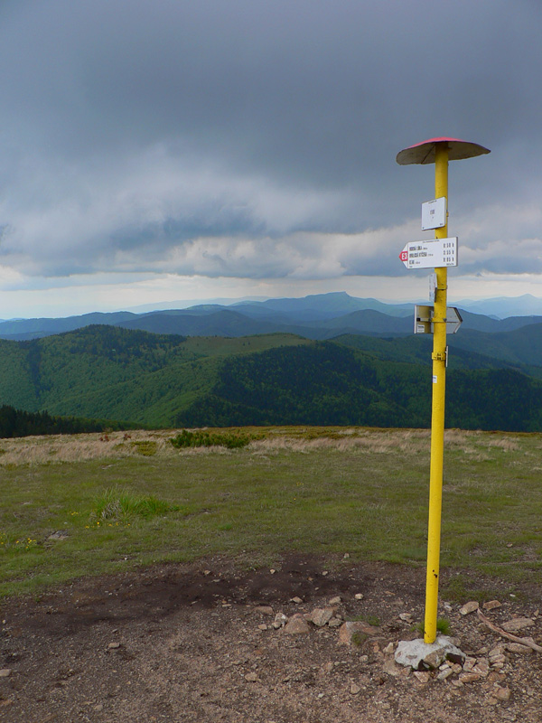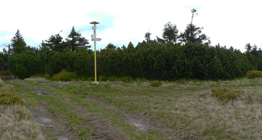 Ale treba ísť - takže o chvíľu už som pri smerovníku na hrebeni. Cestou sa ešte k chodníku pripája lesná cesta z juhu, z Trebostovskej doliny, hneď je jasné kade sa sem na bajku treba vydriapať. Raz som už výjazd sem hľadal, ale zdola a nenašiel som, budem musieť pozornejšie poskúmať.