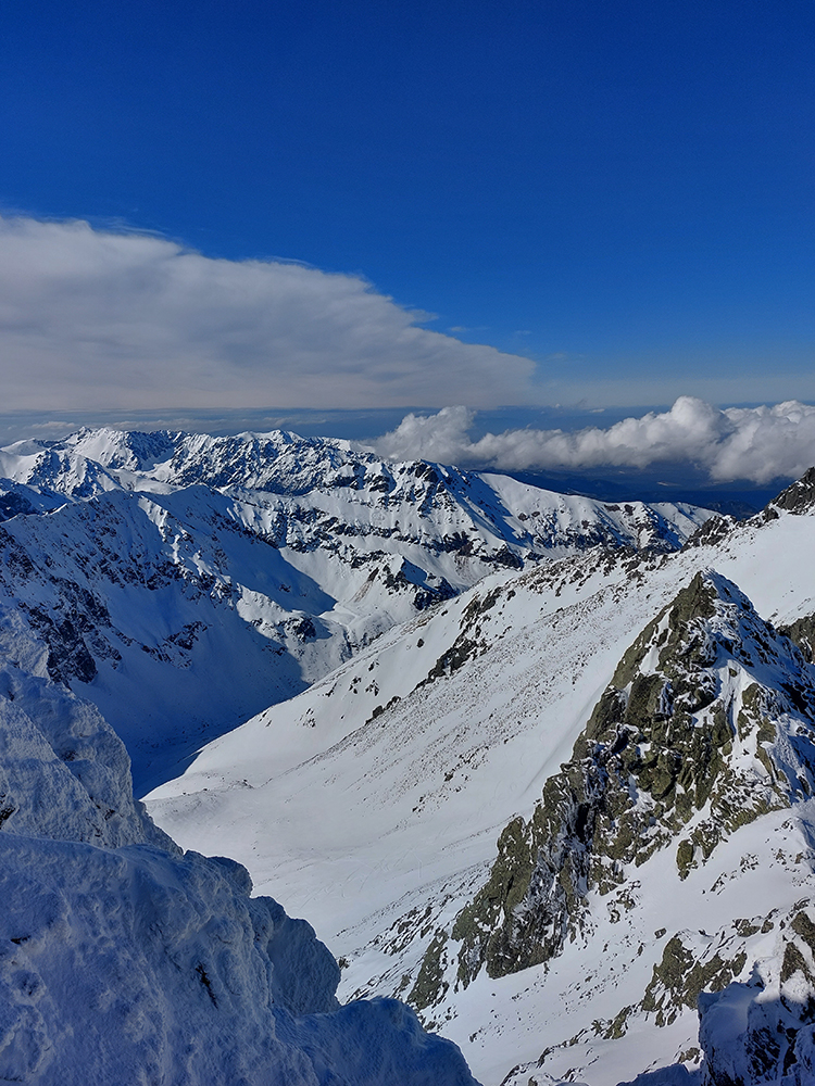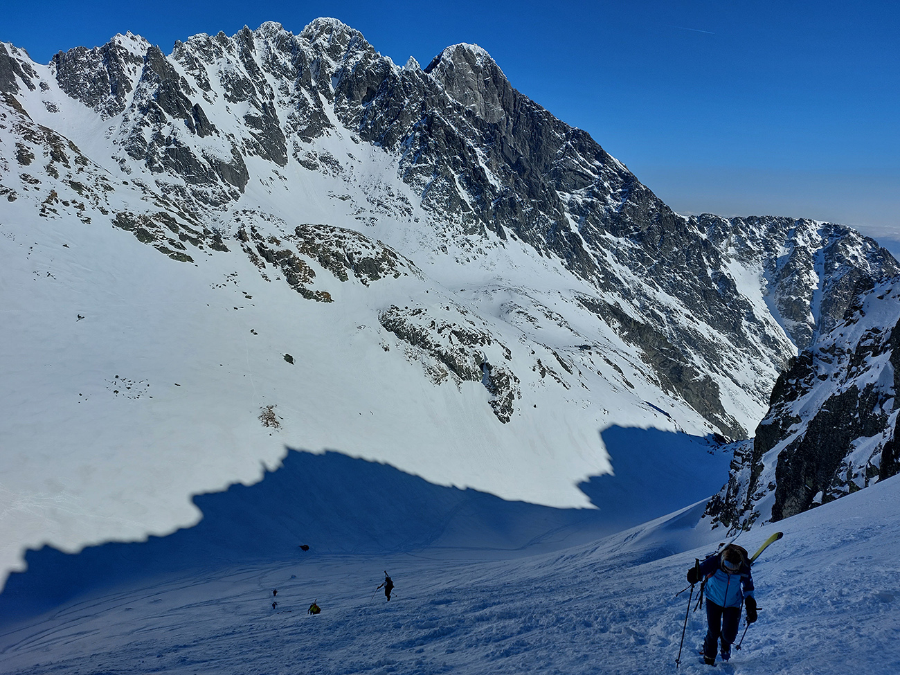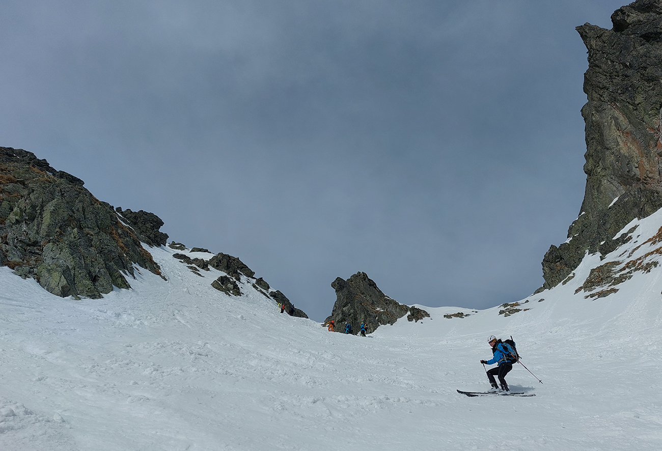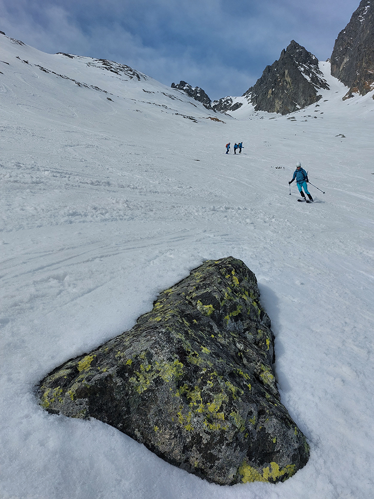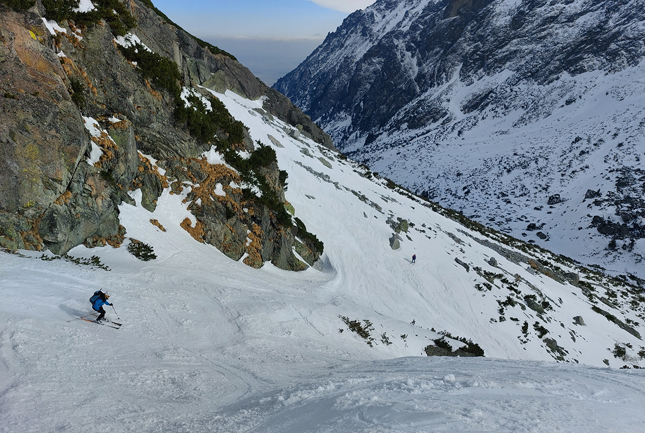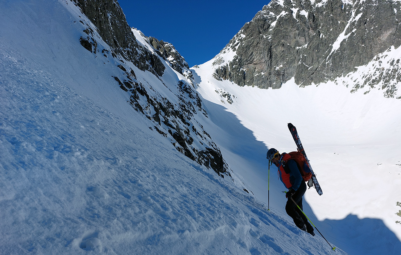 Hore výhľadové fotoorgie na všetky strany, ale aj vysoké oblaky, lezúce pomaly od západu. Tak zas pekne slušne peši dole, len tá „výnimka“ musela frajeriť na lyžiach. Lenže ako tieň pokročil, v hornej časti už takmer furt len nesmelým zosúvaním po drsnom šmirgli a v užšej dolnej časti spočiatku tiež, lebo pod načechranou, firnovou hladinou striehli žraloky.
