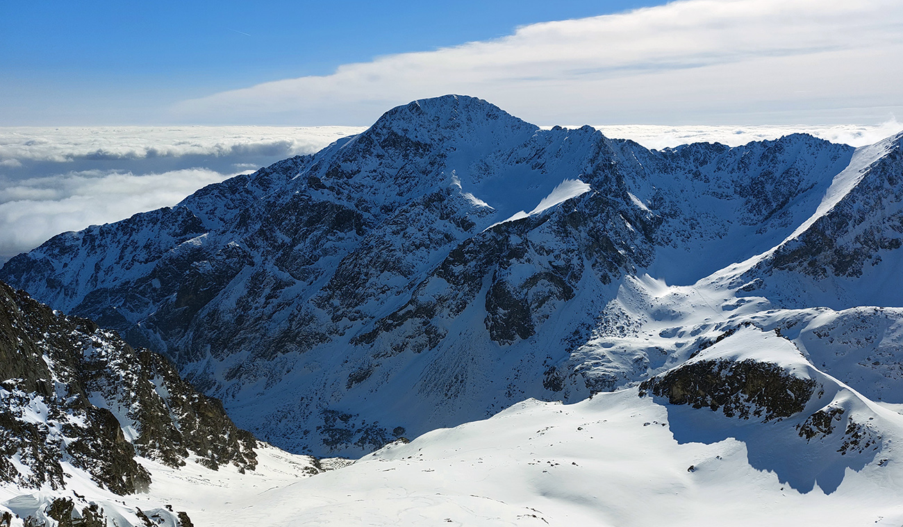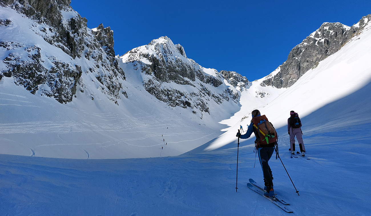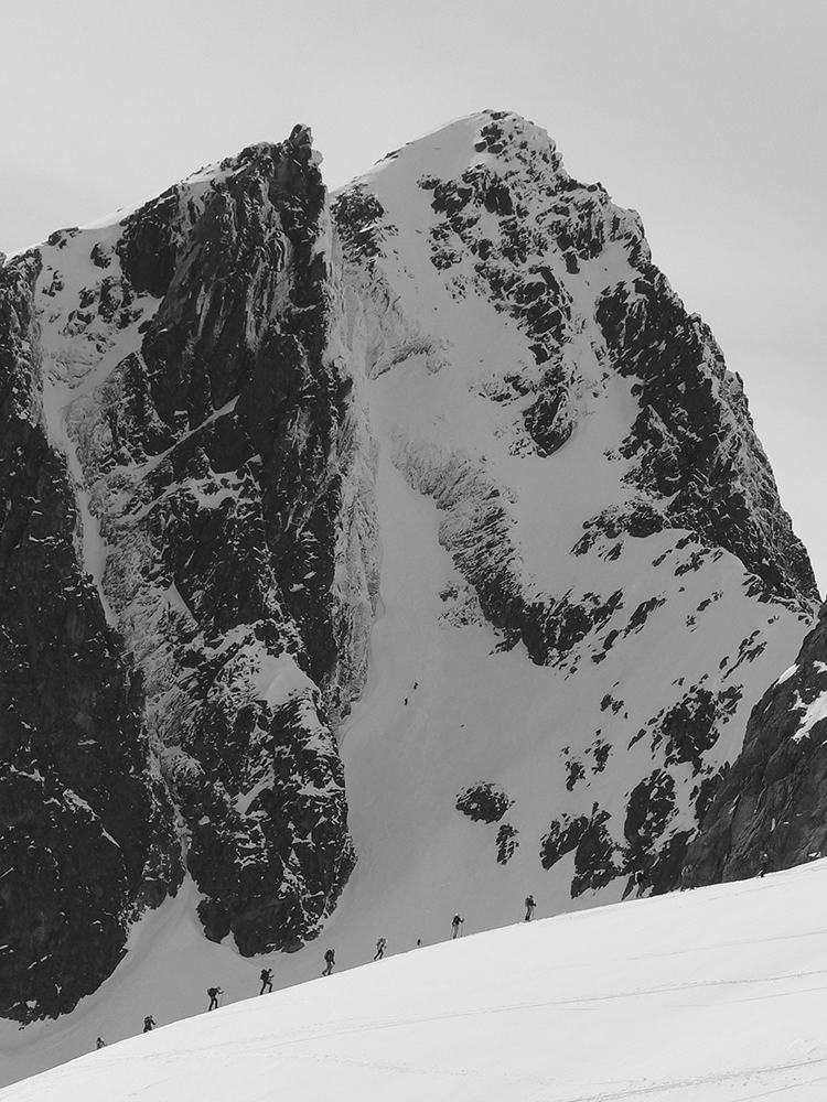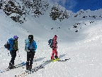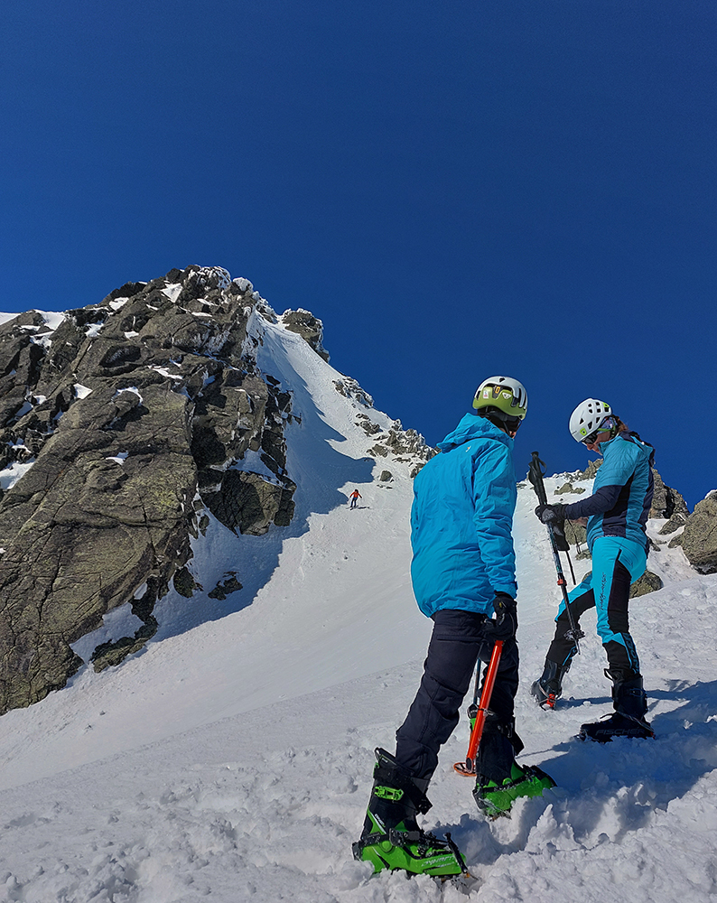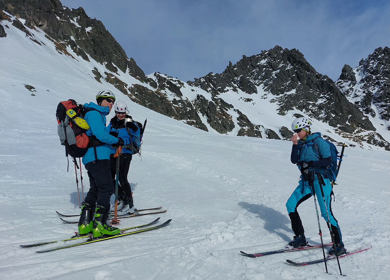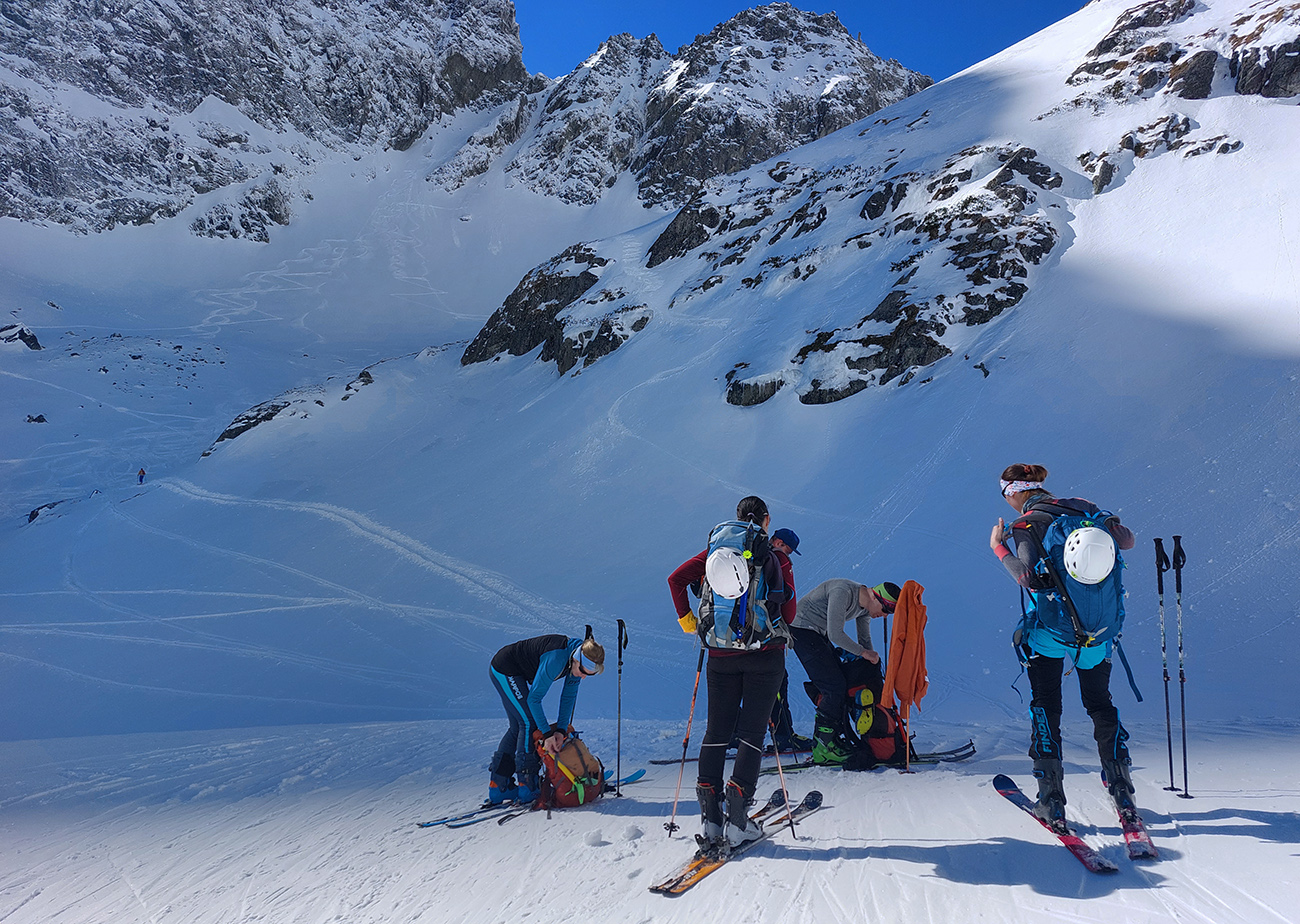 Hore výhľadové fotoorgie na všetky strany, ale aj vysoké oblaky, lezúce pomaly od západu. Tak zas pekne slušne peši dole, len tá „výnimka“ musela frajeriť na lyžiach. Lenže ako tieň pokročil, v hornej časti už takmer furt len nesmelým zosúvaním po drsnom šmirgli a v užšej dolnej časti spočiatku tiež, lebo pod načechranou, firnovou hladinou striehli žraloky.