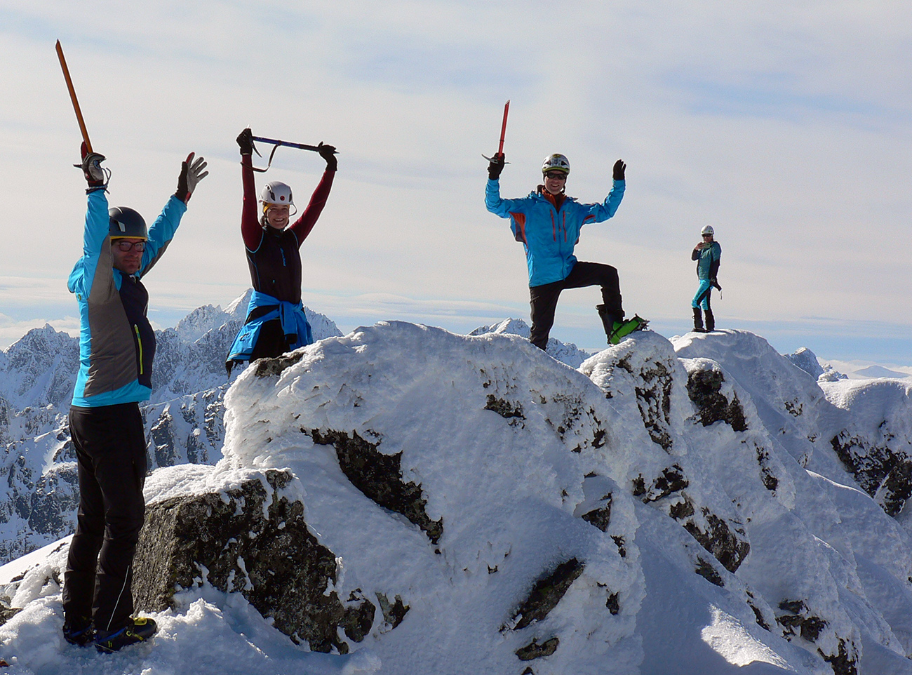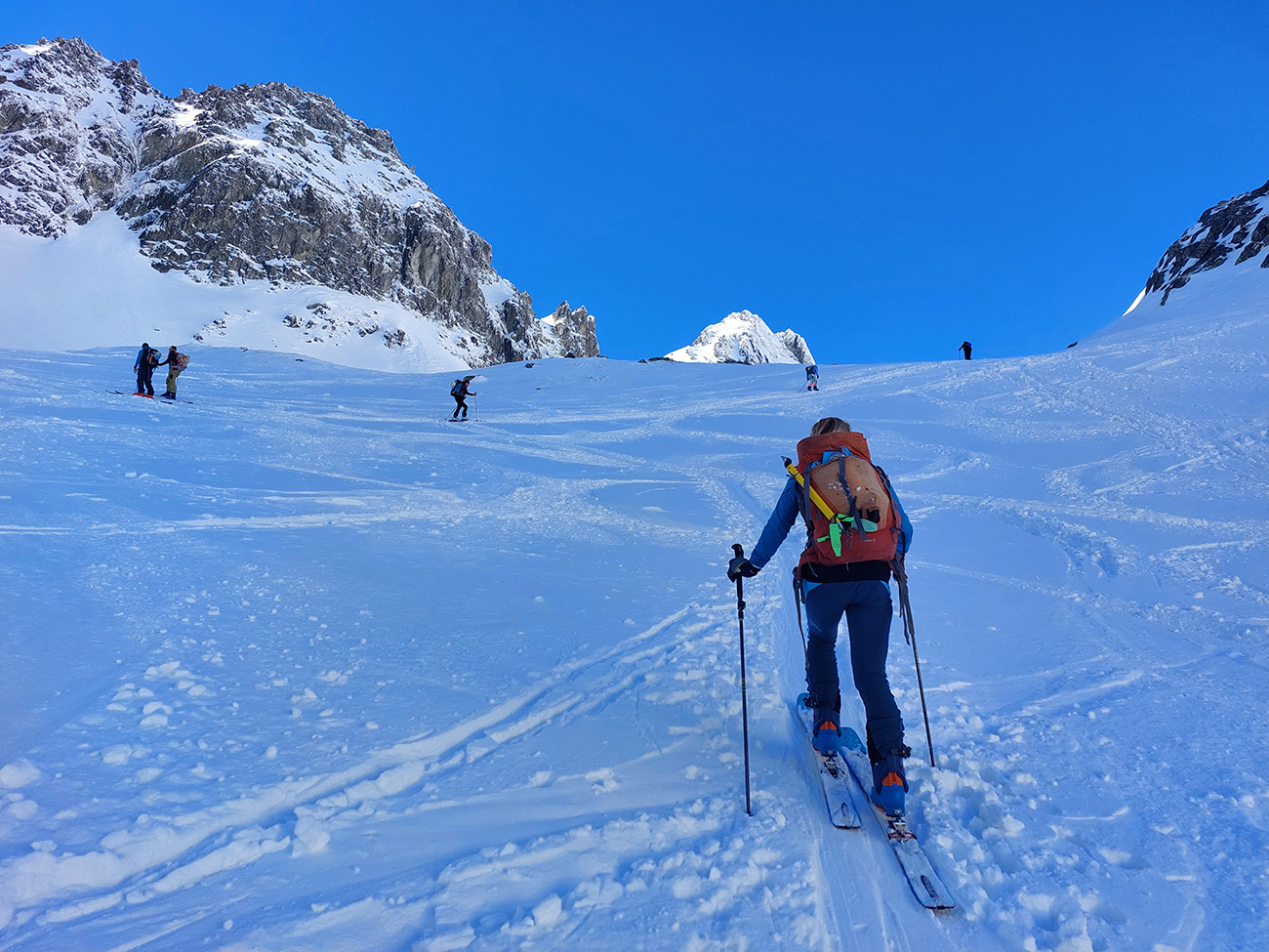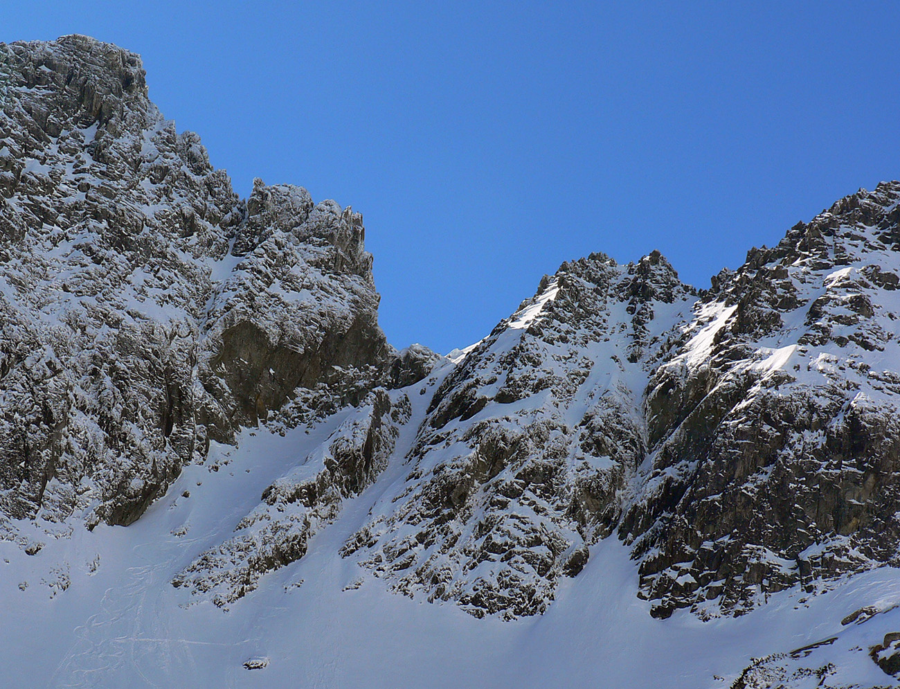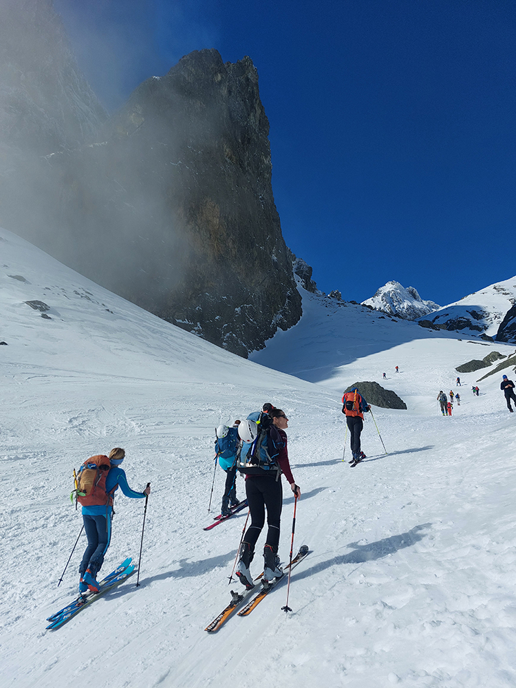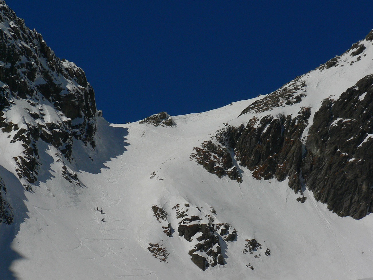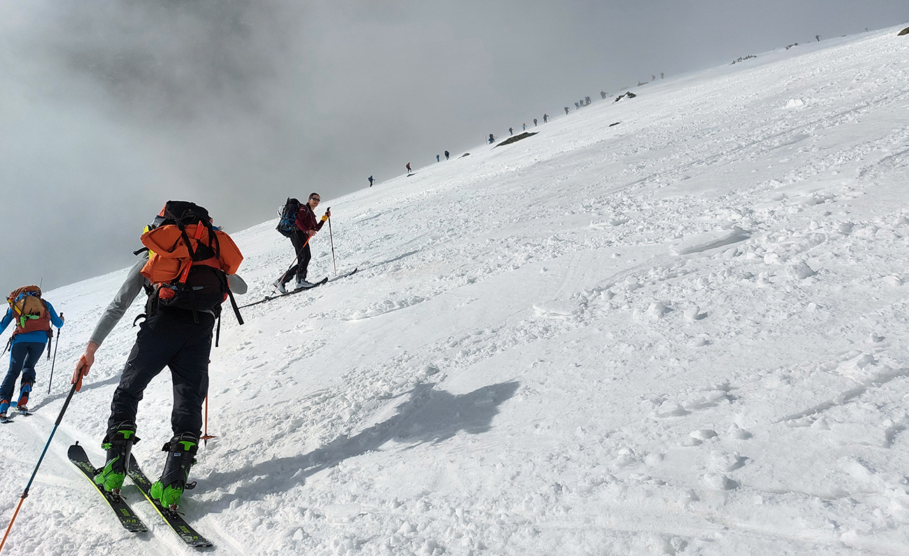 Hore výhľadové fotoorgie na všetky strany, ale aj vysoké oblaky, lezúce pomaly od západu. Tak zas pekne slušne peši dole, len tá „výnimka“ musela frajeriť na lyžiach. Lenže ako tieň pokročil, v hornej časti už takmer furt len nesmelým zosúvaním po drsnom šmirgli a v užšej dolnej časti spočiatku tiež, lebo pod načechranou, firnovou hladinou striehli žraloky.