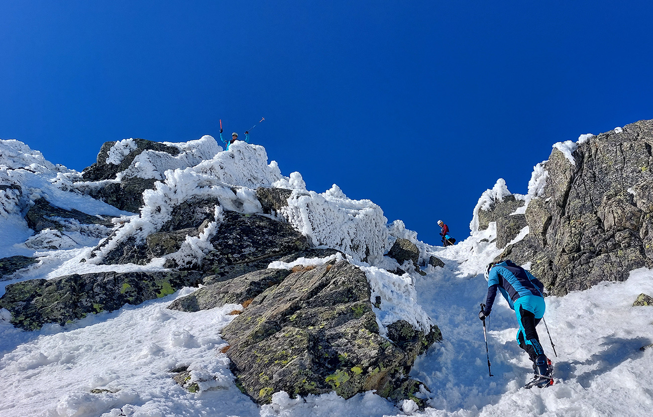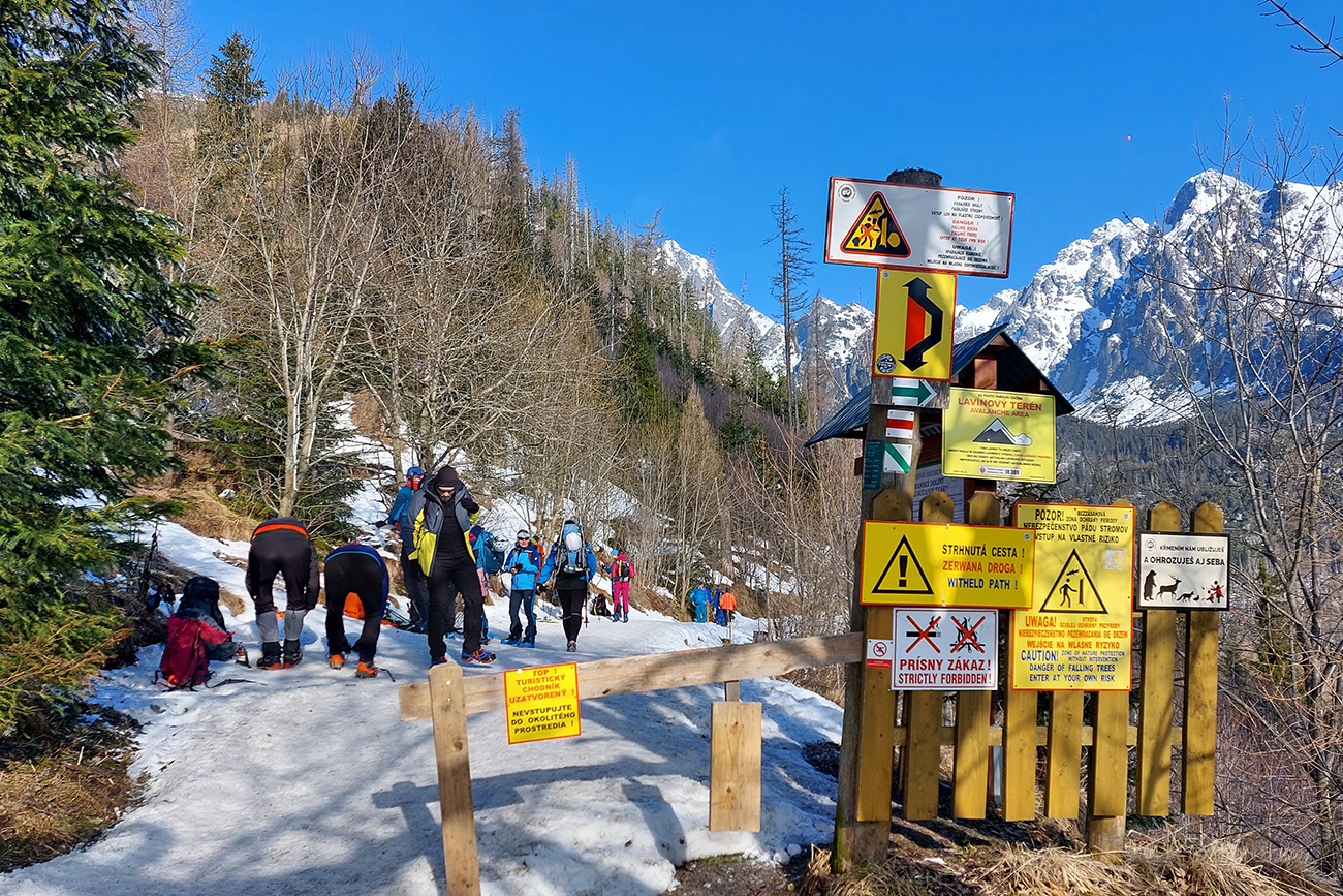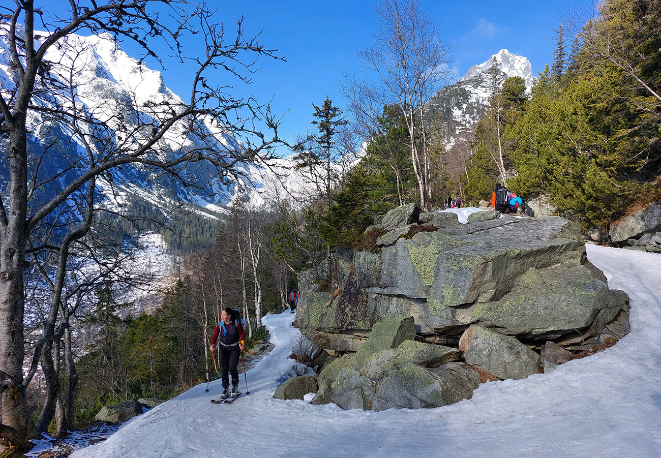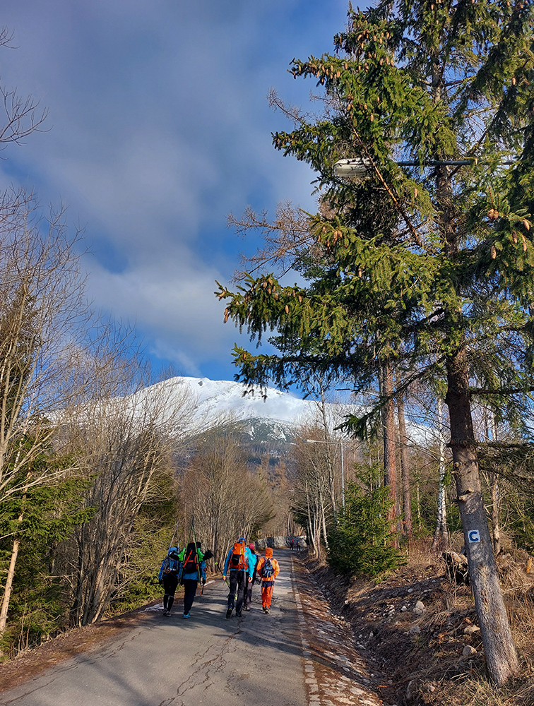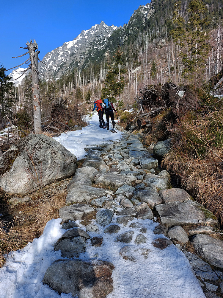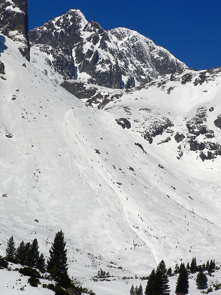 Nad Zamkou iný svet aj iný sneh. Len aj teplota zase akosi skokovo vzrástla, ako sme sa z lesa vynorili. A čerstvý poprašok začal niekde trochu aj lepiť na pásy. No stopa už vyšmýkaná a vychodená. Nešli sme nejako neskoro, ale pred nami už tiahli davy. Nečudo, šľapky slovenské (aj iné) sa koncentrujú na tých pár miestach, kde sa dá. A kde sa vlastne dá okrem Tatier?