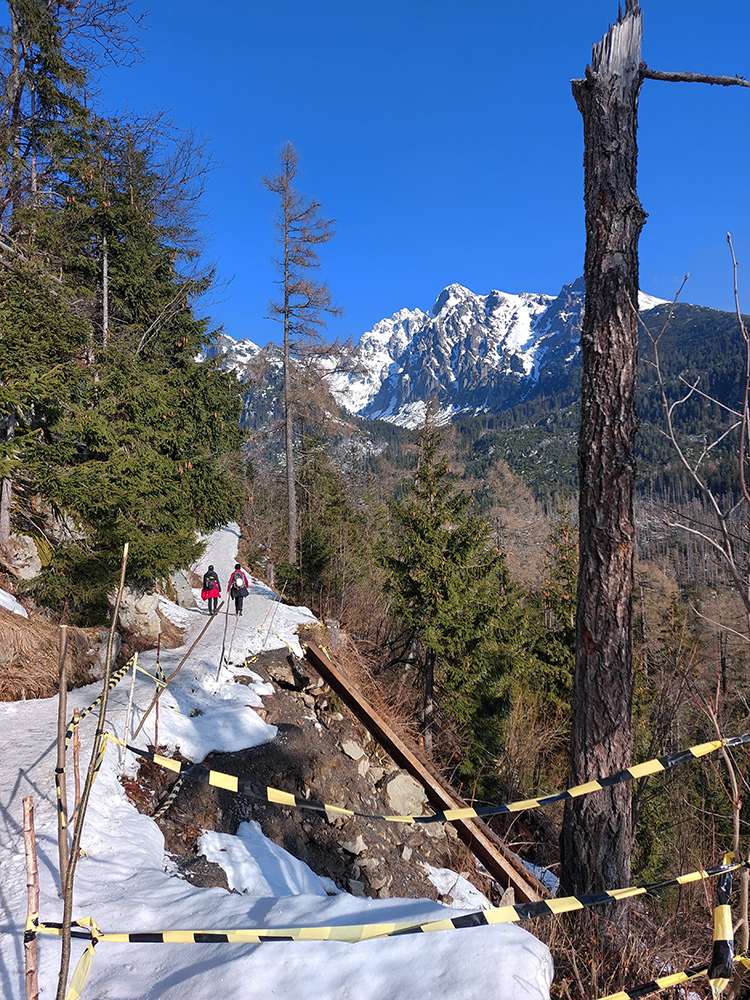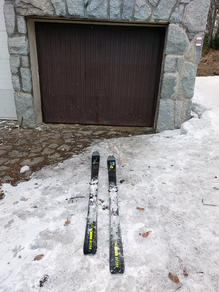 Do lyží sme optimisticky naskákali už na začiatku chodníka, hneď za „uzáverou“. Na to, že zosunutý chodník je zatvorený, celkom slušná premávka na ňom. Aj na lyžoch sa dalo, len potom sme ešte párkrát (až po serpentínu) krátko prenášali. Ale je to na mnohých miestach už len tak – tak. Chce to pevné nervy a málo lásky k pásom na miestach, kde sa to „horšie kĺže“.
