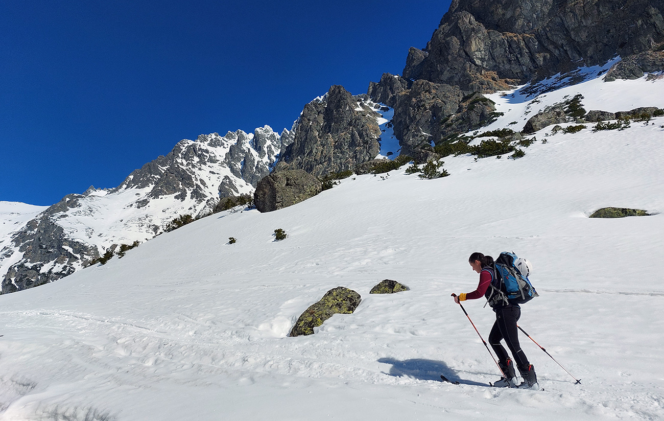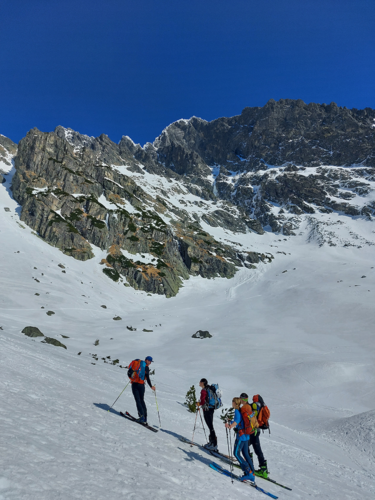 V Priečnom samozrejme premávka a miesta len na státie, tak sme sa moc nezdržovali a pokračovali na Širokú kopu. Aj tu už samozrejme schodíky, ale plytšie, ale zase podklad odmäknutý, jarne firnový. Vietor takmer žiadny, teplota tak akurát. Batohy s lyžami ostali na plošinke pár metrov nad sedlom (až na jednu výnimku). Pohoda až hore. Jedine zúženie tesne pod vrcholom menej vysnežené, plytko pod snehom skaly. „Zjazdovka“ spod zúženia dole do Priečneho sedla prudko použiteľná, prelyžovaná do rovna, len ako už tiene postupovali v jej hornej časti, začínala tvrdnúť.