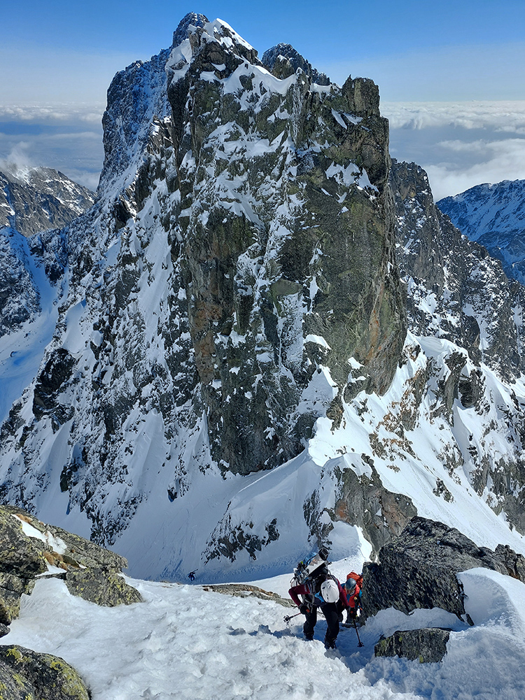 ...samozrejme aj s cestou k nej, pešo aj na pásoch, v sobotu deviateho marca. Teda MSD – Priečne – VSD, s krátkou zachádzkou na Širokú vežu - tatranská klasika, odporúčaná teraz najmä v tomto smere. Lebo aj to v partii zaznelo, že ešte sme sa v tejto sezóne so snehom poriadne nezvítali, a už aby sme sa aj lúčili. Tragicky teplá zima je neľútostná a opačným smerom by to bolo od Zamky po Hrebienok (slušne povedané) jemne nepohodlné. Veď na fotkách vidno.