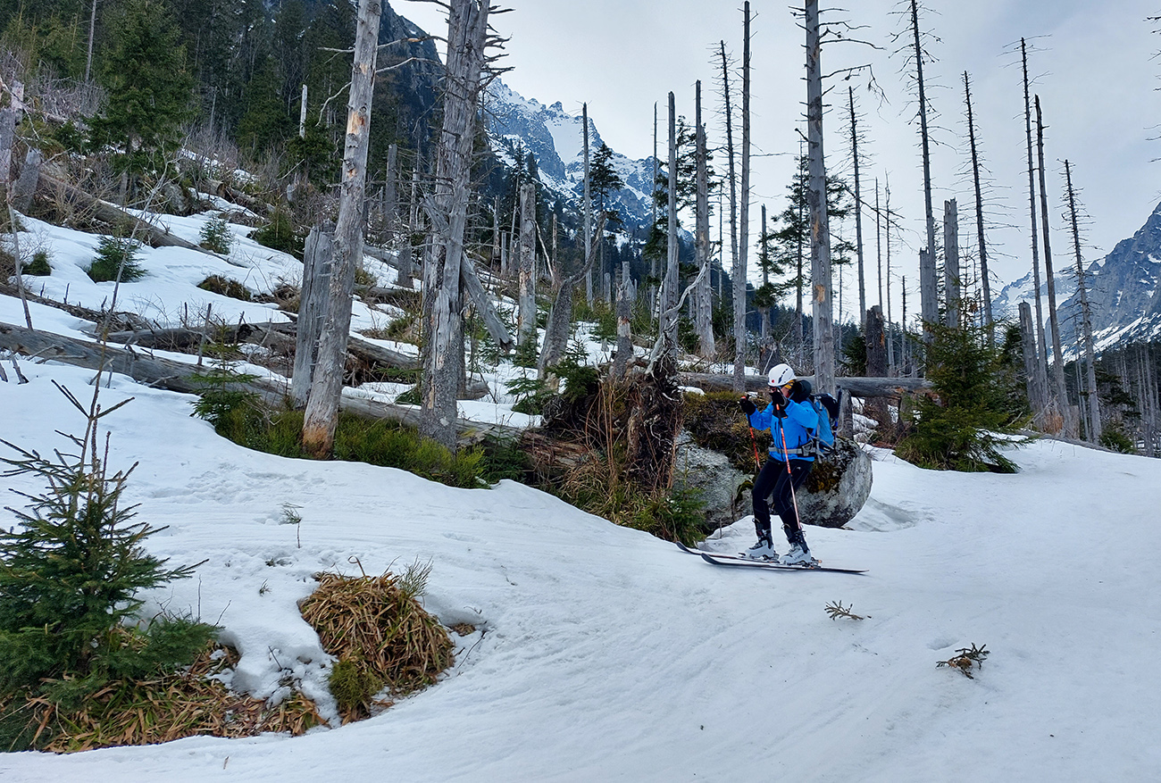Nasledovala kľučkovacia zábava v kosodrevine, kde lyže ešte stačili vykrajovať zákruty. Na rozdiel od Húpačiek, kde bolo treba prezuť korčule. Ale kto využíval danosti rozvlneného reliéfu, vyšantil sa aj tam. S trochou sebazapretia a potlačenia palicami sa dokonca dalo na lyžiach dostať až na Rázcestie nad Rainerovou chatou a po opatrnom prekráčaní jednej skalnej pasce bez vyzúvania až dole na Hrebienok. Ale to sa asi rýchlo bude meniť k horšiemu, ako vidno v predpovediach počasia.