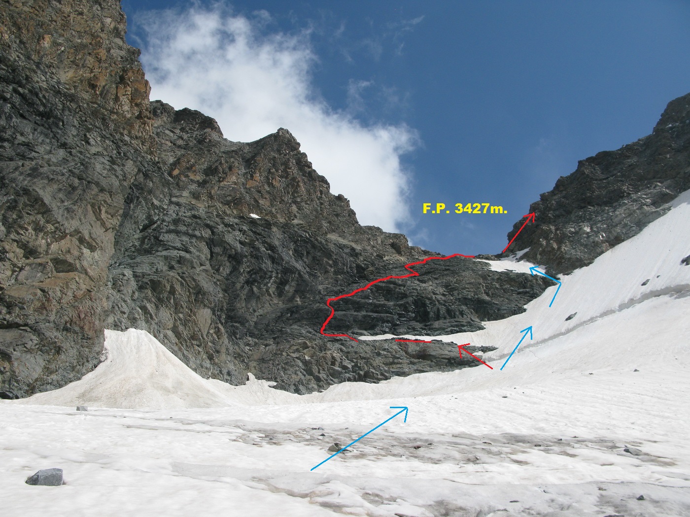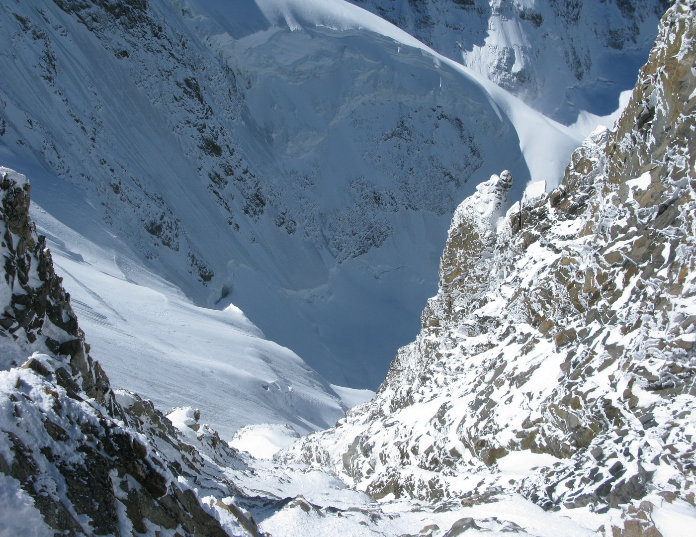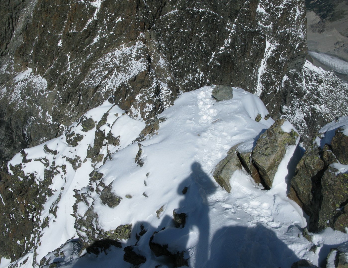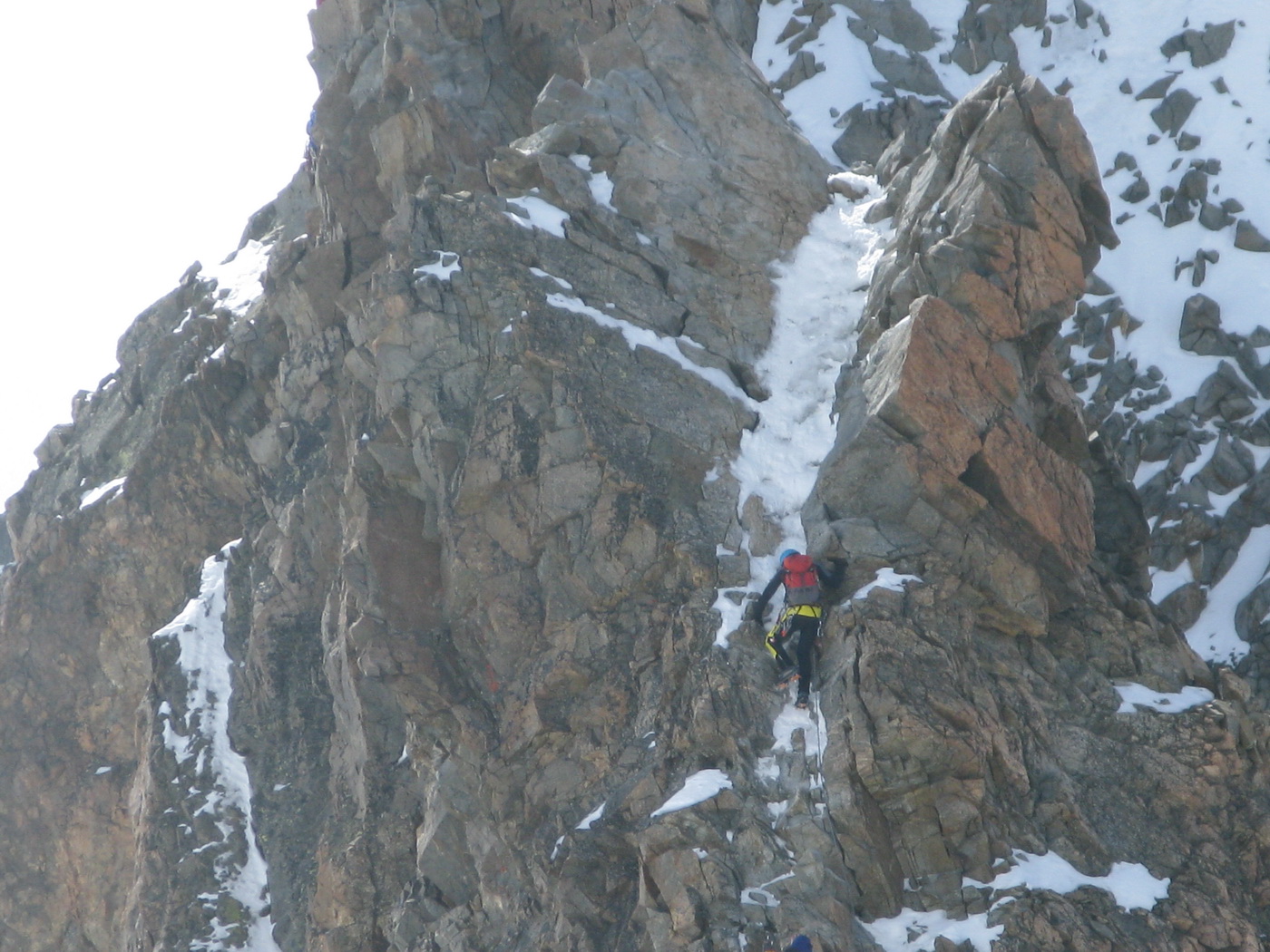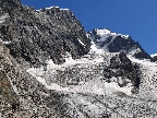 Najrýchlejšia a najpoužívanejšia trasa odbočuje v hornej časti zo skalného hrebeňa vľavo a mierne klesajúcou exponovanou rampou vás privedie na strmý ľadovec (foto). Preistený je aj variant až na koniec skalného hrebeňa, končiaci krátkym zlaňákom. Ten je však určite dlhší. Stretol som tam horských vodcov, ktorí ho akurát zaisťovali s tým, že klientov na ľadovci istiť dobre nemôžu na rozdiel od skalného hrebeňa.