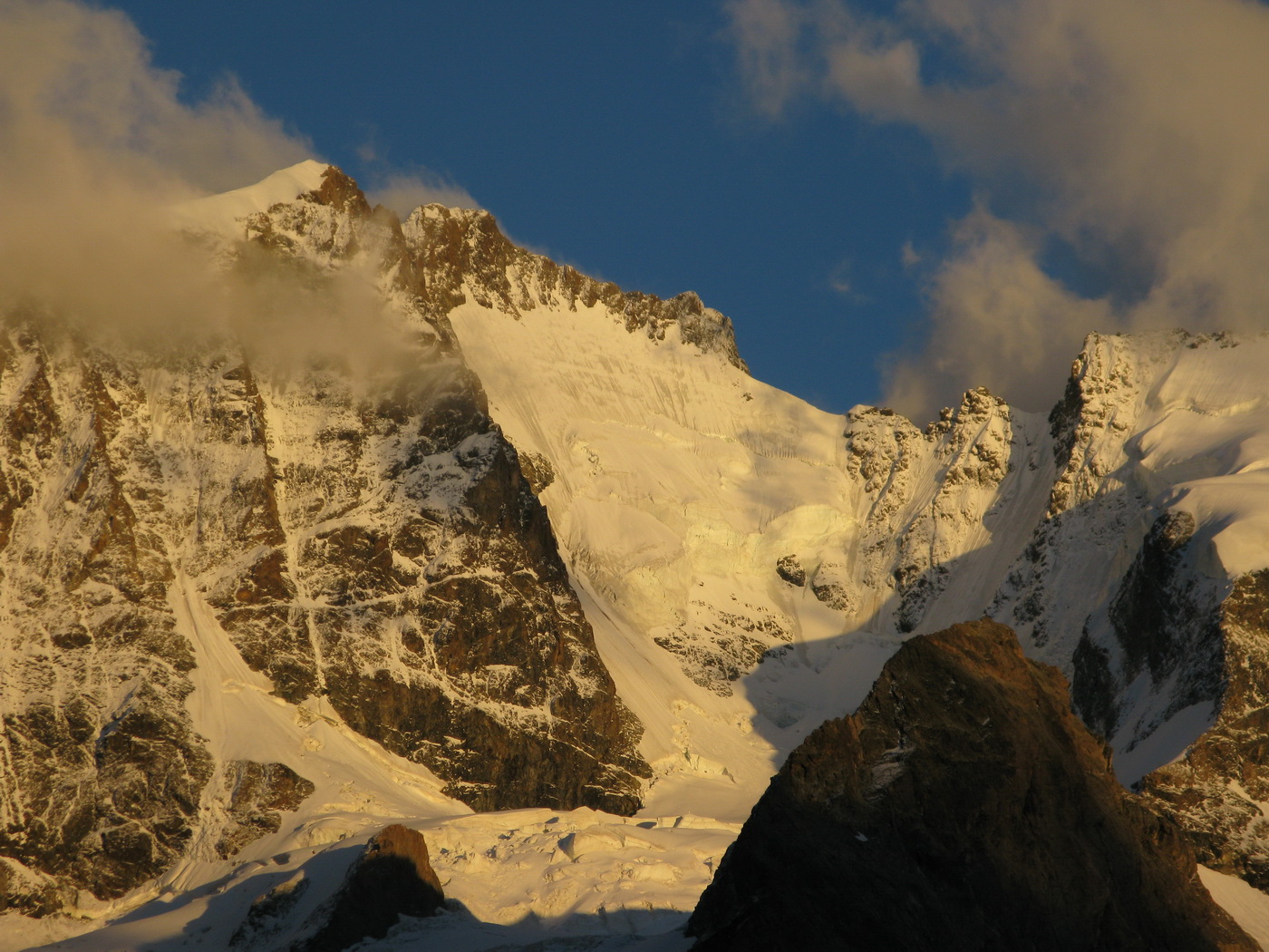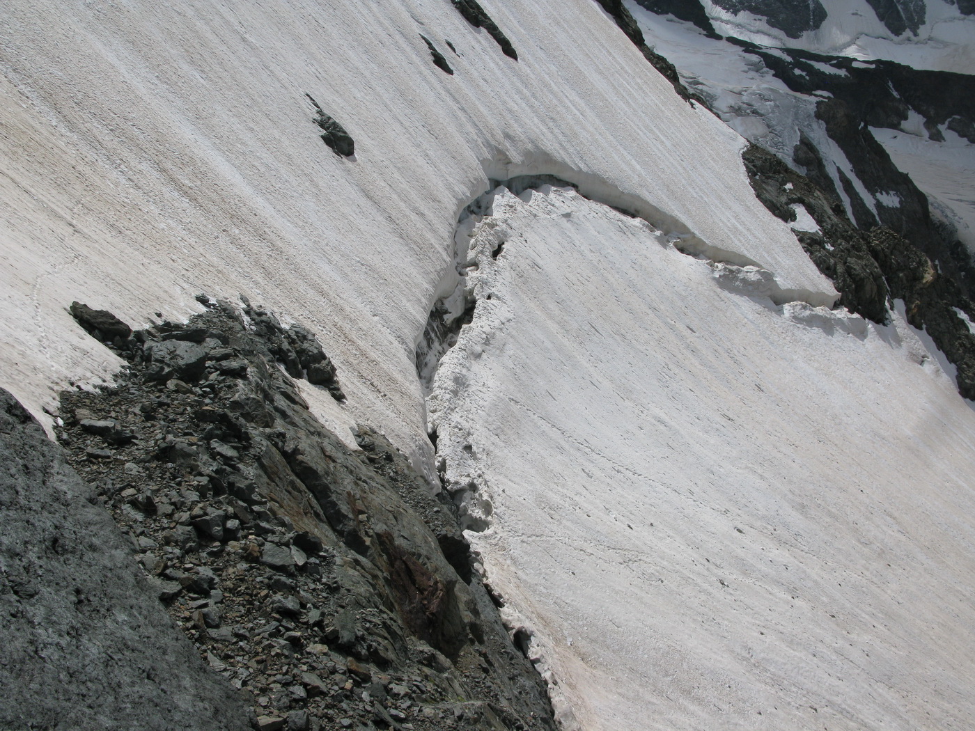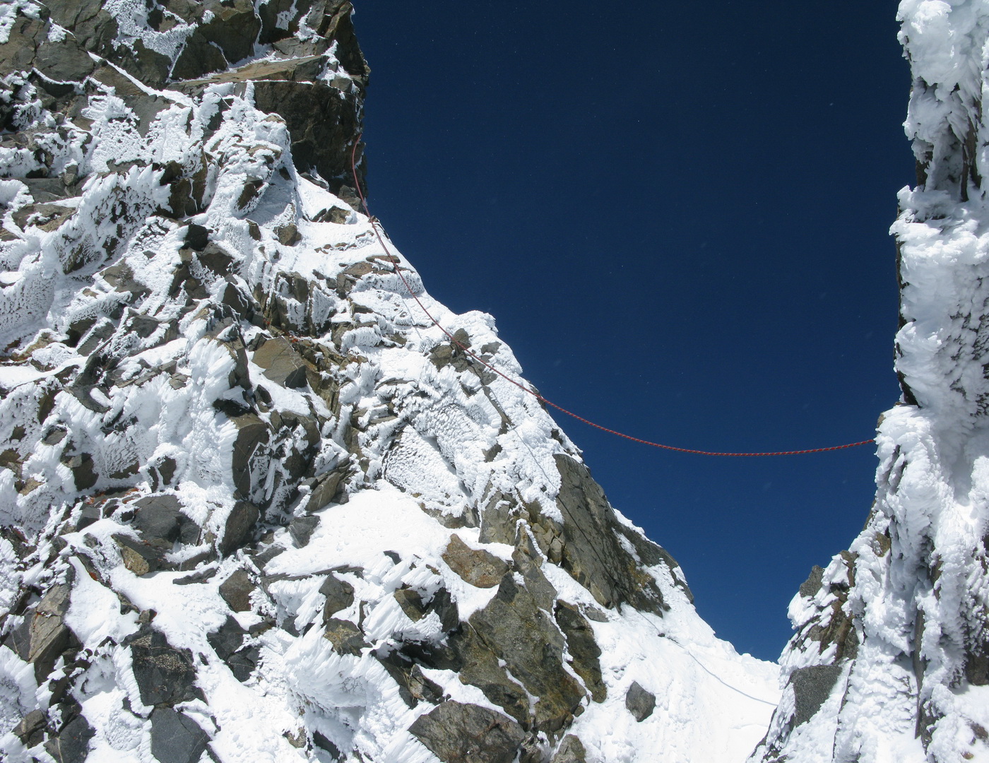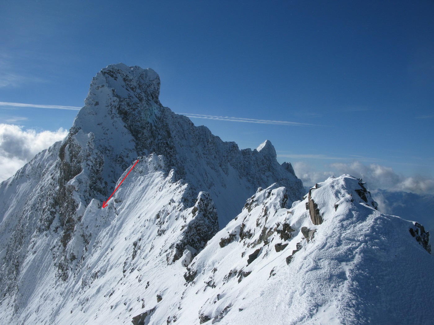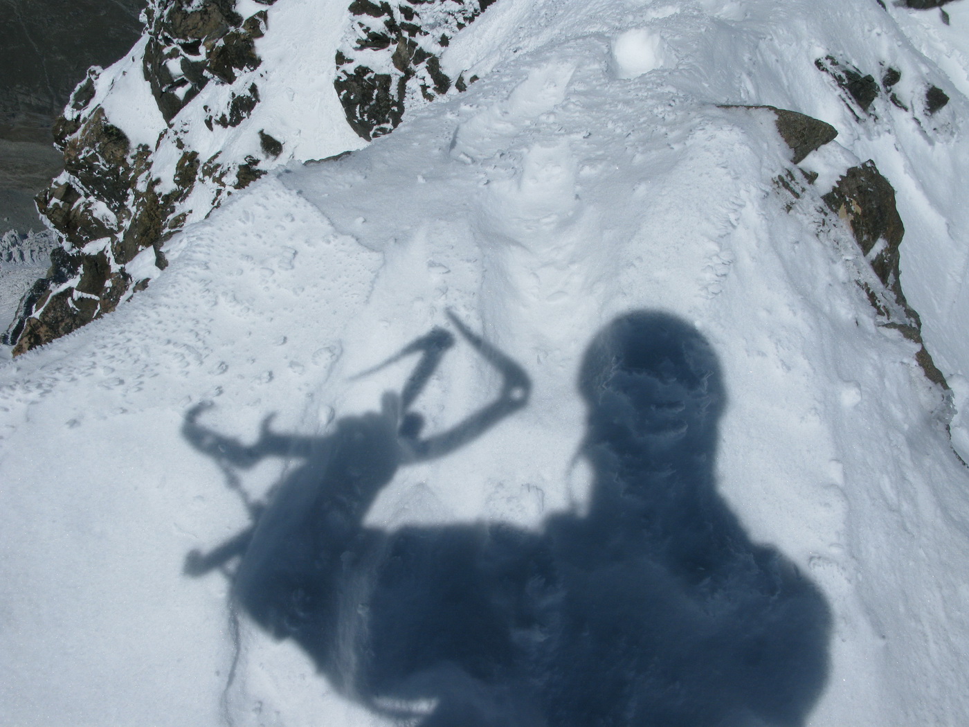 Najrýchlejšia a najpoužívanejšia trasa odbočuje v hornej časti zo skalného hrebeňa vľavo a mierne klesajúcou exponovanou rampou vás privedie na strmý ľadovec (foto). Preistený je aj variant až na koniec skalného hrebeňa, končiaci krátkym zlaňákom. Ten je však určite dlhší. Stretol som tam horských vodcov, ktorí ho akurát zaisťovali s tým, že klientov na ľadovci istiť dobre nemôžu na rozdiel od skalného hrebeňa.