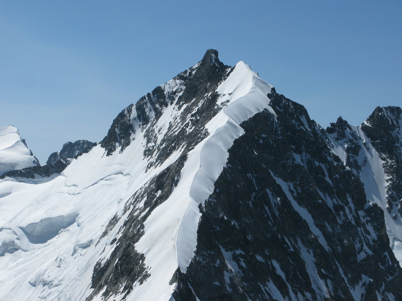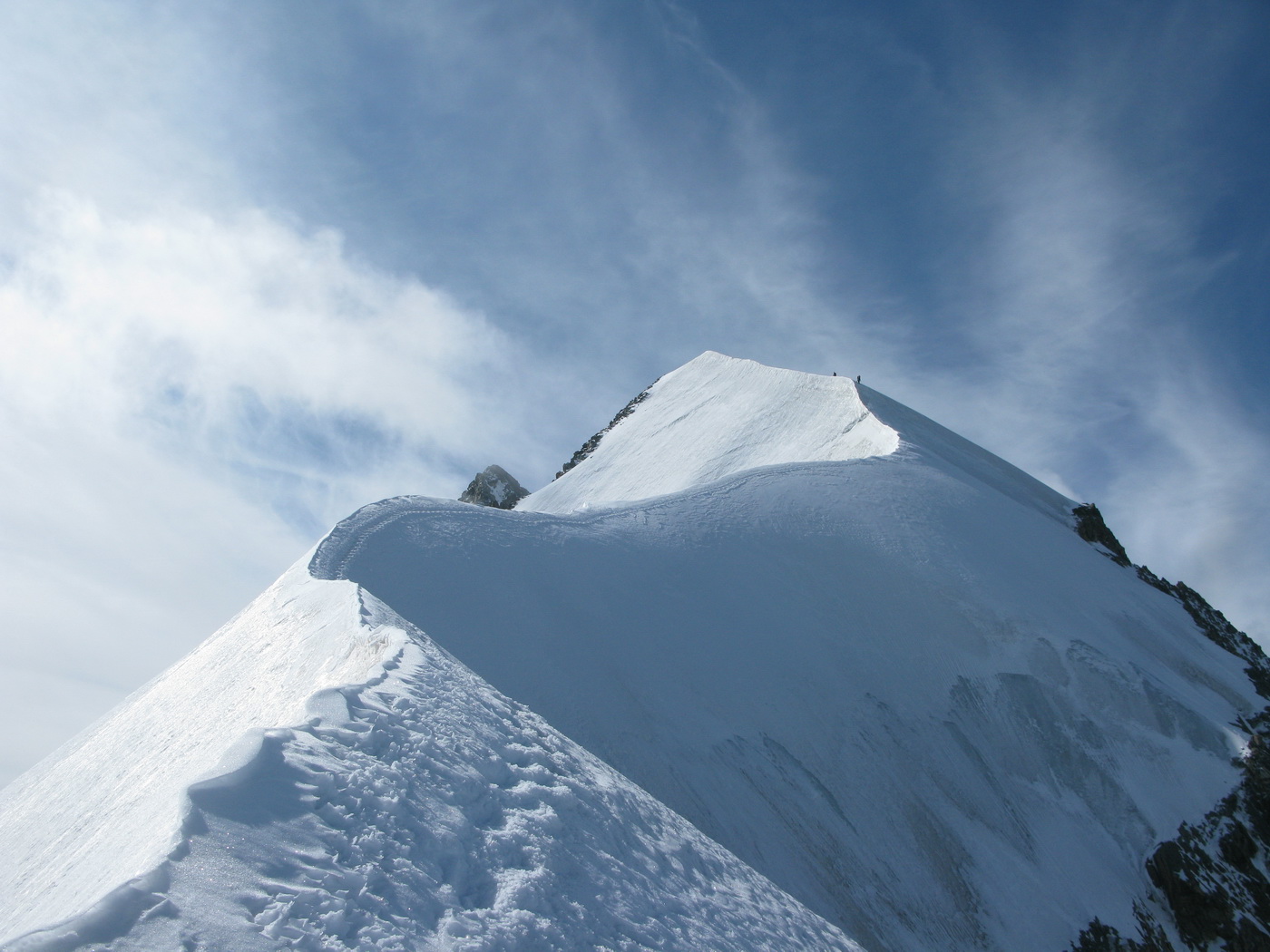 Potom ako sa dostanete strmým ľadovým svahom popri skalnej stene na hrebeň, ste už vlastne na samotnom začiatku Biancogratu. Tento ľadový výšvih považujem za jedno z kľúčových miest. Je dôležité aké sú tu snehové podmienky. V prípade tvrdého vodného ľadu hlavne zostup dokáže potrápiť. Na hrebeni už stojí medzi vami a Biancogratom len jedna výrazná skalná veža. Bežne sa chodí popod vežičku vľavo, ale v prípade vodného ľadu alebo nestabilnej snehovej pokrývky sa odporúča ísť po hrebeni vežičky. Išiel som viackrát oba spôsoby a radšej mám ten ľadový. Je rýchlejší, aj keď môže byť aj nebezpečnejší. Toto leto práve na tomto mieste na tvrdom ľade spadla dvojica naviazaná na lane, zahynuli obaja...