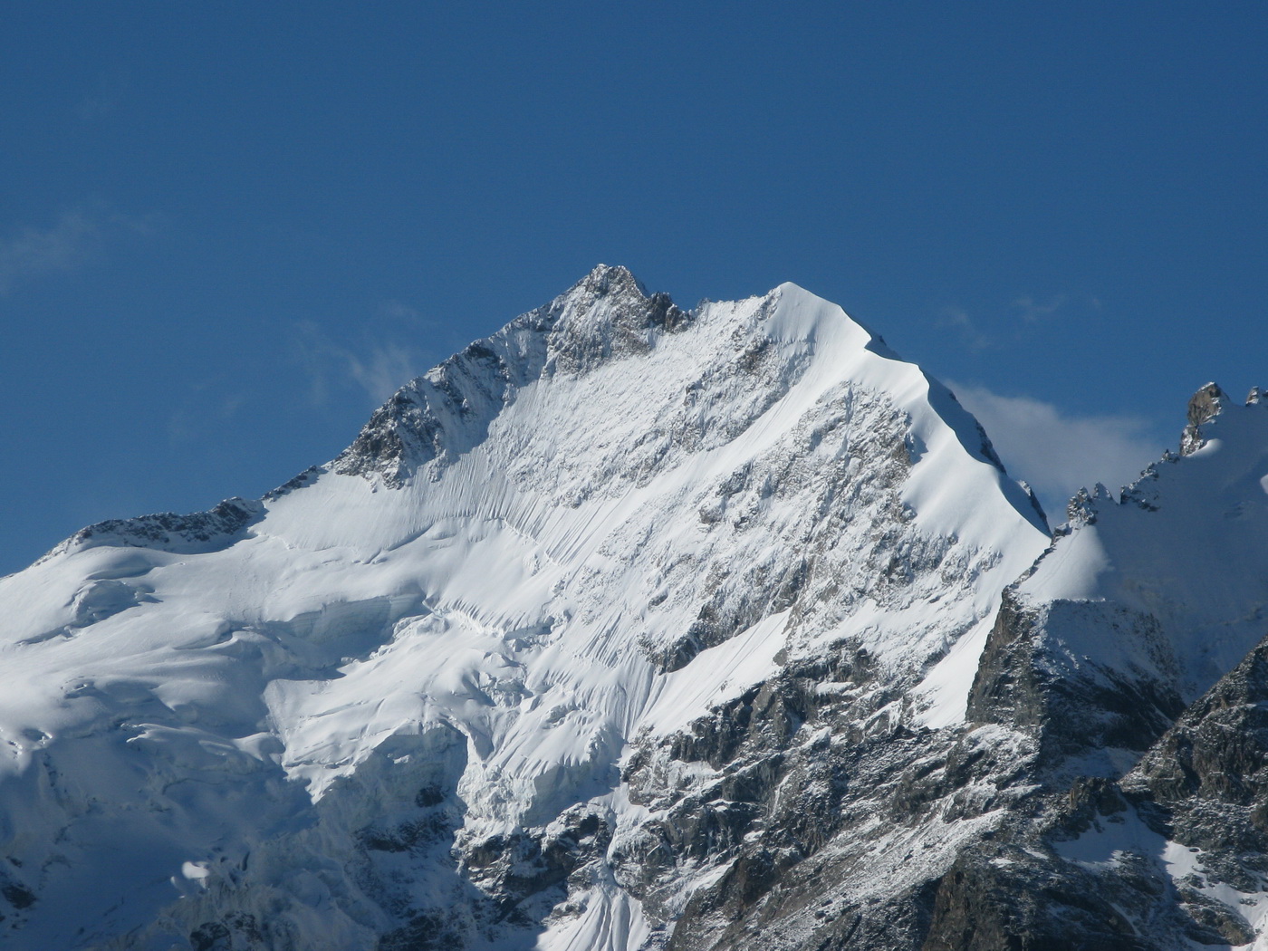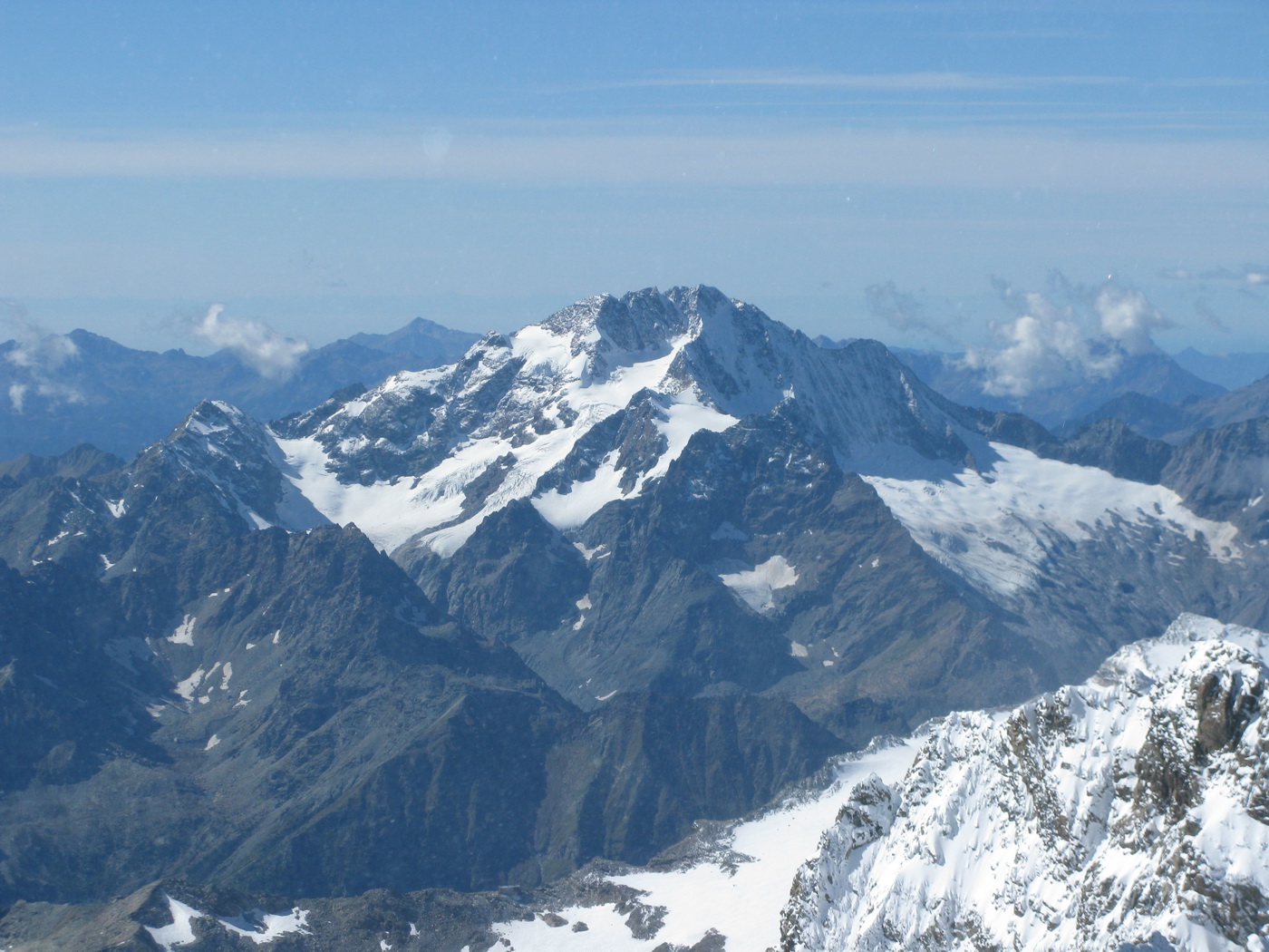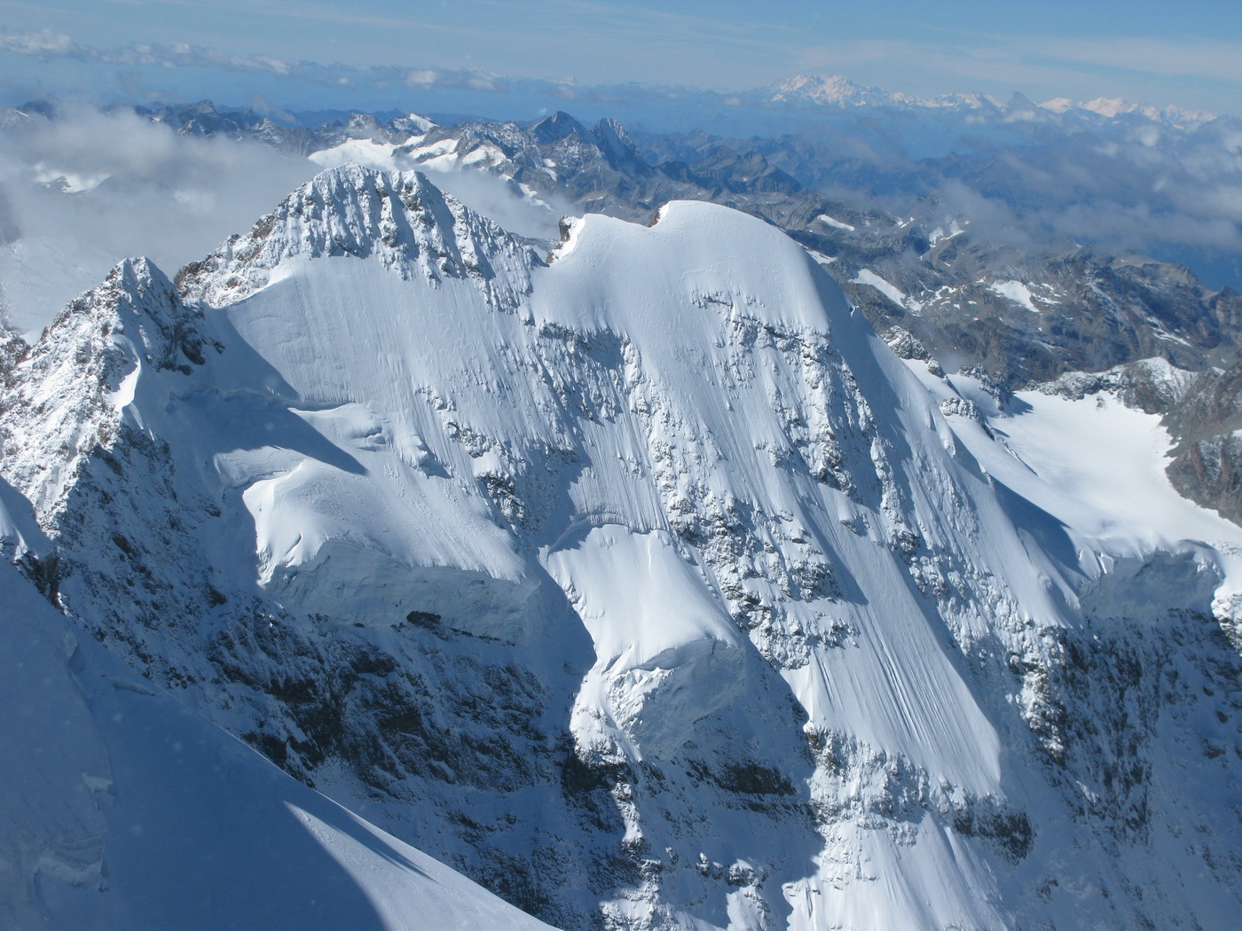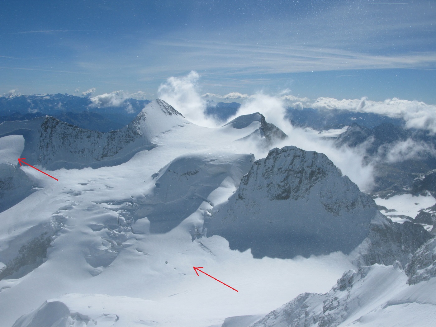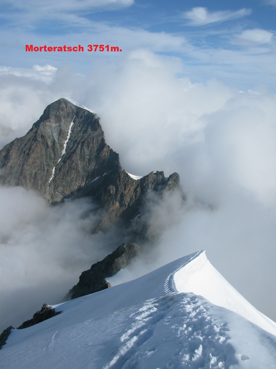 Vychádzam na Piz Bianco (3995m). Mraky sa roztrhali a postupne miznú. Vietor však neustáva.