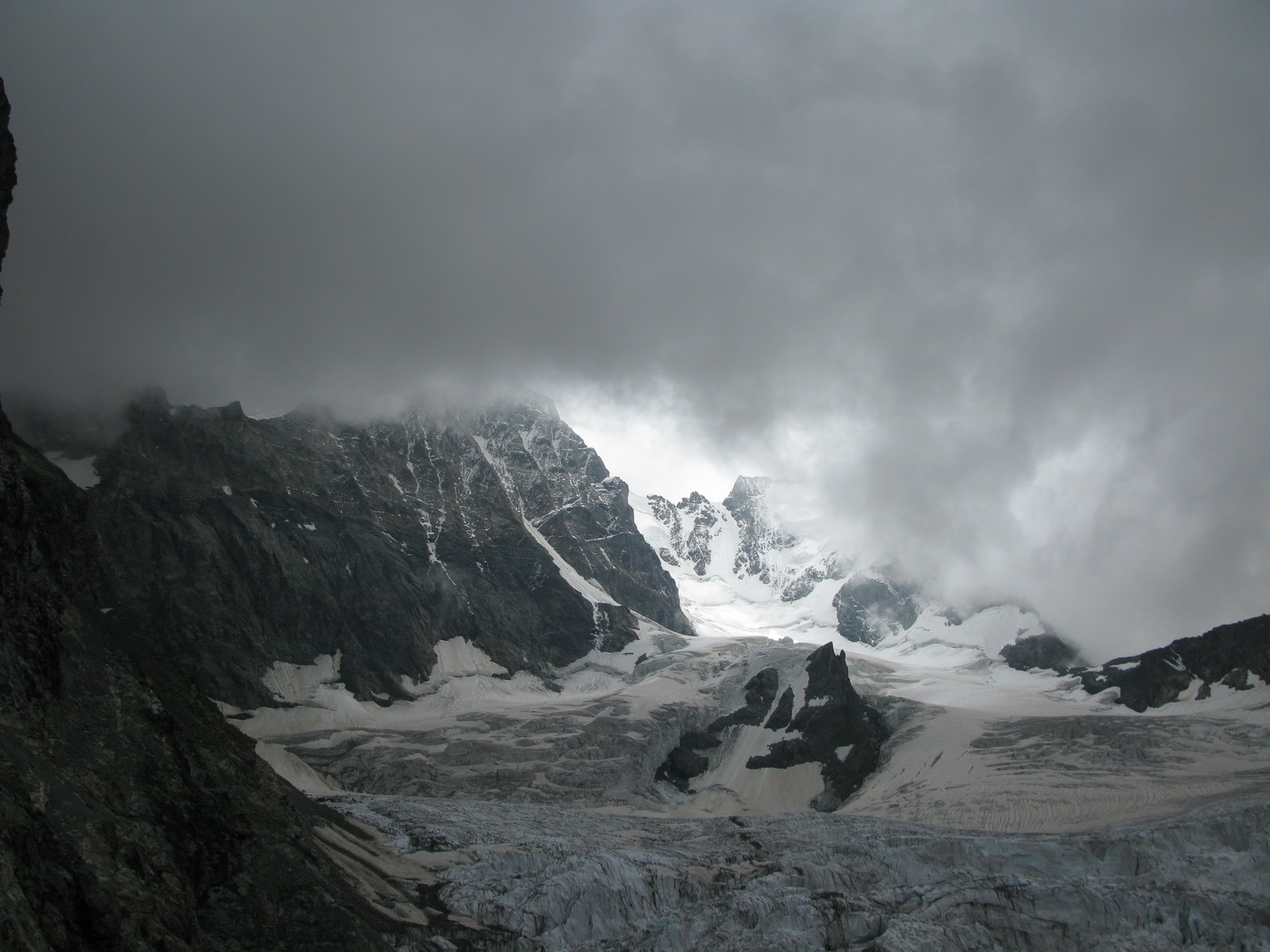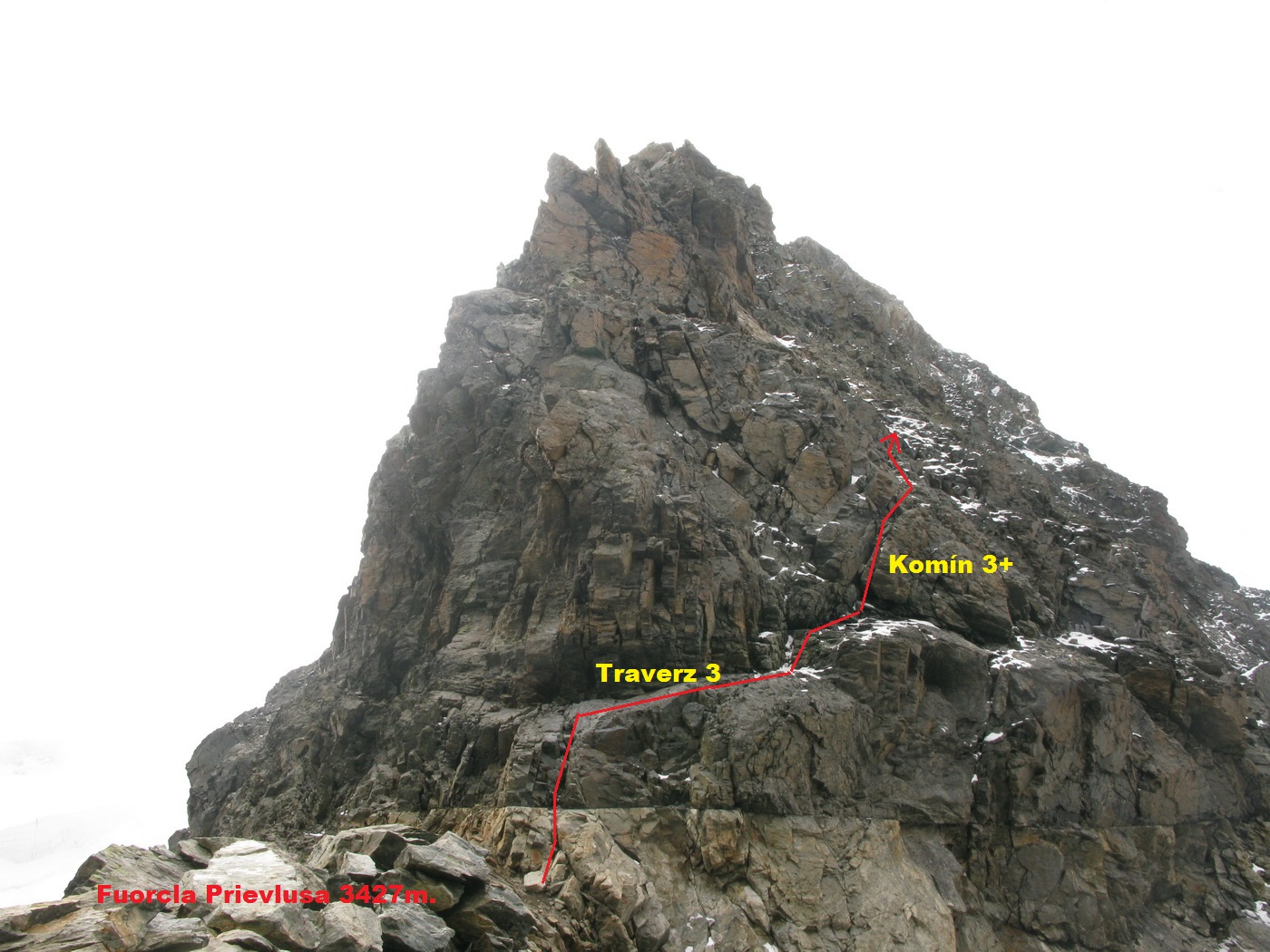 Pokračujem traverzom. Na niekoľkých miestach sú tu reťaze. V závere traverzu schádzam suťou dole na ľadovec. Ten však iba líznem a už si to mierim strmo hore k ľadovcu pod sedlom Prievlusa. Počasie je stále mizerné...