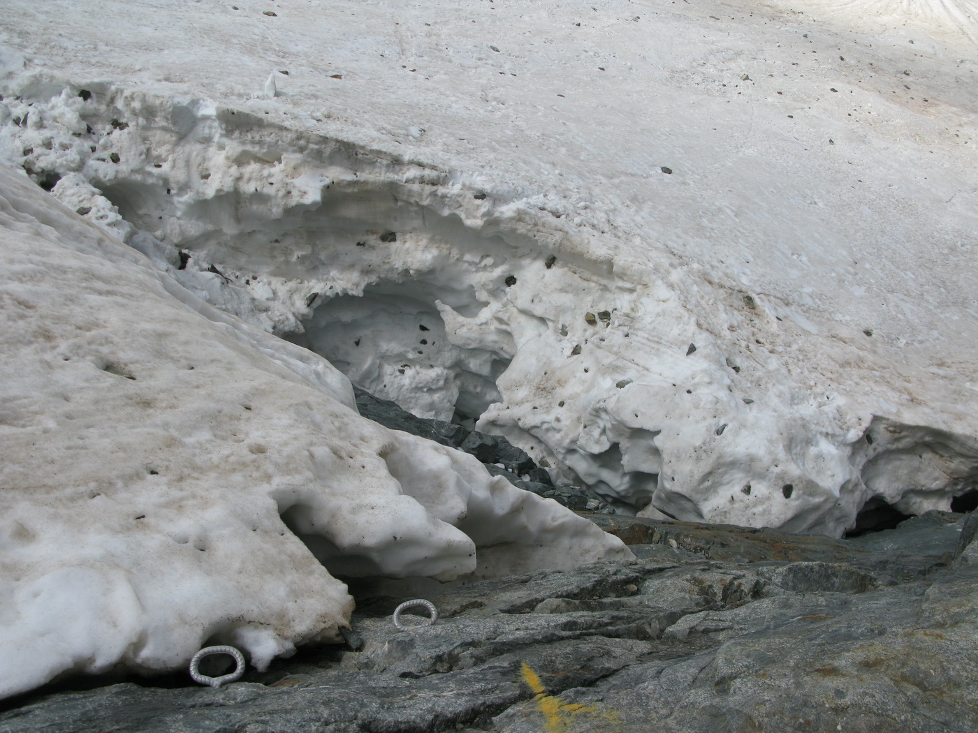 Mačky treba obuť hneď na začiatku ľadovca (foto), ráno býva tvrdo... Výstup do sedla vedie strmým firnovým svahom, je možné použiť aj skalný variant vľavo (foto). Firnový variant je rýchlejší. Oceľový variant je bez oceľového lana, sú tam kramle a oceľové tyče s okami (foto). Obe cesty sa rozdeľujú po prekonaní okrajovej trhliny (foto).