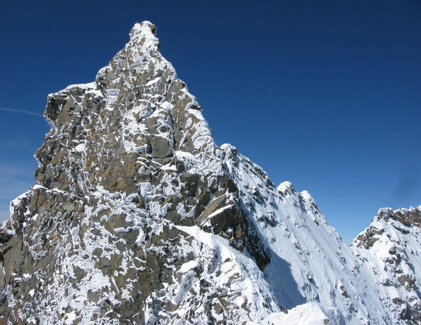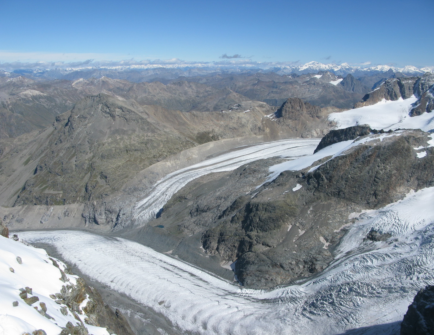 Slováka s Čechom stretávam až pri zostupe Biancogratom. S tými ťažkými batohmi a stanom to je iné sadomaso. Až o pár dní sa dozvedám, že sa k chate Marco e Rosa prebojovali o ôsmej večer. Chata už bola zavretá, ale je tam winterraum.