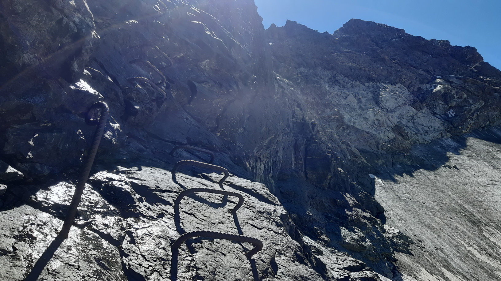 Trasa na Berninu cez Biancograt je aj v prvej polovici leta stále v relatívne dobrej podmienke a pomerne hojne navštevovaná. Po traverze pod Fuorcla Prievlusa je asi najdôležitejšou informáciou, že výstup do sedla už neprebieha ľadovcovo firnovým žlabom v pravej časti, ale chodí sa vľavo po kramlami a tyčami zabezpečenej trase (foto).