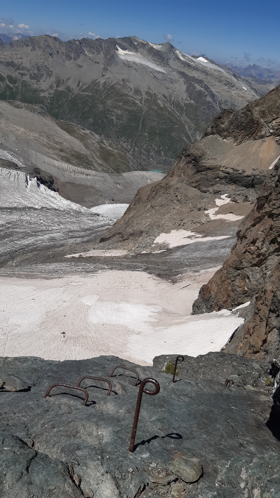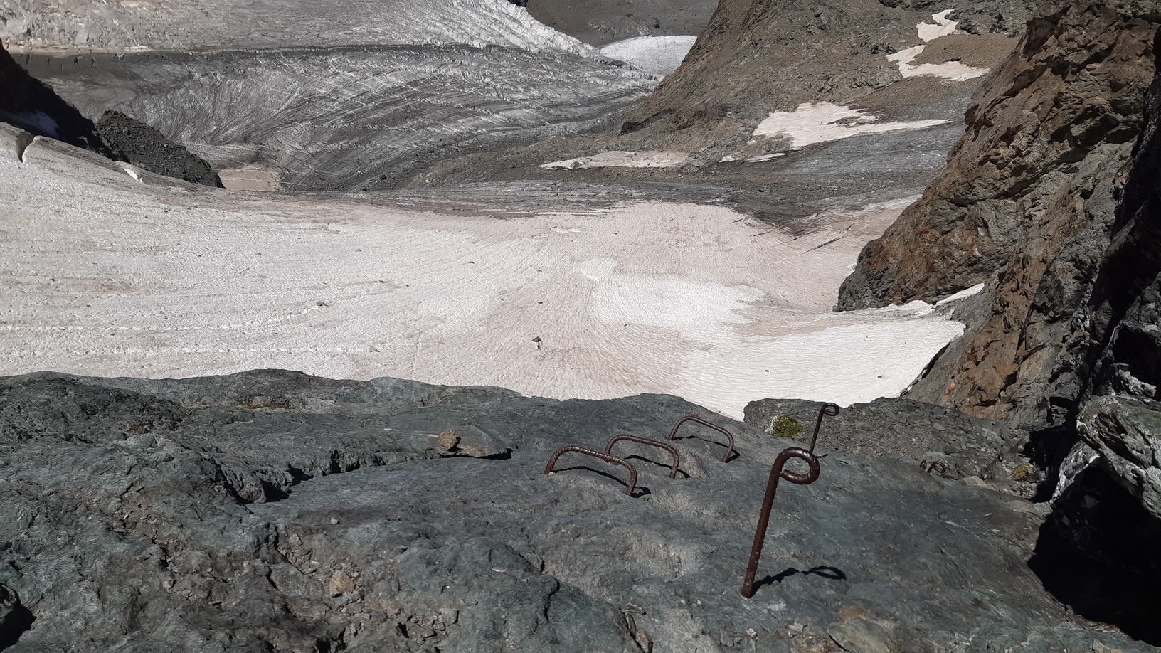 Nebol som si istý, či sa bude vedieť v členitom hrebeni dobre orientovať, a tak som sa otočil a zostúpil s ním až na ľadovec pod ferratu. Aj tento prípad len potvrdil, že výstup cez Biancograt nie je dobré podceňovať a je potrebné byť dobre pripravený na to čo vás čaká. V hornej skalnej časti medzi Piz Bianco a Berninou sú dva krátke zlaňáky, pri zostupe na chatu Marco e Rosa je ďalší zlaňák a pre tých, ktorí by sa chceli prípadne vrátiť naspäť Biancogratom, je rozhodujúci faktor snehová podmienka, v prípade vodného ľadu je totiž zliezanie oveľa náročnejšie a nebezpečnejšie ako výstup hore.