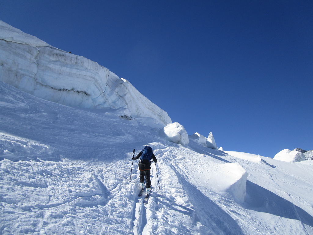 Začíname šlapať nenaviazaní, lano vyťahujeme až po prvom výraznom ľadovcovom zlome, ľadovec doteraz vyzerá mierumilovne. Ľudia šlapú pred i za nami. Zatiaľ sme na problém nenarazili aj keď v ľadovcovom zlome trebalo dať na pár metrov dole lyže. Po prejdení druhého plata sa terén pristrmuje.
