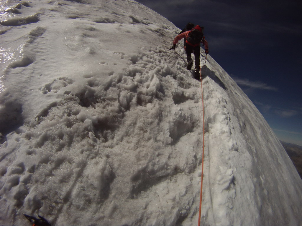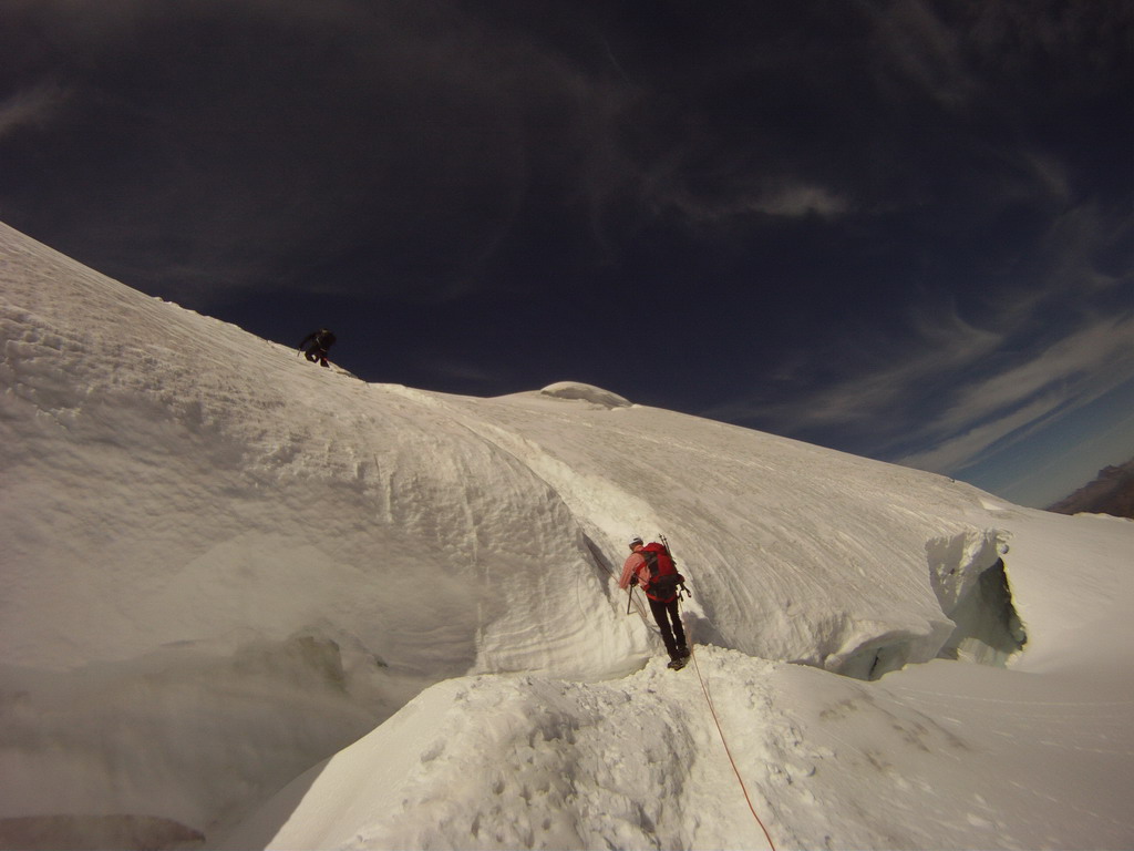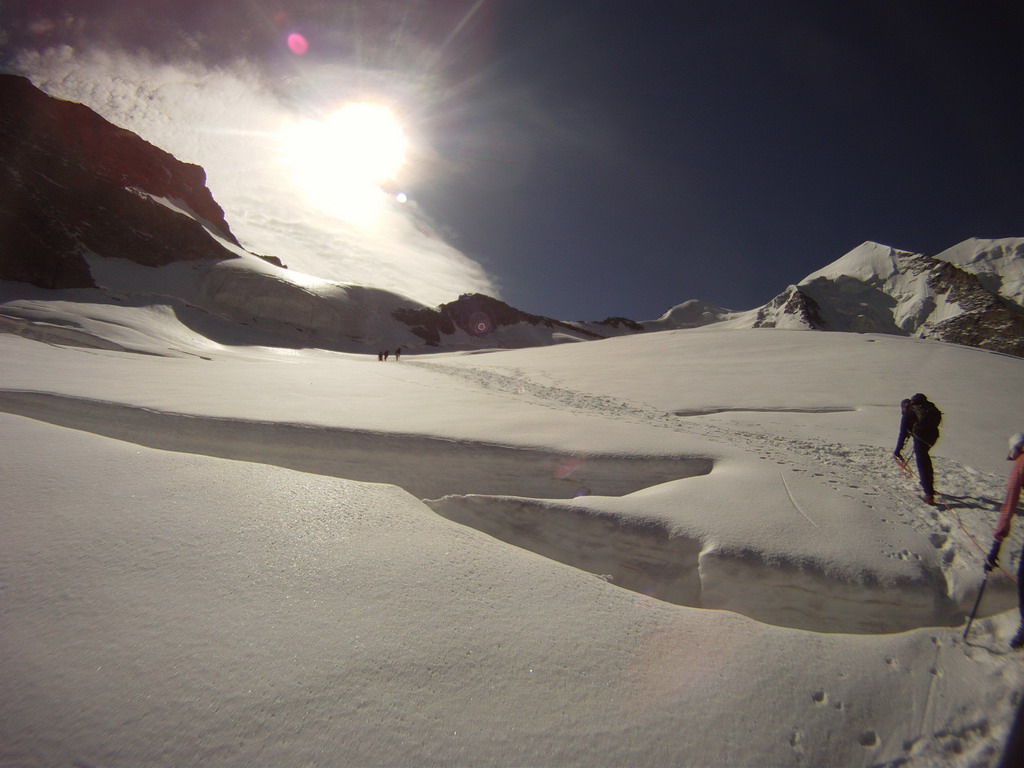 Tam sme sa naviazali a ďalej pokračovali po ľadovci. Začiatok je plochý, dlhý ľadovec, ktorý začne stúpať až asi po 20 minútach šliapania. Treba prejsť labyrintom medzier gigantických rozmerov a dostať sa do vrchnej časti, ktorá je už celistvejšia. Vo vrchnej časti je ešte jedna veľká medzera, prechod ktorou je riešený dreveným mostom (v lete). Odtiaľ je to už len kúsok k sedlu F. pers-palu, kde sa nechávajú v zime lyže a vystupuje sa prudkým svahom na hrebeň, smerujúci k východnému (pred)vrcholu Palu.