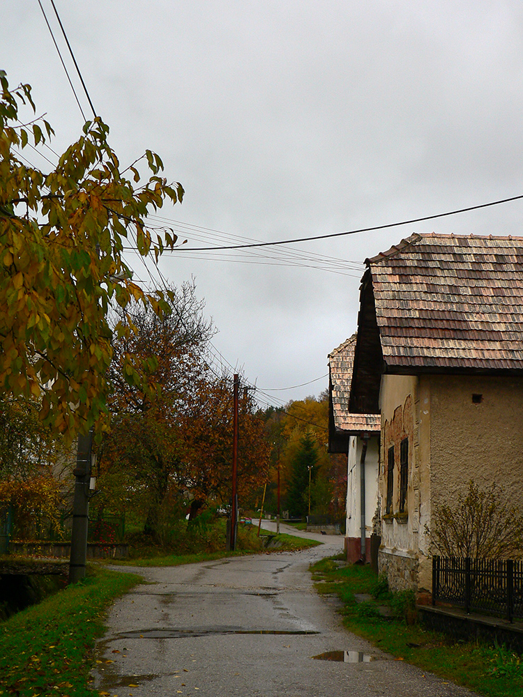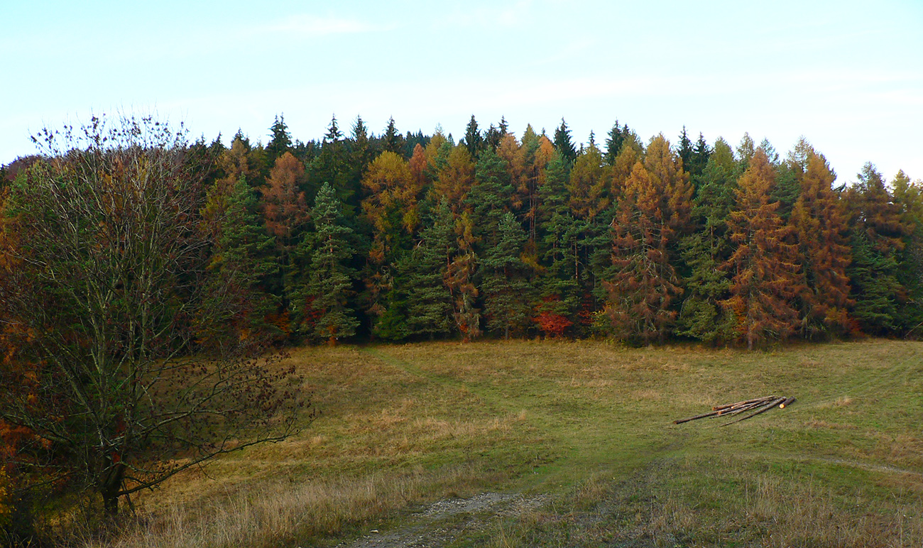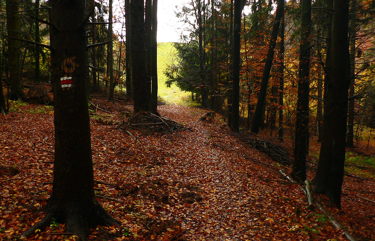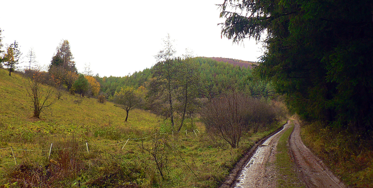 Nazad na červenú som sa dostal na tej istej lúke, na ktorú som ráno vyliezol z doliny. Ale tentokrát ma nelákala cesta nazad do Rudna po dne doliny (veľa mlák na ceste), skúsil som radšej po bočnom hrebeni, cez lúku, kde som ráno fotil tie jelenice. Cesta cez lúku (paralalná s tou dolinovou) bola OK, ale v lese rýchlo zanikla. Nevadilo, prerazil som lesom cez vrchol Vlčej (753 m), poplašil som posledné stádo, tento raz poriadne (aspoň 50 kusov), strmo som zbehol čerstvým rúbaniskom a vynoril som sa znovu na lúkach nad plechovým „družstevným senníkom“, kde som bol už dvakrát. A to už bolo do dediny na skok. Veď bolo aj načase - už sa začalo šeriť. No čo by som chcel, že? Zimný čas a krátko po štvrtej, posledný deň októbrový.