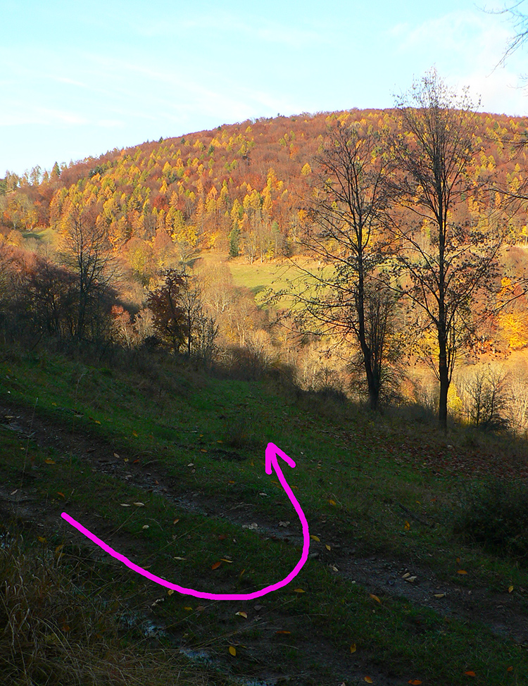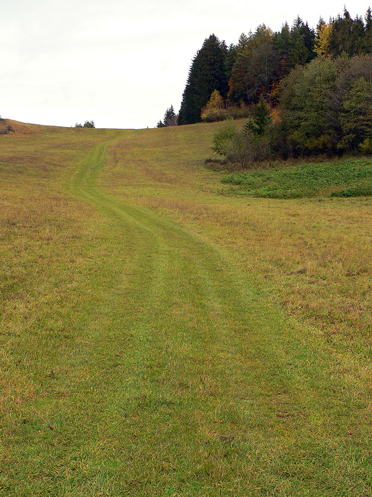 Najprv dlhá úzka lúka dolinou, potom ešte užší priechod pomedzi lesíky a rooooozľahlé lúky. Držiac sa okraja lesa pri ľavej ruke som to nasmeroval priamo na sever, na horizont. Cesta hore lúkami ma viedla jednoznačne. Z horizontu sa okrem tej mojej rozbieha ďalších päť ciest, ale to už som videl, ktorou sa mám spustiť nazad do doliny Rudnianskeho potoka a aj kade potom z doliny odbočiť do začiatku „severnej časti osmičky“. Takže bol čas na malý prieskum dvoch najlepšie vyzerajúcich ciest - doľava, do kopca: