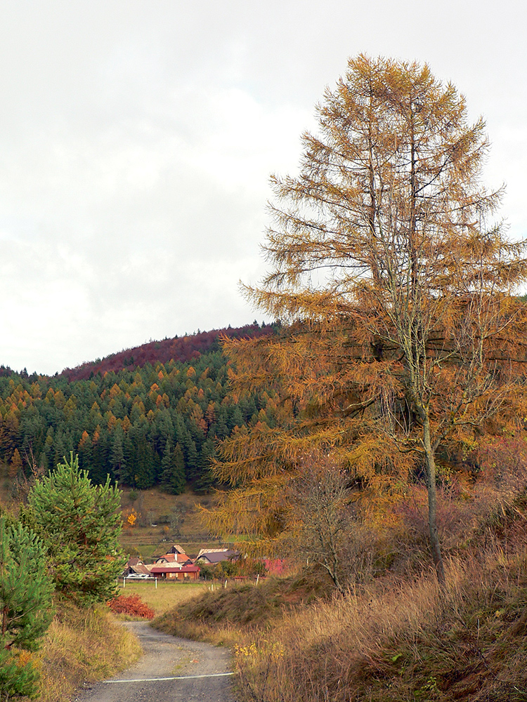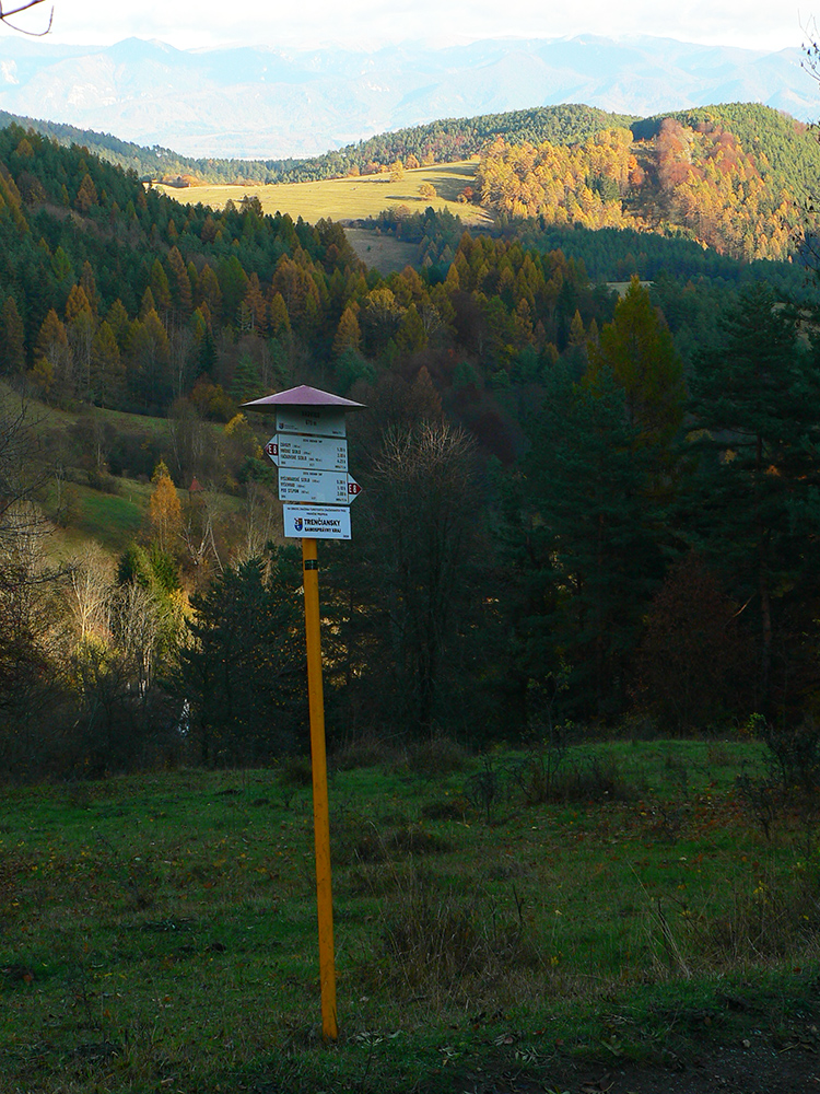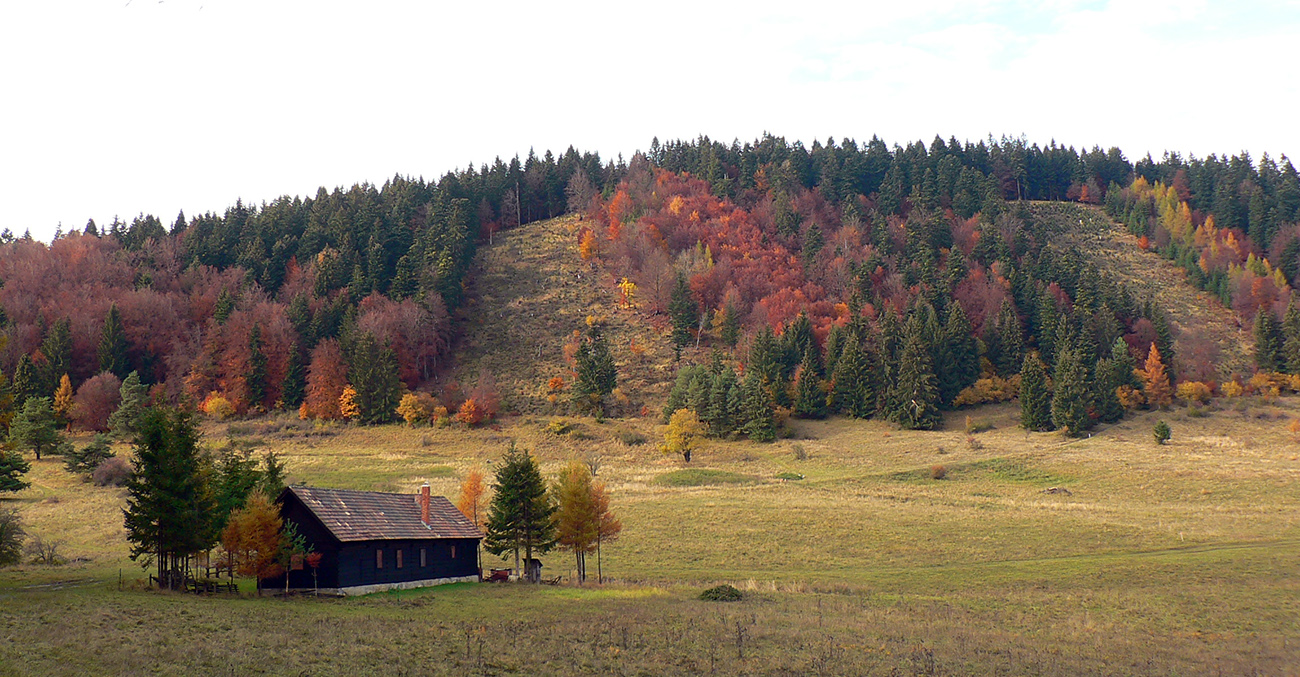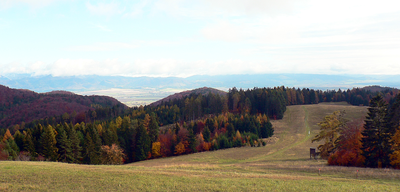 Vyšlo to tak, že jednou som šiel tam a druhou som sa vrátil. Tá viac vľavo ma doviedla ku starému ovocnému sadu, tá druhá je prístup k novej poľovníckej chate. Nooo, parádny výhľad si páni jágri zariadili. Ponad Rudno do kotliny, až k Veľkej Fatre. Nad ktorou sa inak už začala sivota trhať a modrá začala presvitať. Možno z tých jesenných farieb dnes predsa len niečo bude...