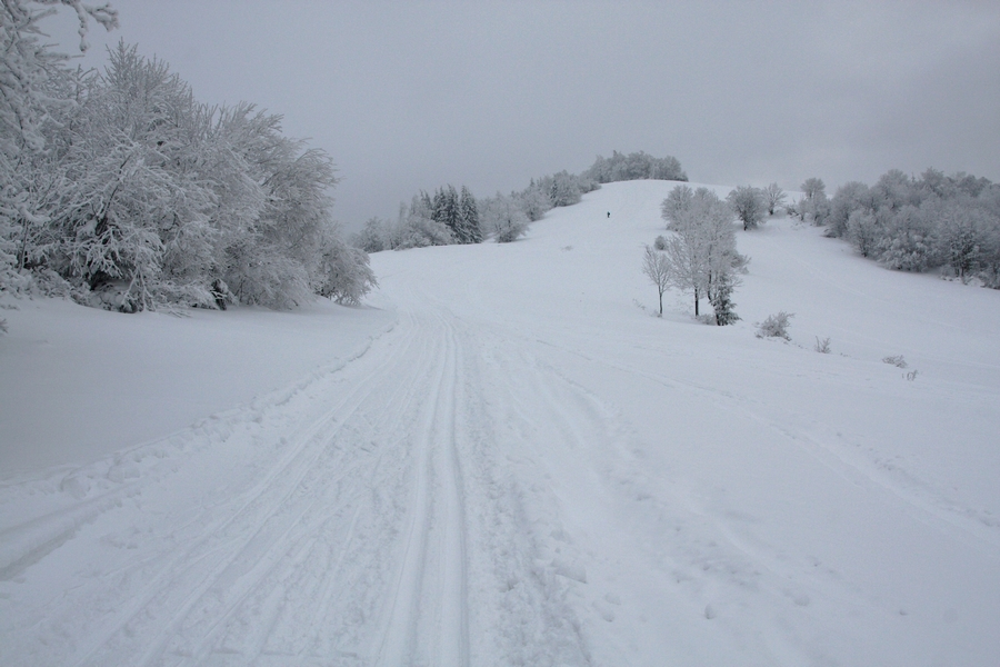 4. V sedle pod Grapou (nad osadou Mračkov) sa strojová stopa trochu odkláňa po modrej značke, lebo červená je pre ratrak nepriechodná. Ale prešliapané je aj tam.