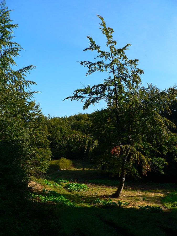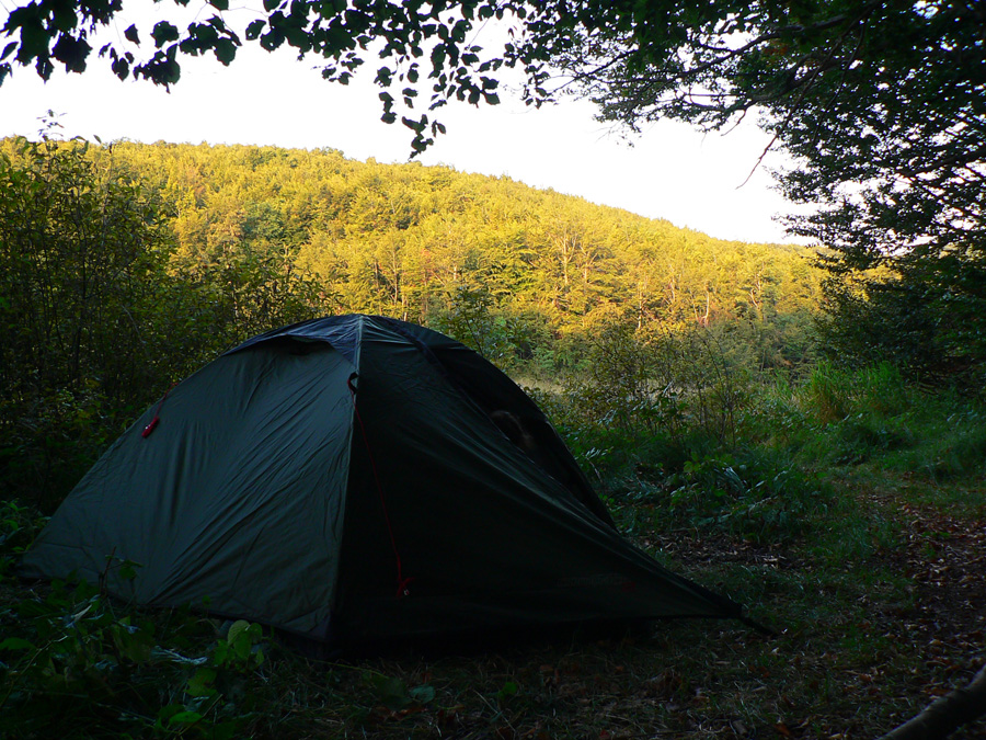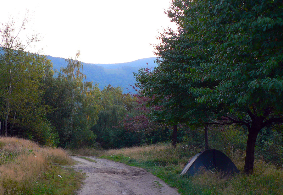 Po širokej lesnej ceste, popri tabuliach náučného chodníka, o nejakých 20 minút vychádzame na rozľahlé lúky nad vysťahovanou dedinou Ruské. Cestu tu lemujú ovocné stromy - hurá, aj tu sa najeme! A pod jedným dosť košatým rozkladáme stan, a zas „milion stars hotel“ a ticho večera len so šumením vetra. Myši pod nami šuchocú, ale len kým si na nás zvyknú :-)