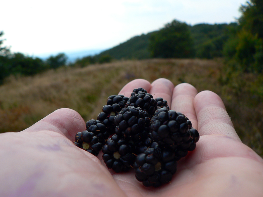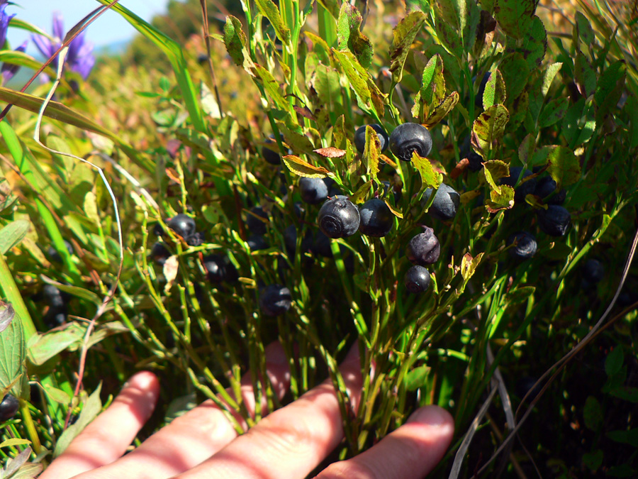 Nižšie v sedle je smerovka k prameňu pod svahom, ale ten je beznádejne suchý. Ten nasledujúci pod Pľašou už ani nejdeme obzrieť. Pľaša je posledný holý vršok s kruhovým výhľadom, potom až na Kruhliak je to prevažne lesom. A klesáme, takže aj keď sa nejaká tá lúka naskytne, stromy už sú vysoké, do diaľok nevidno. Satisfakciou sú černice, ktoré nahrádzajú vyššie rastúce čučoriedky. V dobrom čase sme sem prišli :-)