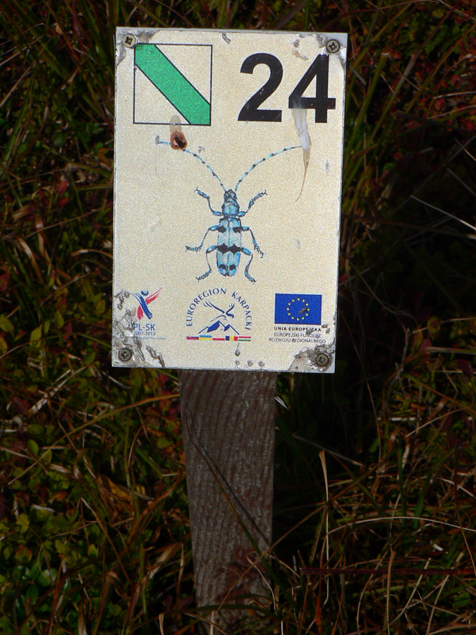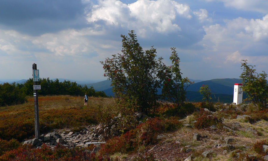Tam sa najprv pokocháme novou a vyleštenou vyhliadkovou plošinou aj s panoramatickou mapou (na našej strane). Je nad strmým skalným zrázom, ktorý je v tomto „guľatom“ kraji dosť veľká rarita. Na vrcholových čučoriedkových poliach si nejaký chlapík trúfa oberať hrebeňom a podľa vybavenia sem na túru neprišiel - no, možno majú u susedov iné predpisy... Poliakov teraz dosť pribúda (už si to môžu zdola pekne zokruhovať), len sa divíme, že sú skoro všetci totálne naľahko. Niektorí nesú najviac tak mobil a okuliare :-)