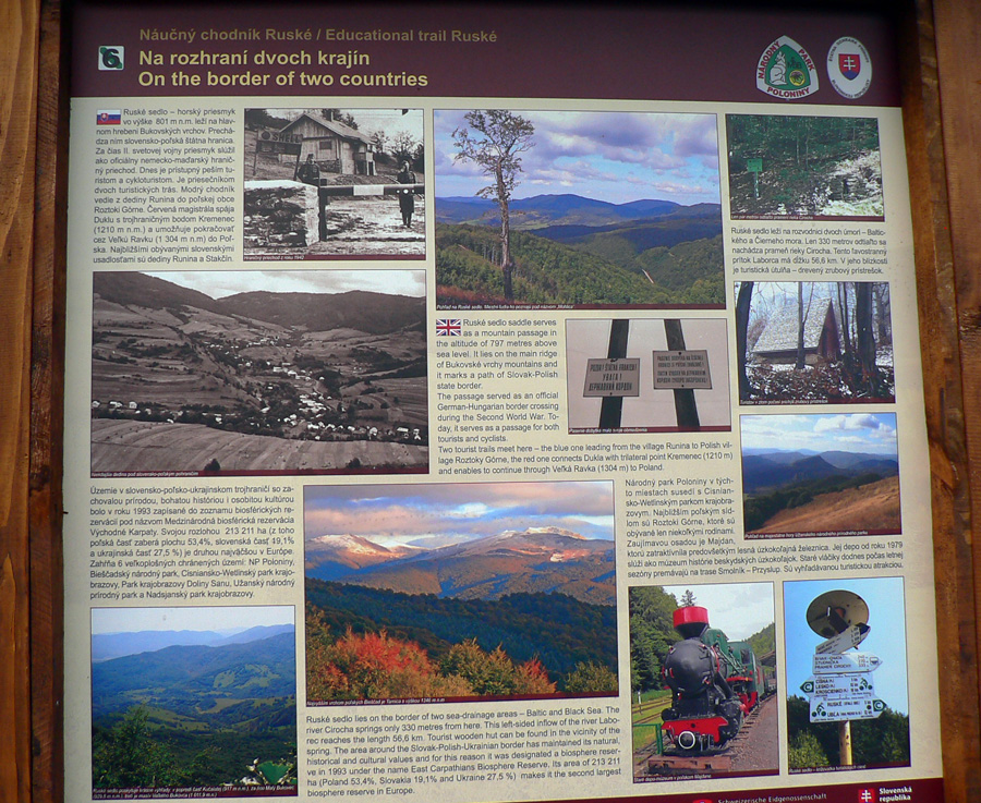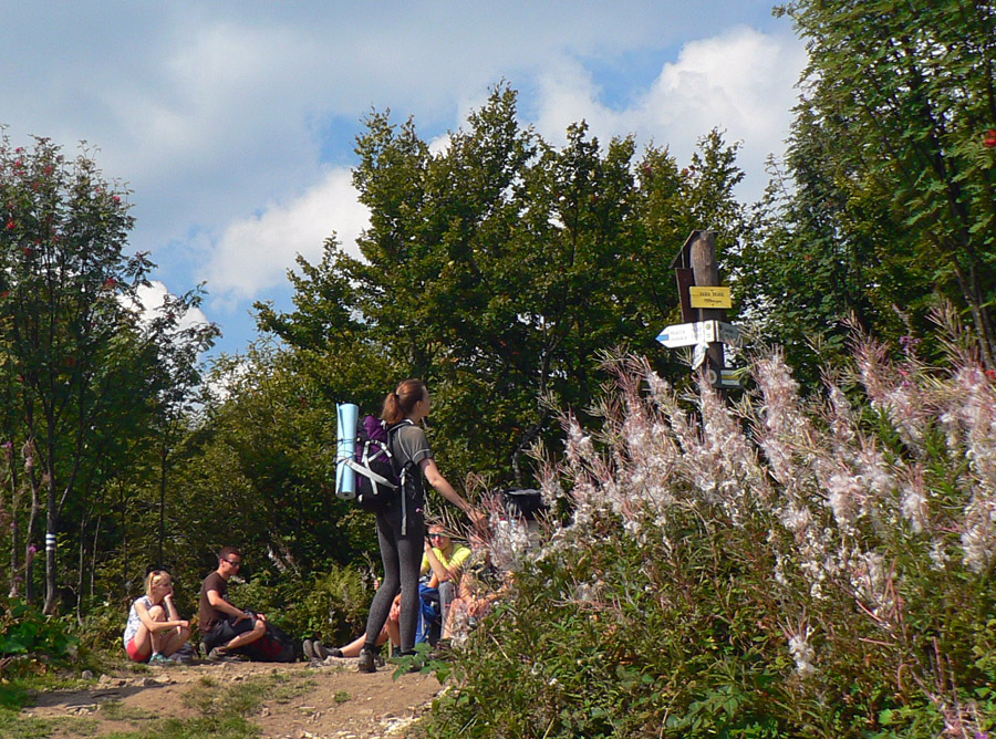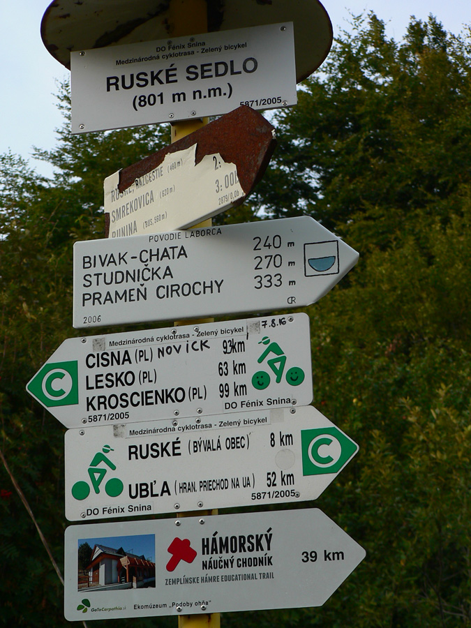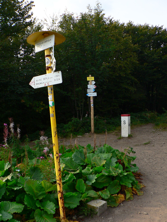 Ruské sedlo, voľakedy cestný hraničný prechod, podľa starých fotiek sa tu dokonca dalo dotankovať palivo do auta :-) Tabúľ, smerovníkov a značiek je tu neúrekom, ale my ideme obzrieť, kde to chceme spať. Kúsok od hranice, na našej strane, rovnaká útulňa ako pod Čierťažou. A rovnako obsadená hulákajúcou partiou pripitých Poliakov. Tak vďaka... Na stan tu ani nie je nikde dosť miesta, tak len sa opláchneme v prameni a dotankujeme v ňom „palivo“ aj my, a ideme hľadať nocľah nižšie.