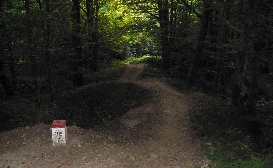 Na Kruhliak sa štveráme strmým svahom, aby sme ešte strmším z neho začali zostupovať do Ruského sedla. Cestou dole je jedna lúka s pekným výhľadom na odlesnenú pramennú kotlinku Cirochy, kam smerujeme. Potom už strmý zostup po hranici, ktorá tu bola asi voľakedy ostro strážená. Usudzujeme tak podľa podivných tvarov povrchu - valov a jám všade okolo.