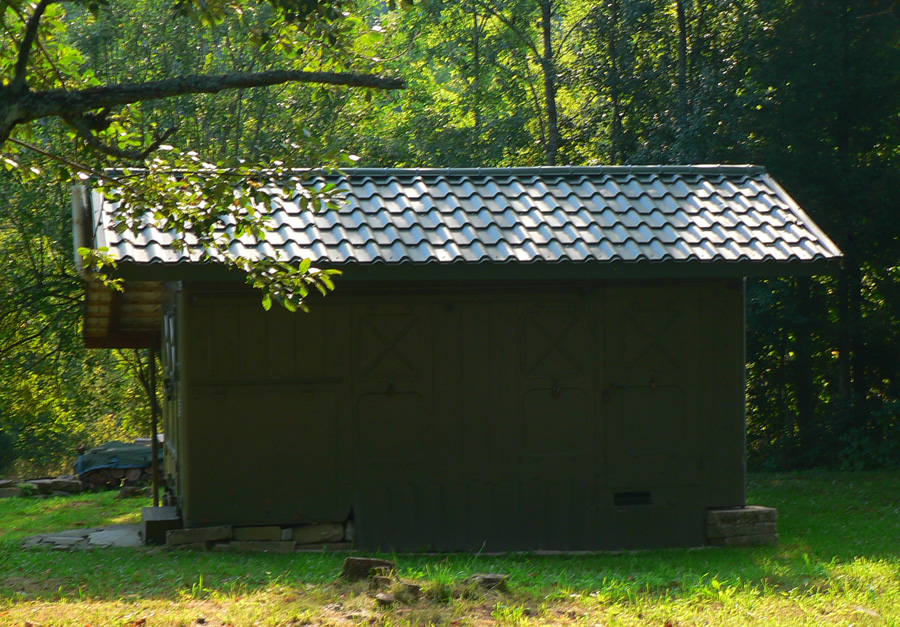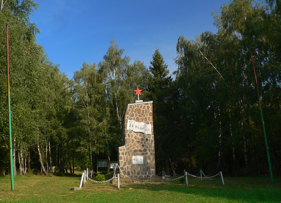 Prechádzame okolo pamätníka obetiam vojny, otvára sa výhľad k bývalej dedine. O chvíľu sme dole na spodku serpentín a pešujeme dlhou rovinou dnom doliny. Všade v okolí stoja namiesto zbúraných domov plechové „skrine z vetriesok“ - ale žiadne vraky! Všetky vypipľané, niektoré od chatiek nerozoznať. Upravené trávniky, ploty, kvety na hriadkach, proste chalupársky raj, žiadna zarastajúca divočina.