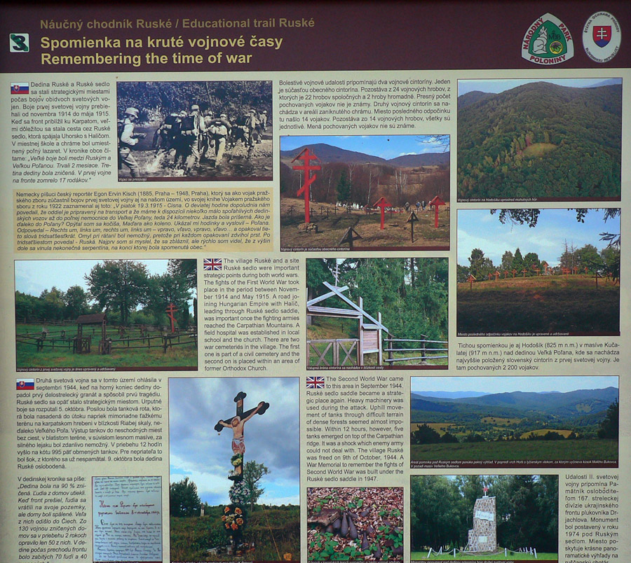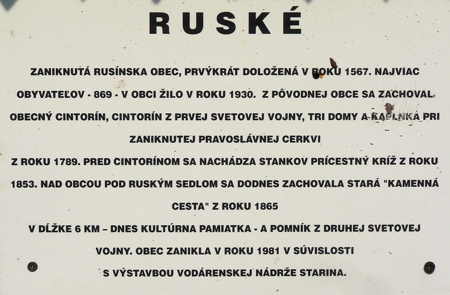 Do Ruského schádzame krížom cez serpentíny starej cesty, len škoda, že náučný chodník kopíruje práve tie serpentíny. K niektorým infotabuliam to máme ďalej a zachádzať sa nejako nechce. Isto sú na nich zaujímavé veci popísané. Cestu lemujú staré ovocné stromy aj hrdzavé kilometrovníky.