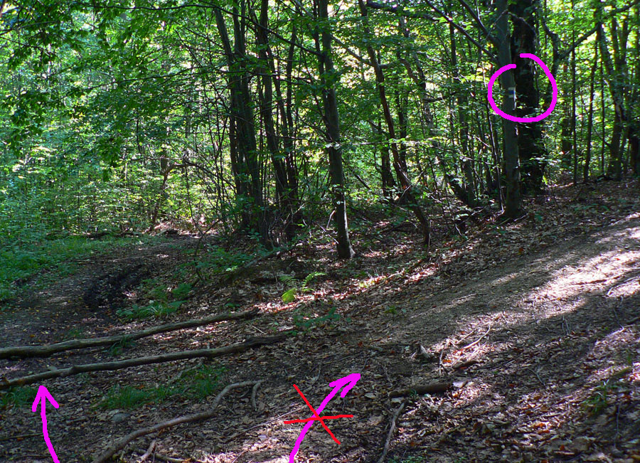 Za ňou mierne stúpame pohodlnou lesnou cestou (černice zrejú!). Treba sa jej držať, lebo na jednom mieste modrá značka zvádza odbočiť doprava (tak zle je nakreslená), ale je to pasca, pozor! Za odbočkou značiek niet.