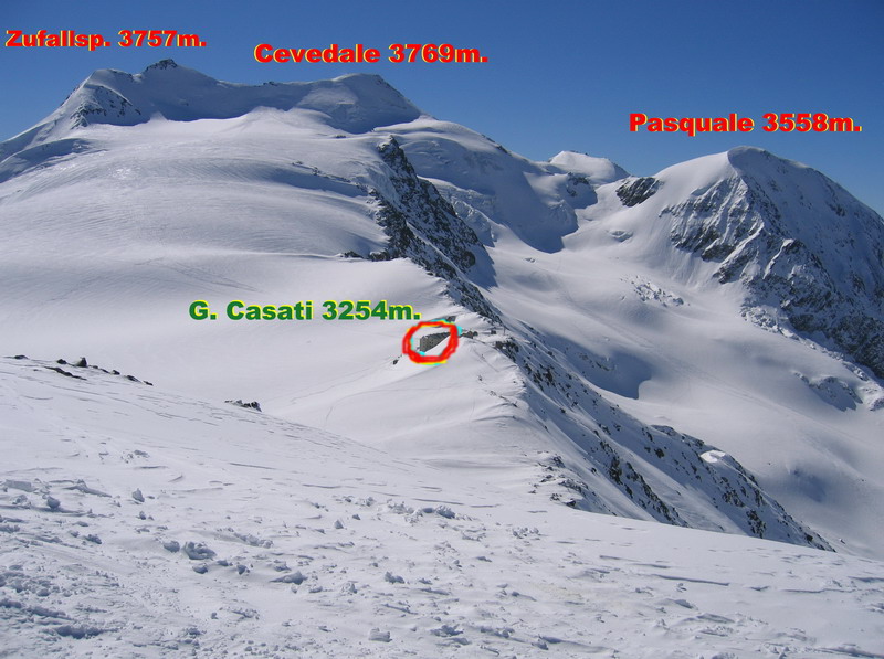 Chata Casati sa nachádza v Ortlerských Alpách. Nájdete ju priamo na polceste medzi vrcholmi Cevedale a Königspitze v sedle Langfernerjoch (3266), ktoré sa často nazýva aj Cevedalepass. Chata leží na okraji ľadovcového plata po ktorom vedie klasická výstupová trasa na Cevedale a Zufallspitzen. Sú odtiaľto nádherné výhľady na Königspitze a množstvo ďalších vrcholov.Kuriózna a atraktívna nie je len jej poloha, ale aj veľkosť (230 lôžok) a nadmorská výška 3254 metrov nad morom. Chata bola postavená a otvorená v roku 1923 ako náhrada za cez vojnu zničenú Halleschen hütte v neďalekom sedle Eisseepass. V roku 1934 bola postavená nad chatou ďalšia menšia budova, ktorá nesie meno Alexandro Guasti. Táto dnes slúži ako winterraum. Ten je v čase, keď je Casati zatvorená stále otvorený a prístupný. V čase mojej návštevy boli sprístupnené dve spálne s poschodovými posteľami (cca 12 lôžok) a jedna spoločenská izba. Vo winterraume je zakázané kúriť a zakladať otvorený oheň a tak prípadným záujemcom o návštevu v zimnom období odporúčam teplý spacák. V tejto nadmorskej výške moc teplo nebude. K dispozícii tu sú postaršie deky. (foto)