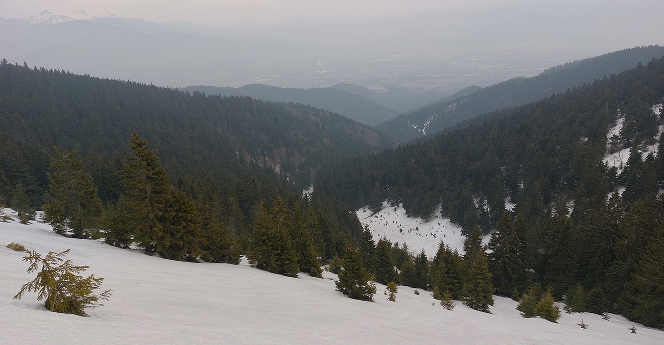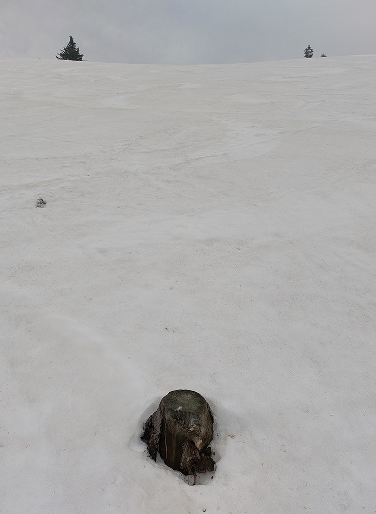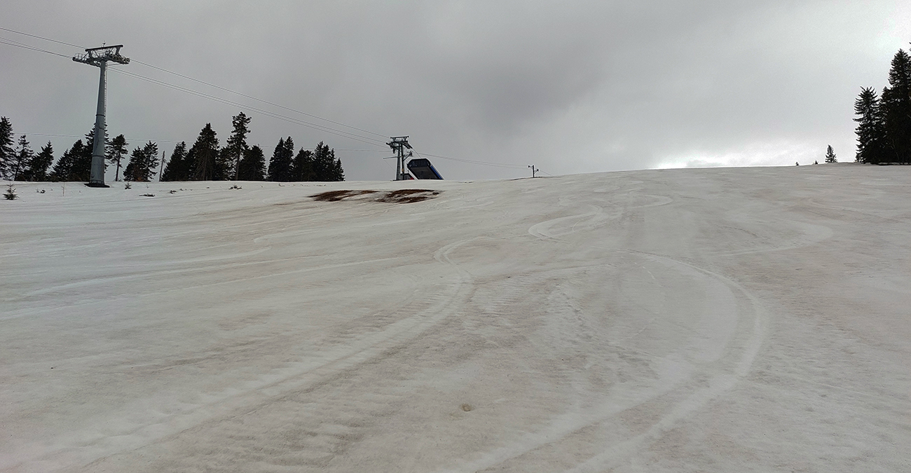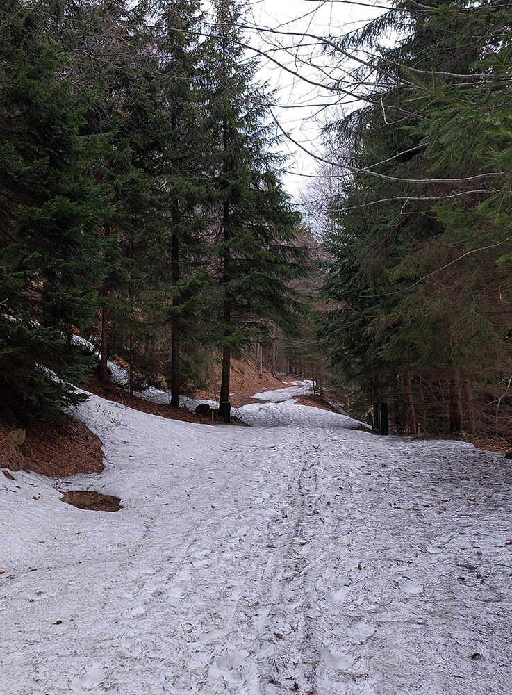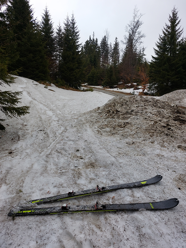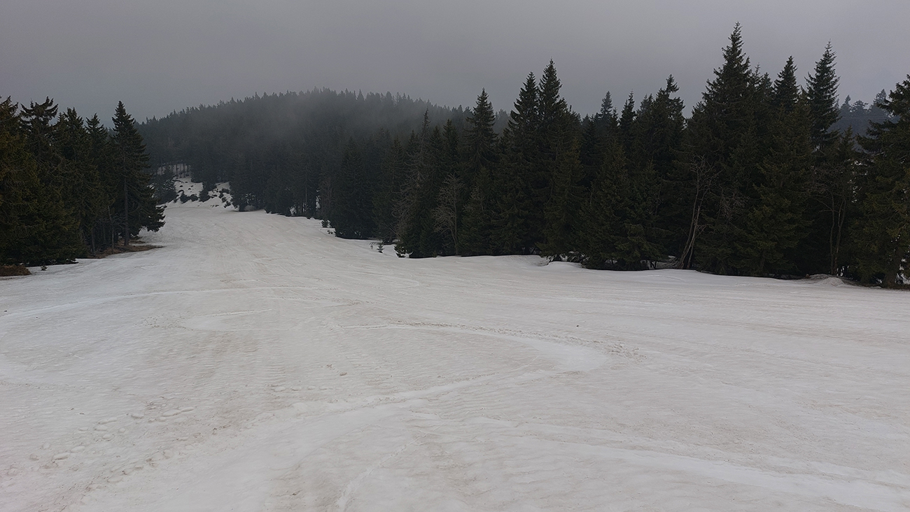Bol istý zámer posunúť sa ešte viac na sever, na Priekopské hole, ktoré zdola vyzerajú stále krásne, ale hrebeň už je do sucha vytopený, skoro pre bajk. A v lese by chlpatý sneh asi dosť brzdil. A ešte začalo aj pršať, ohlasovaný front sa blížil. Ako inak, veď prvý voľný deň po slnečných pracovných... Tak hybaj nazad. Ešte raz ma stiahla Stará slalomka a ešte komfortnejší výstup z nej bol, lebo po vlastnej stope. Potom už rýchlo dole po piste, lebo lejak.
