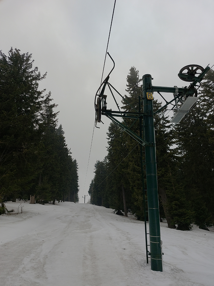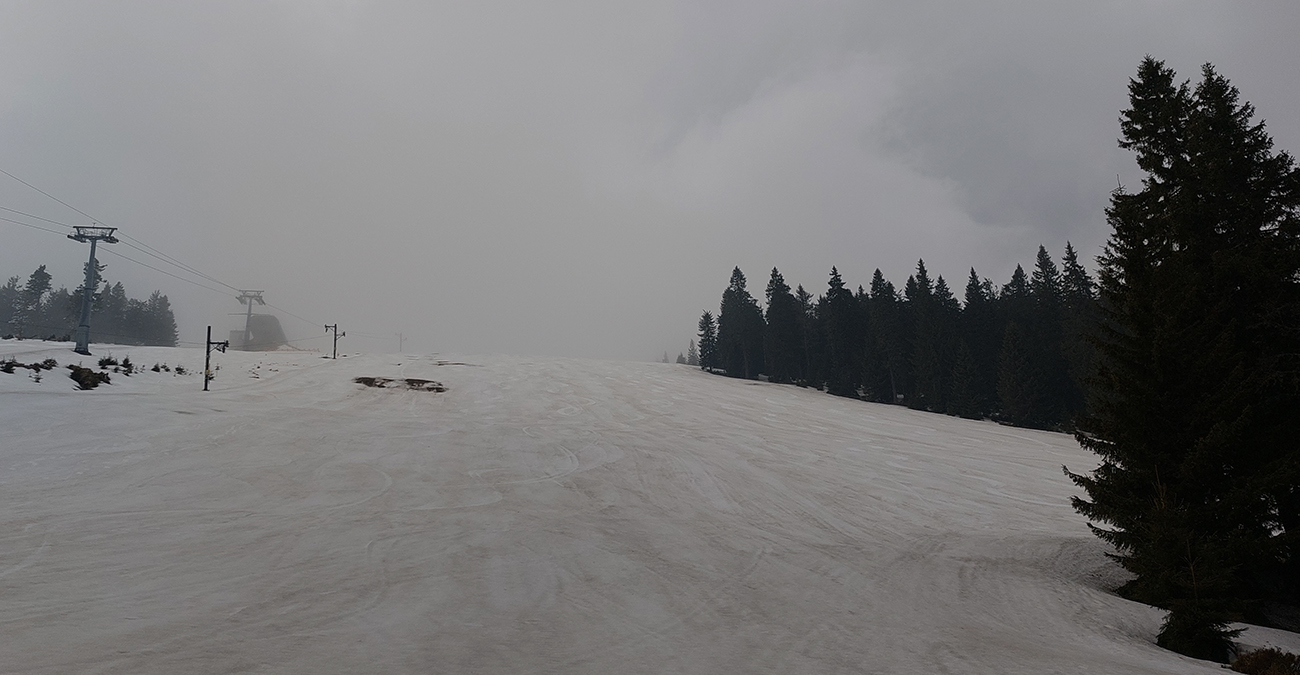 Dole pri sedačke že báj báj sezóna, ale zrazu sa nejako mraky dvihli, aj chčať prestalo... No odolaj, keď sa tak dobre lyžuje. Taaak doooobre, ešte pár výšľapov aspoň hore k rotunde, lebo faaaakt dobrá lyžovačka, najmä po Jednotke a Céčku. Aspoň na mne handry uschli. Aj na juh, na Veľkú lúku by sa dalo potiahnuť, ale nie od rotundy, tam je to vytopené tiež do sucha. Nakoniec ma zase dážď zahnal, ale už definitívne, lebo už aj srnčie bobky začali dole svahmi stekať.