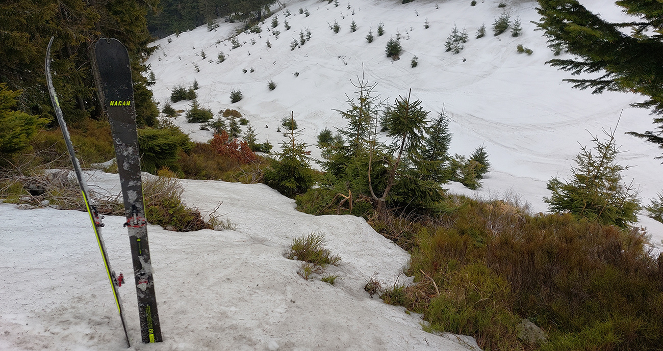 Z jamy hurá hore a viac doprava, na sever, na susednú „prírodnú zjazdovku“ pod Zázrivou (Šíravami). No tam už je to horšie. Lebo na juh otočená časť svahu je vytopená, to bolo vidieť už z protisvahu. Spodok zase hustejšie zarastený a dole k potoku som sa cez jafury ani nedostal. Ani ma tam neťahalo, nižšie v lese už musel byť poriadny bordel. Zase chlpatý sneh odtiaľ potiaľ... Zato zhora lyžovačka tiež parádna a výstup nazad komfort - aj v strmom. Firn držal.