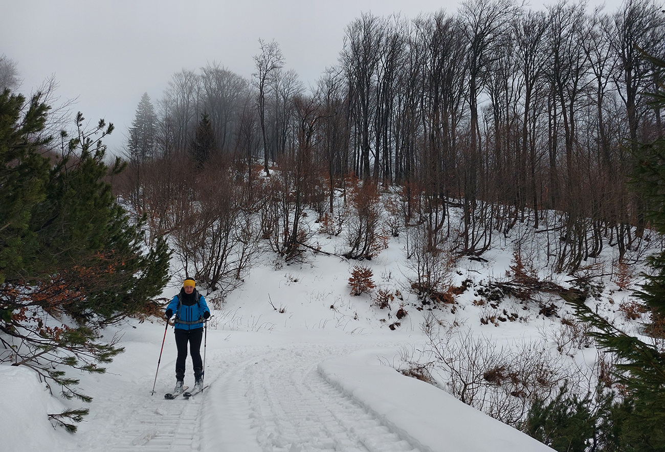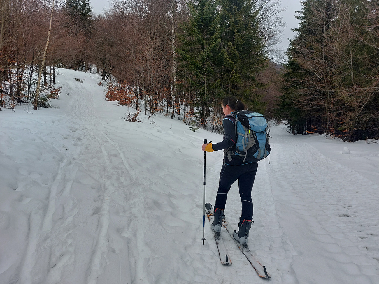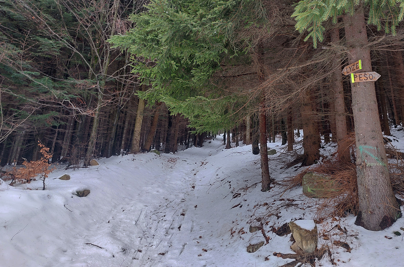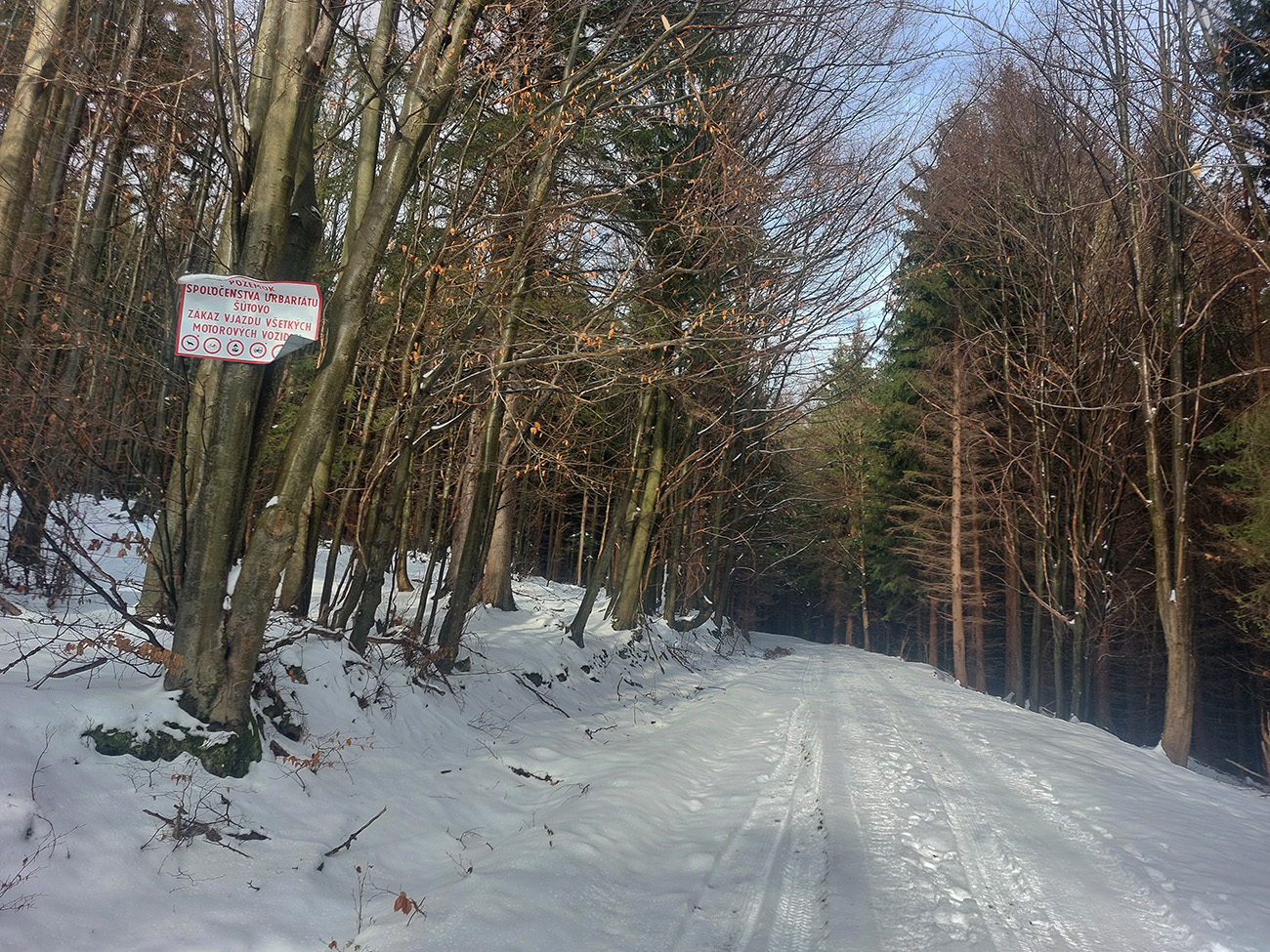 Jeden exemplár pred nami išiel z drevoskladu doľava, strmo po skialpovom chodníku, a potom hore hovoril, že na tom lístí to ani moc nepodklzovalo. My lenivší sme sa vybrali rovno po ceste, kde koľaje od áut, zásobujúcich chatu, vyzerali použiteľne. Väčšinou aj boli, no...