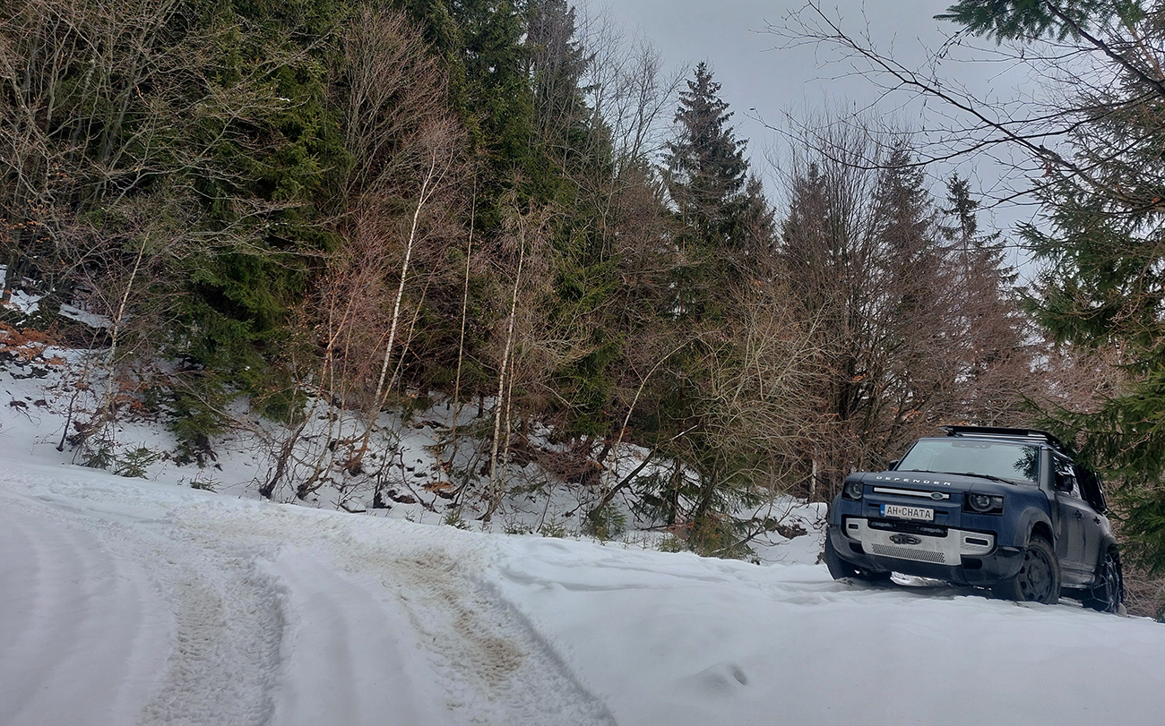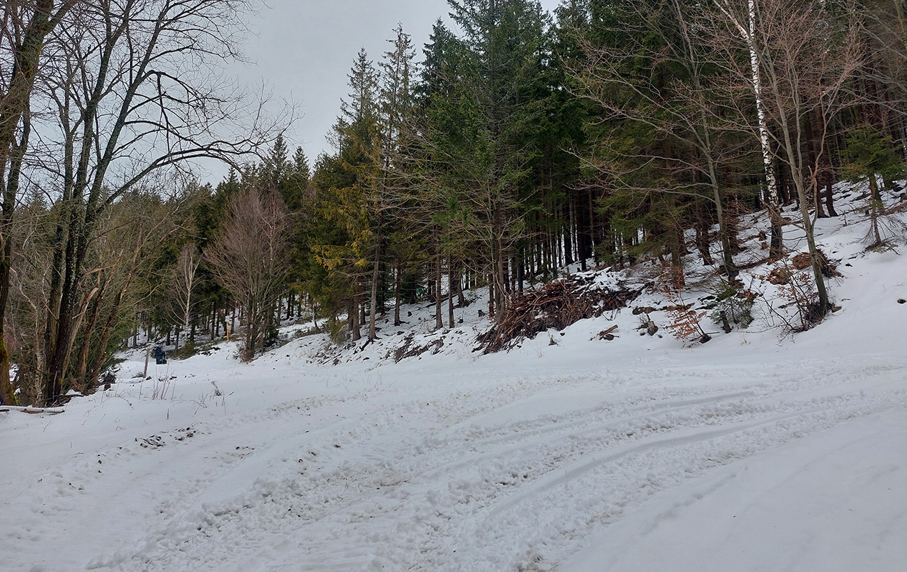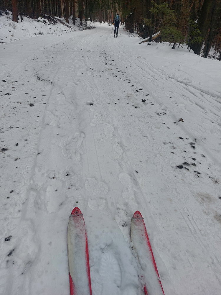 Lenže ako sme stúpali, nieže by bolo menej snehu, ale akosi pribúdalo kameňov. Na lúke nad dedinou ešte pohoda, krtince skryté, ale na ceste z Trusalovej nejaký moc bodkovaný podklad a ešte horšie to bolo medzi Zajacovou a zákrutou. Ale sme sa zaťali, že neprenášame, veď kameňačky znesú a do kopca to predsa nevadí. Nad zákrutou (po drevosklad) ešte väčšie zúfalstvo, ale to lístie vo svahu vedľa cesty bolo našťastie dosť jemné voči pásom.