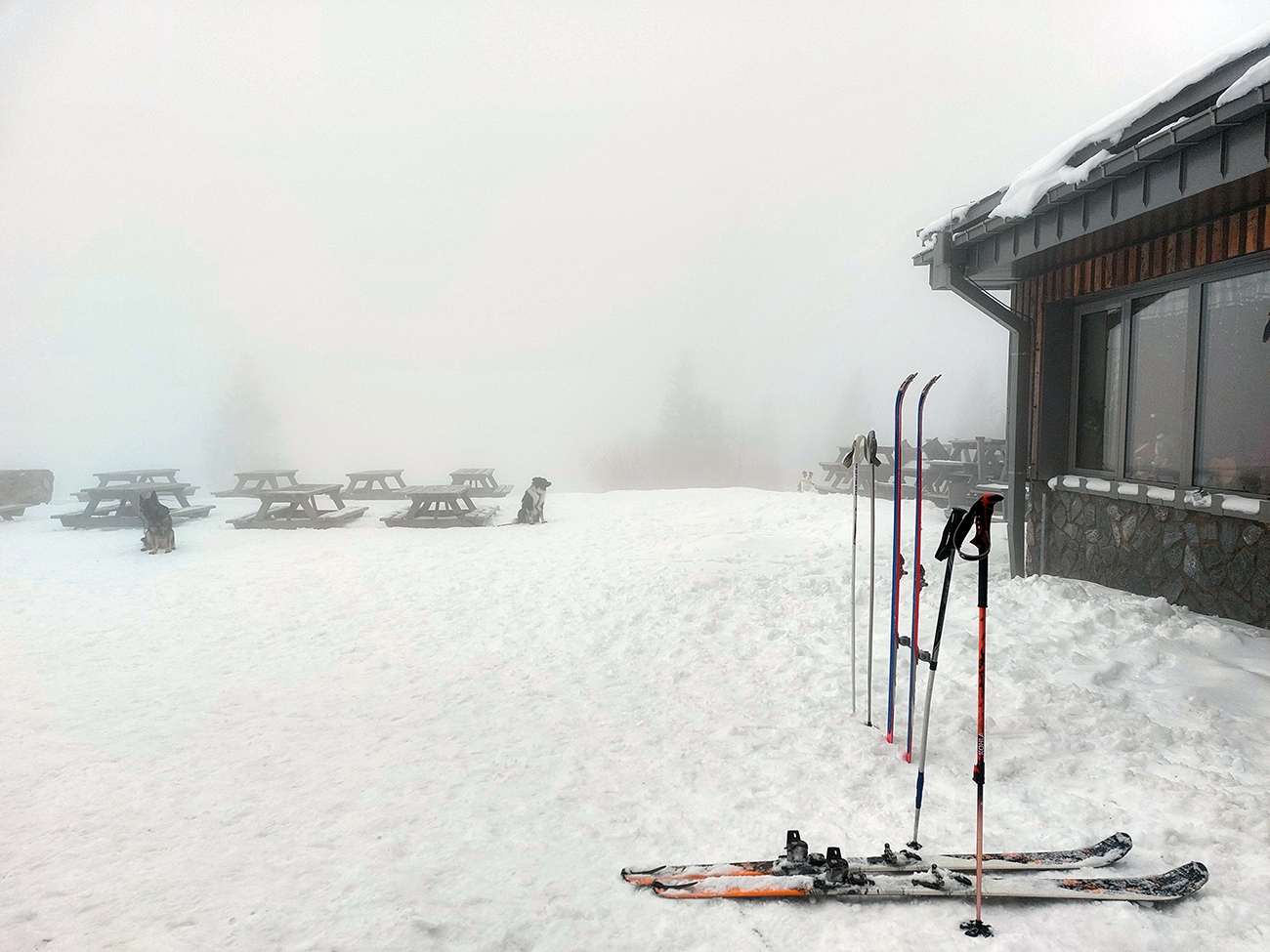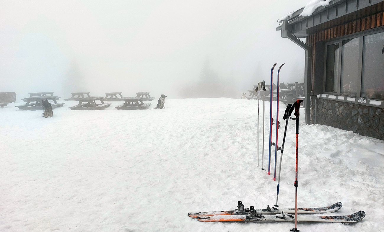 Len miernejšie sklonený záver pod chatou bol konečne vysnežený celý (Alebo to tá hmla?) a hore pred chatou netypicky odložených viac psov ako lyží (dva páry, naše). Prečo ale tie divné pohľady z vnútra chaty, keď sme odliepali pásy?