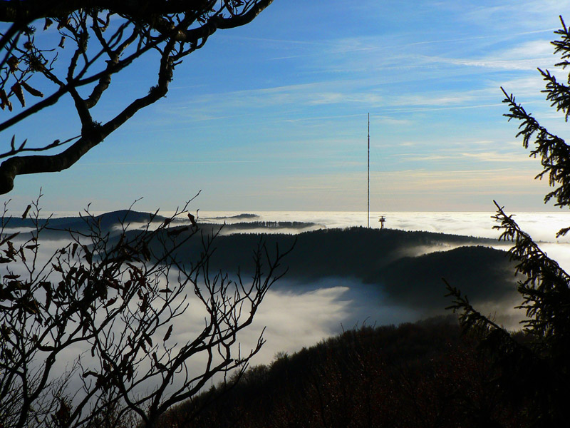 Aj je, na lesných cestách medzi Flochovou a Vyhnátovou si vychutnávam hru svetla s hmlou pomedzi stromy. Niekde zbehnem do hmly, niekde sa dostávam nad ňu a podľa toho poriadne skáče aj teplota. Na Vyhnátovej som síce vyššie, ale musím na strom, aby som mal výhľad na Skalku. Oplatí sa: na kremnickej strane sú mraky trochu vyššie a celé sa to cez sedlá prelieva na stranu bystrickú. Z južnej časti hrebeňa trčia len ostrovy, čím viac na juh, tým menšie. Krása, ani sa mi dolu nechce.