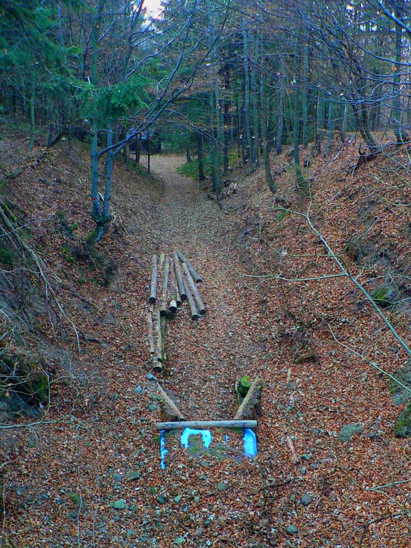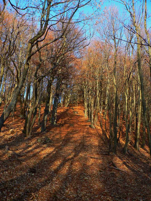Paralelne s asfaltkou šliapem po (žlto značenej) lesnej ceste do sedla Malý Šturec. Tam tiež nič, nad hlavou furt bielo, okolo len omrznuté stromy – znak toho že sa mraky v noci dvihli. Ale čo už teraz - pokračujem po červenej. Tento nástup na hrebeňovku nie je bohvieako využívaný, zo stanice sa viac chodí po modrej priamo na Flochovú. Aj preto že žltá, ktorou som do sedla prišiel, donedávna ešte nebola. Chodník medzi sedlami Šturec a Turecká cesta aj tak vyzerá – poriadne zarastený na viacerých miestach. Pri predieraní mladinou otriasam hrubú námrazu a o chvíľu už som aj ja riadne zasrienený. Ešte že je to suché... Na tomto úseku sa striedajú krátke a strmé stúpania a klesania, nepríjemné v tejto ročnej dobe mohutnou vrstvou bukového lístia, pod ktorou je ktovie čo. Aj hlina je mrazom dobre skyprená, prepadá sa a šmýka sa na nej. Na prvom úseku sú aké – také výhľady na asfaltku a do Zalámanej doliny, potom už len les.