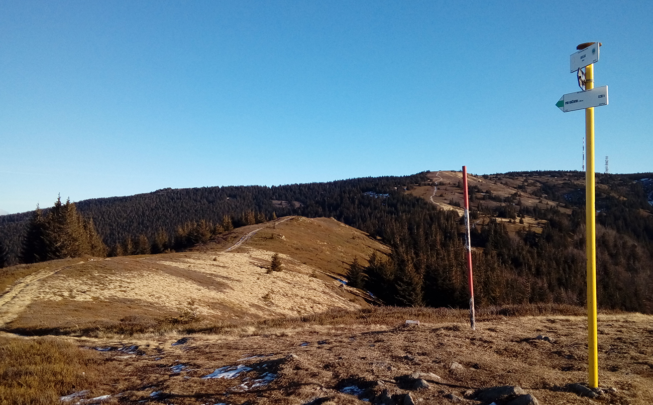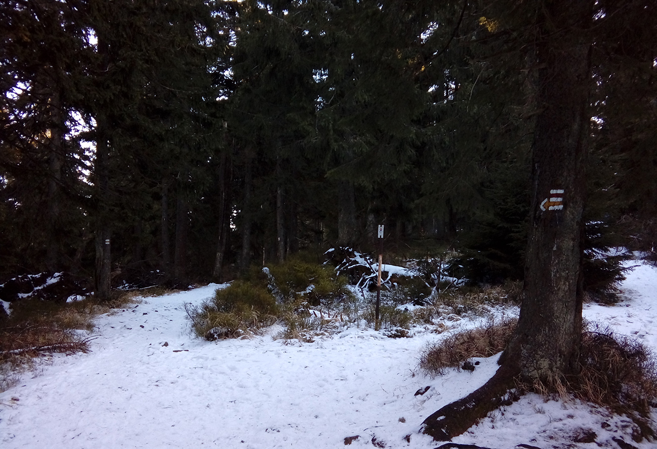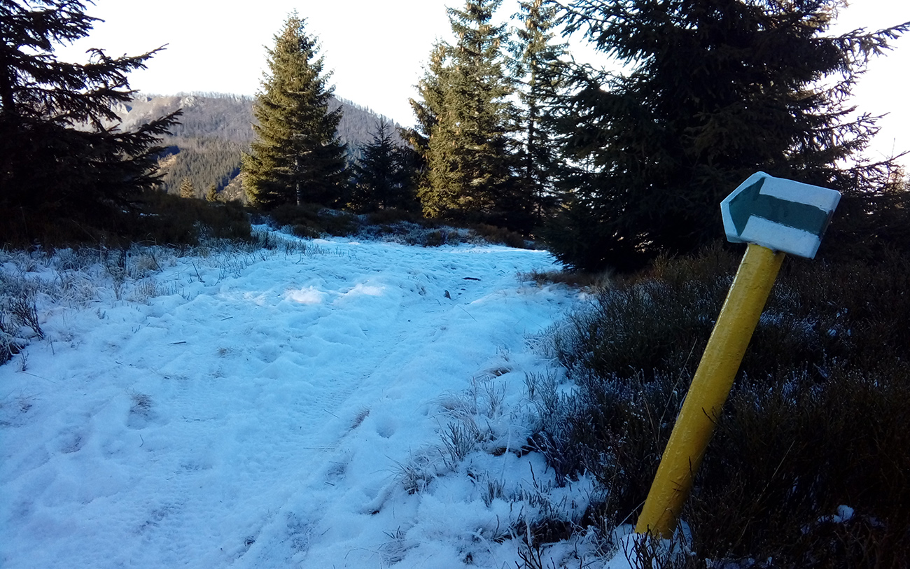 Na Skalku k smerovníku je to len na skok (oficiálne tuším 30 minút) a samozrejme prevažne z kopca. Vpredu dominujú výrazné bralá NPR Kozol – ale to je cenné územie, treba ho pozorovať len z odstupu. Potom už čoraz prudší a čoraz lesnatejší zostup do sedla Kobylie. V záverečných stovkách metrov aj mierne zahádzaný konármi, čo sem vietor poukladal. Zhruba v polovici klesania lúka na malej plošine - tam sa chodník rozdvojuje. Zelená doľava, vrátim sa ale sprava.